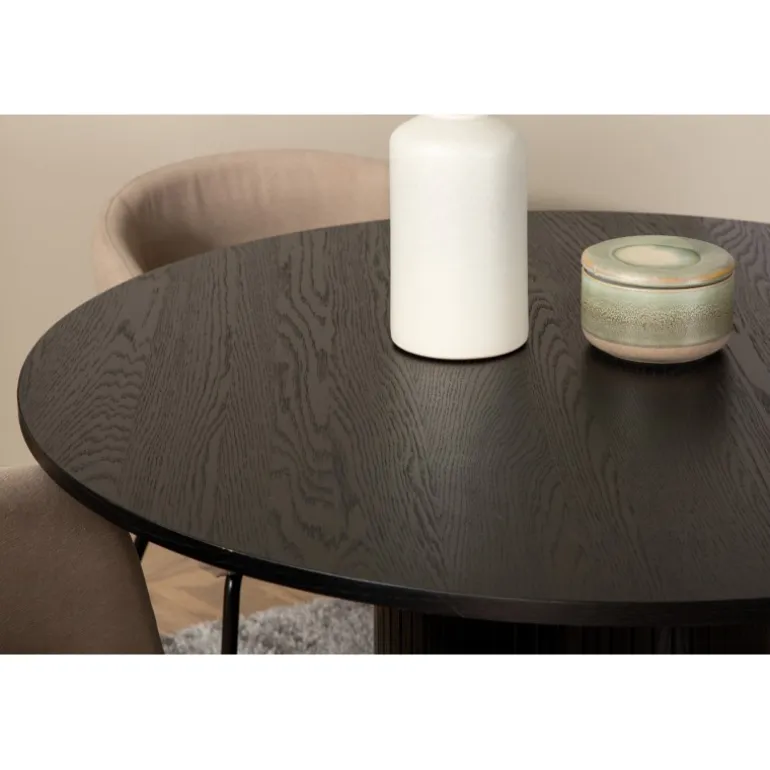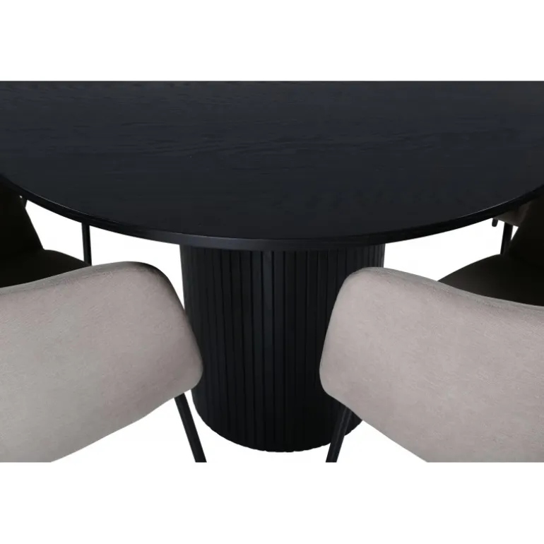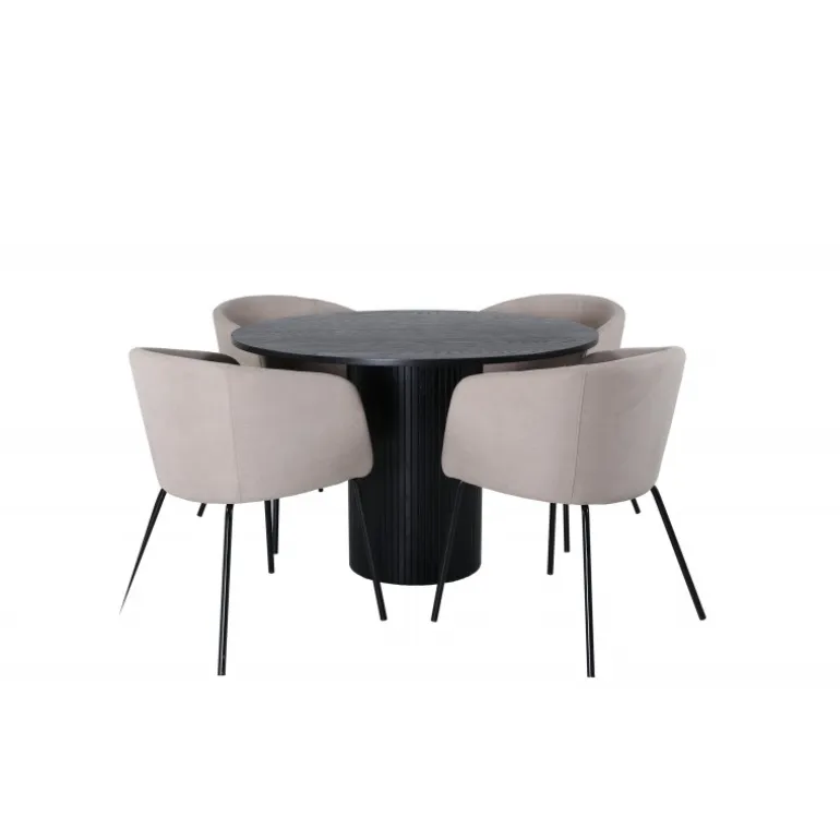 Indret din stue charmerende og indbydende med et rundt Spisebordssæt! Med vores runde spisebord Bianca skaber du en vidunderlig fællesskabsfølelse, hvor ingen risikerer at sidde på kanten. Bordpladen er lavet af MDF og har en cylinderformet ramme i robust design og ribbet udformning. Den gennemgående sorte farve er både tidløs og stilfuld og nem at matche med anden indretning. Bordets diameter: 110 cm, højde: 74 cm. Kombineres godt med 4 Berit spisebordsstole i luksuriøst design. Sædet er pompøst i beige polyester linned, og stolens ben er slanke i sort jern. Stolens dimensioner: Højde: 78 cm, sædehøjde: 49 cm, bredde: 55 cm, dybde: 55 cm.