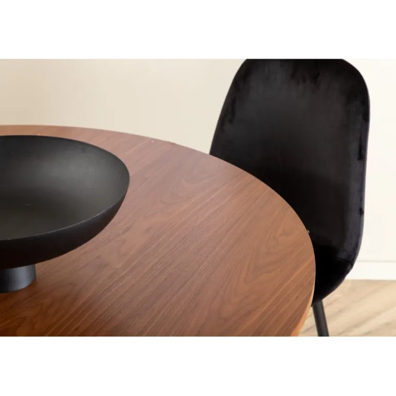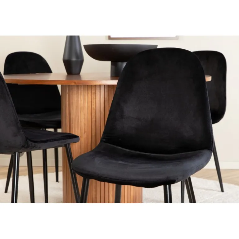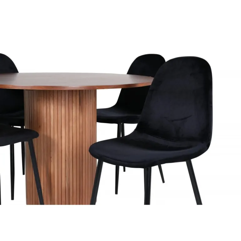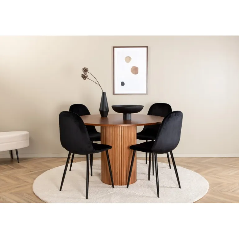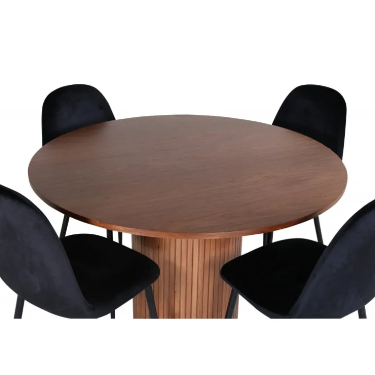 Skab et blikfang, der imponerer med en komfortabel Spisebordssæt i moderne stil! Vores runde spisebord Bianca i trendy valnøddefarver passer perfekt både i stuen og det rummelige køkken. Bordpladen er i valnøddefarvet MDF med finer, og stellet er solidt med træ og MDF i et riflet design. Her sammen med vores populære spisebordsstole Polar. Stolene har sæde i sort fløjl, som giver en dristig glans til rummet, og stolbenene er let udfladede i metal. Inviter til hyggelige måltider!