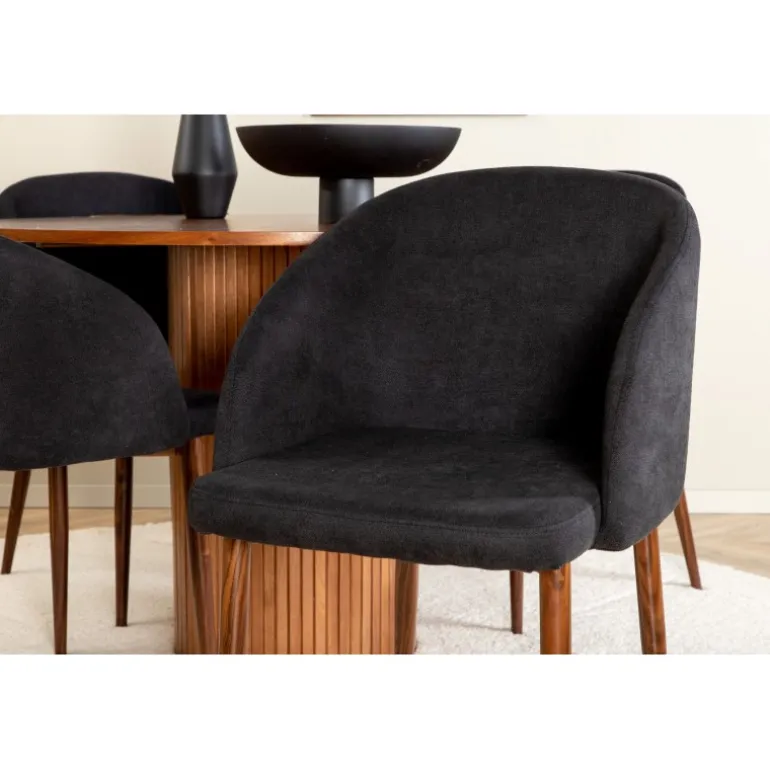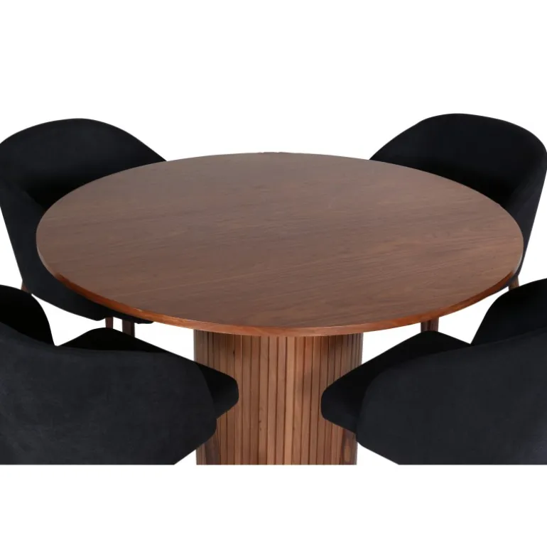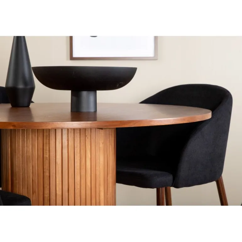 Forbedr interiøret i stuen og inviter til mange hyggelige måltider omkring vores lækre spisebord Bianca! Det runde spisebord har et trendsikkert design og en smagfuld bordplade i valnøddefarvet MDF med finer. Selve bordet er cylindrisk i et robust design af træ og MDF i et ribbet design, der giver et stabilt indtryk. Matchet her med 4 af vores lækre spisestole Arch med valnøddefarvet metalramme og sorte sæder i polyester. Et spisebordssæt, der passer perfekt til alle, ganske enkelt!