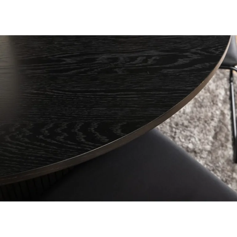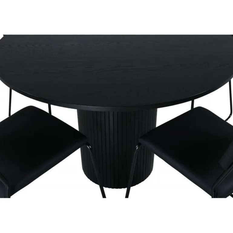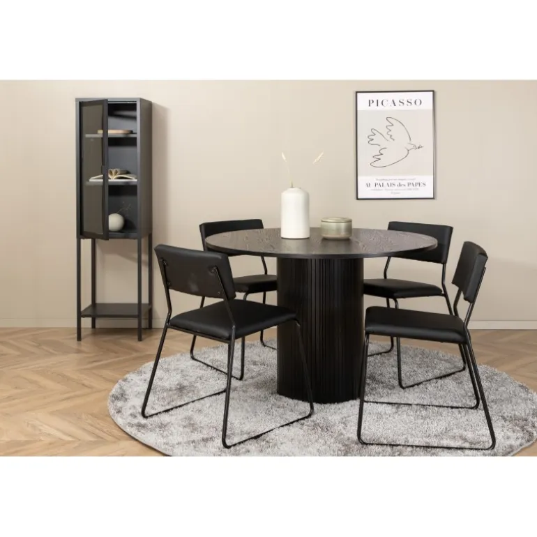 Den perfekte kombination af robusthed og minimalisme! Omkring vores runde spisebord Bianca skaber du et vidunderligt fællesskab, hvor ingen risikerer at sidde på kanten. Bordpladen er lavet af MDF og har en cylinderformet ramme i solidt design og rillet mønster. Den gennemgående sorte farve er både tidløs og stilfuld, og let at matche med andet interiør. Borddiameter: Diameter: 110 cm, Højde: 74 cm. Kombineret her med 4 af vores elegante spisebordsstole Kenth i sort kunstlæder og ben i jern. Stolens dimensioner: Højde: 76 cm, sædehøjde: 48,5 cm, bredde: 40 cm, dybde: 52 cm.