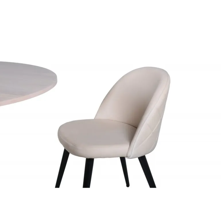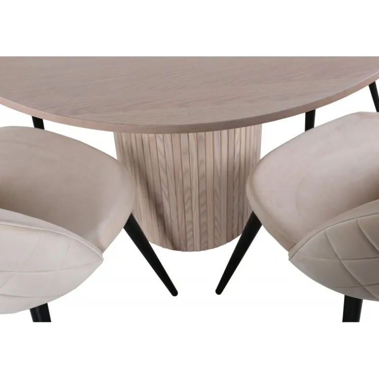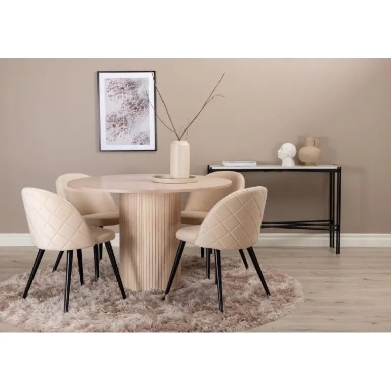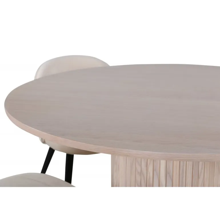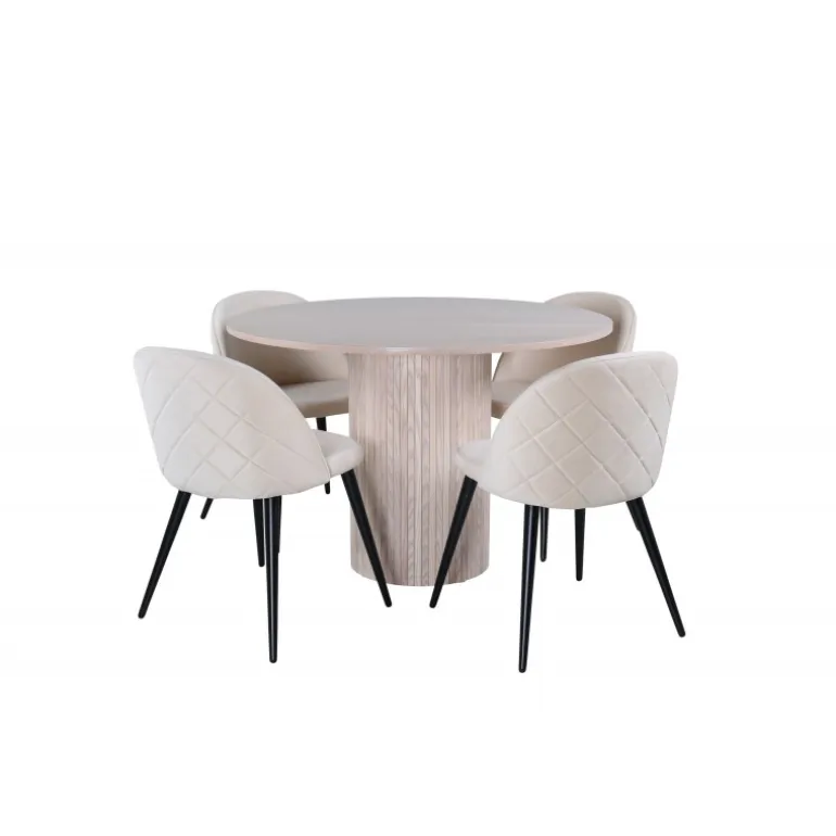 Oplev en perfekt kombination af stil og komfort med Bianca Rundt Spisestuesæt. Saml familie og venner omkring det runde spisebord, hvor ingen risikerer at sidde på kanten. Bordpladen er lavet af MDF med en cylinderformet ramme i et robust og ribbet design. Den gennemgående hvidvaskede farve er både tidløs og elegant, hvilket gør den nem at matche med anden indretning. Bordets diameter er 110 cm og højden er 74 cm. Sættet inkluderer også 4 behagelige spisestuestole fra Velvet-serien. Stolens ben er let flarede og lavet af jern, mens sædet er i blødt beige velourstof. Stolens dimensioner er: Højde: 76,5 cm, Sædehøjde: 46,5 cm, Bredde: 50 cm, Dybde: 57 cm. Lad hjemmets hjerte præges af din nye iøjnefaldende spisestuegruppe.