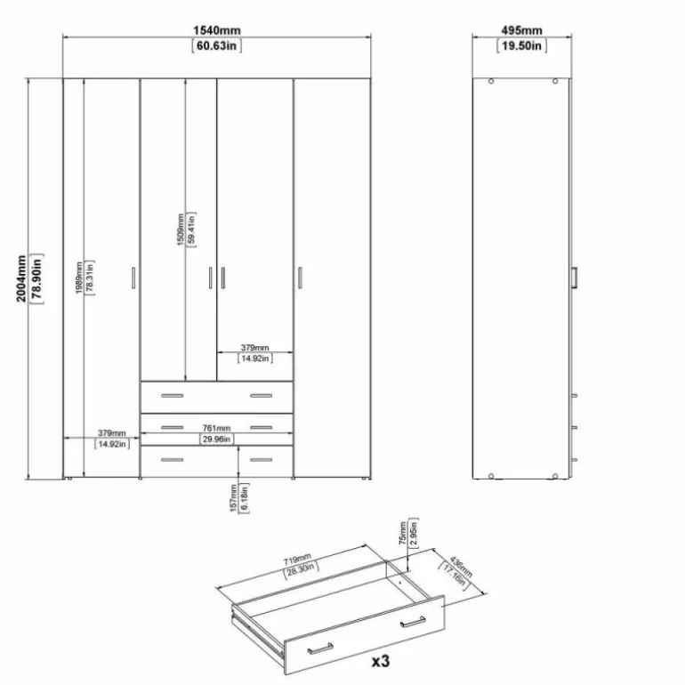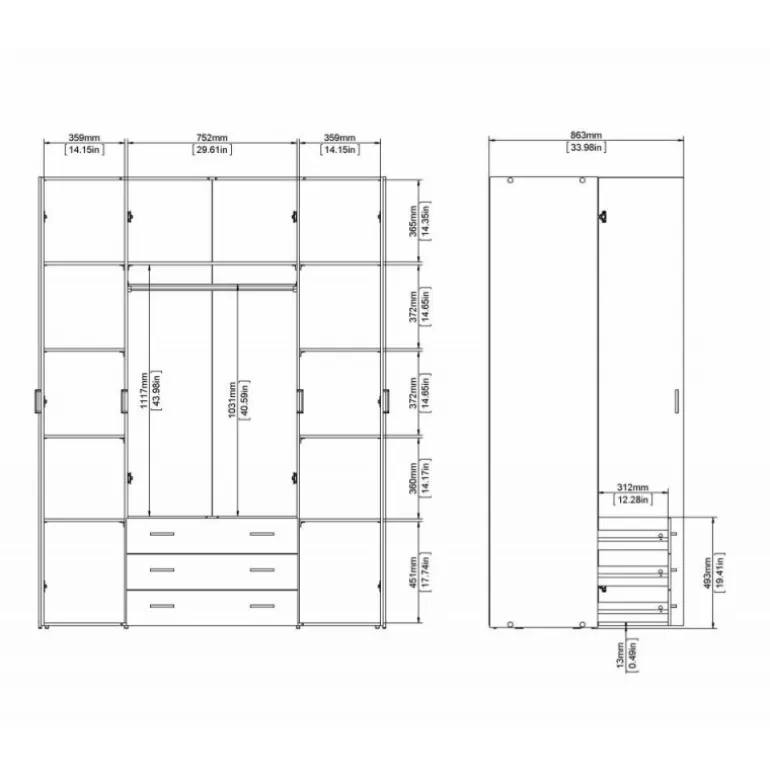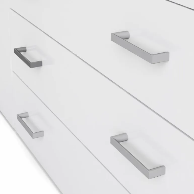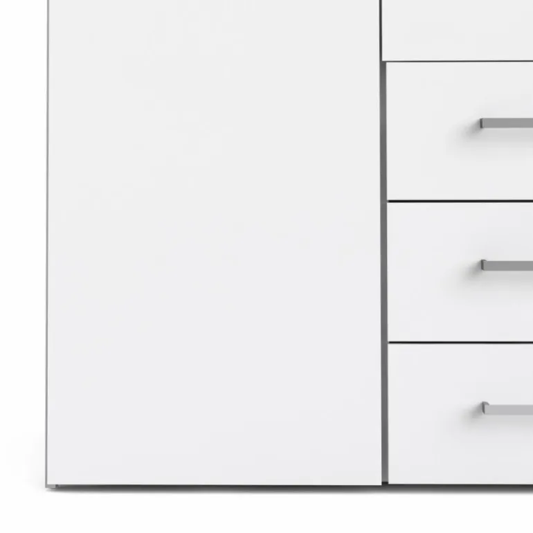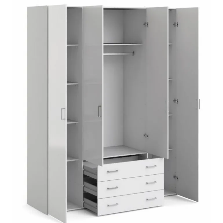 Stort Bolmen garderobeskab i hvid med låger i hvidhøjglans. 3 skuffer, 1 lang bøjlestang, 8 korte hylder & 1 lang hylde. Enkelt og stilrent klædeskab med masser af opbevaringsplads der vil passe ind i alle indretninger.