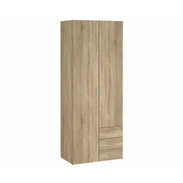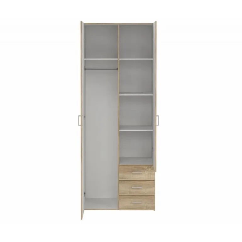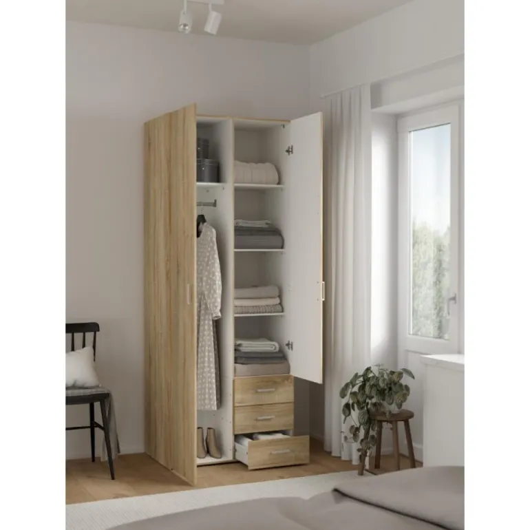 Enkelt og stilrent Bolmen garderobeskab i egstruktur med 3 skuffer, 1 bøjlestang & 4 hylder. Med dette klædeskab får du masser af opbevaringsplads til en fair pris.
