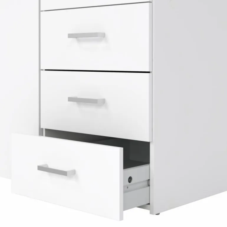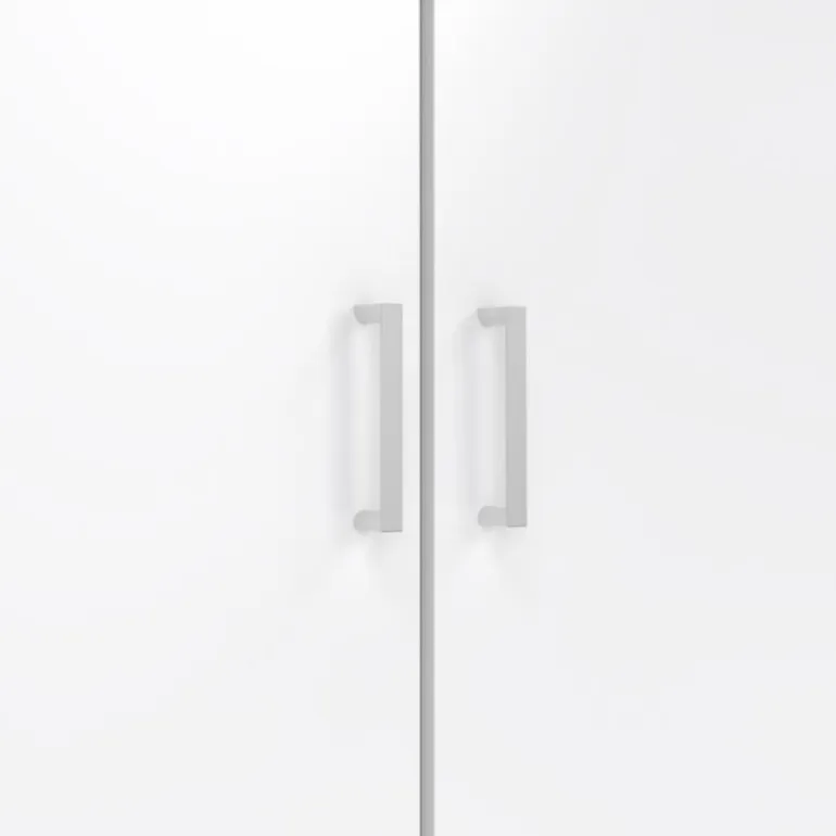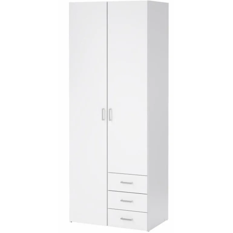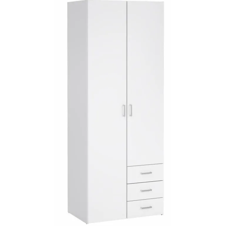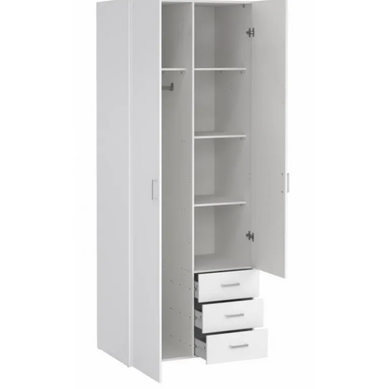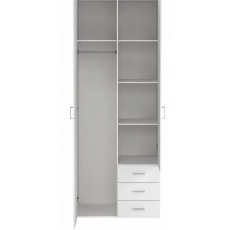 Bolmen garderobeskab med hvide højglanslåger med 3 skuffer, 1 bøjlestang & 4 hylder.