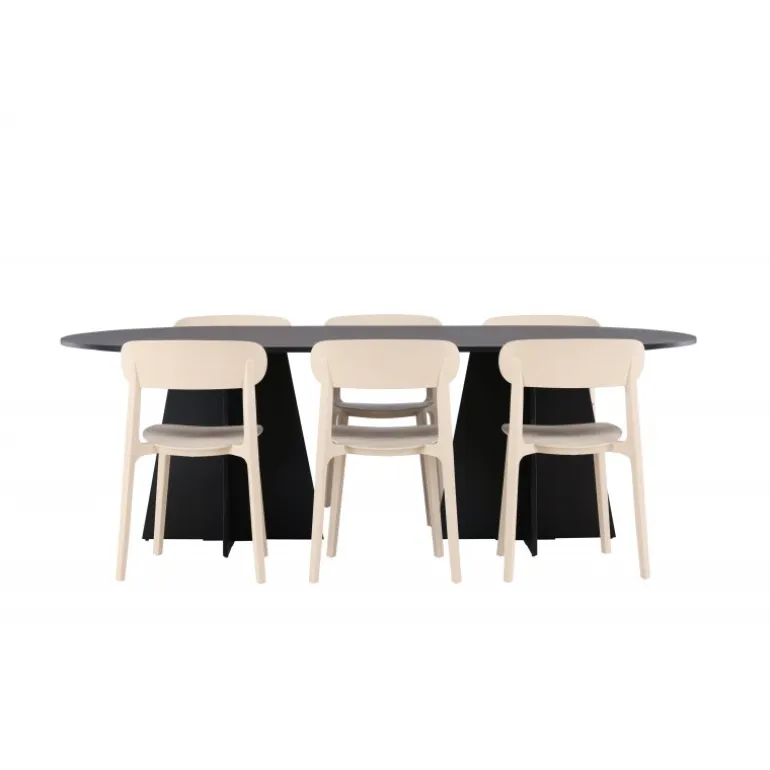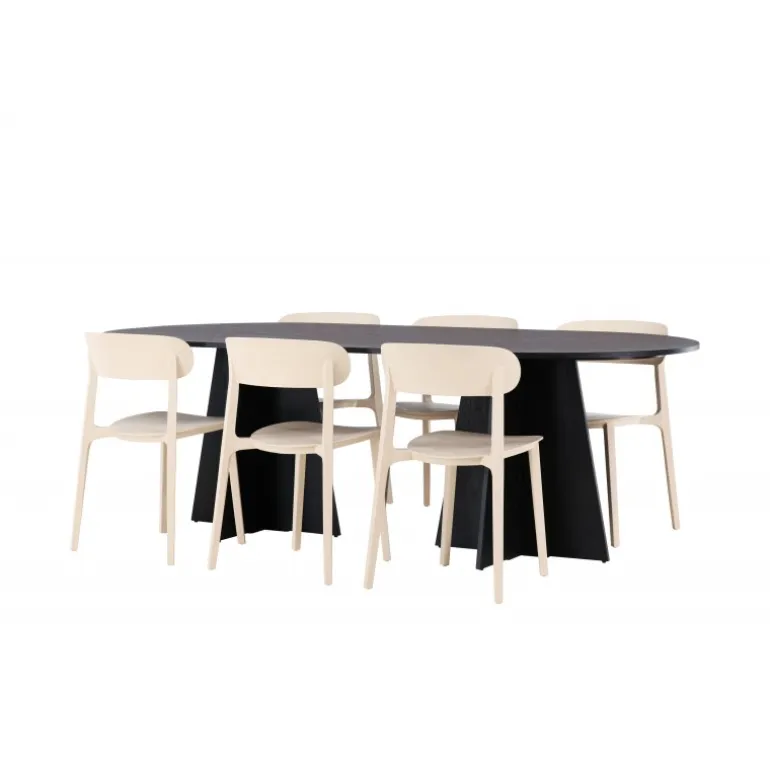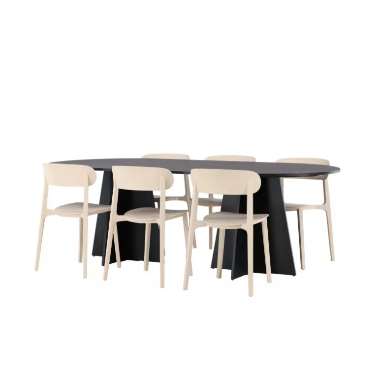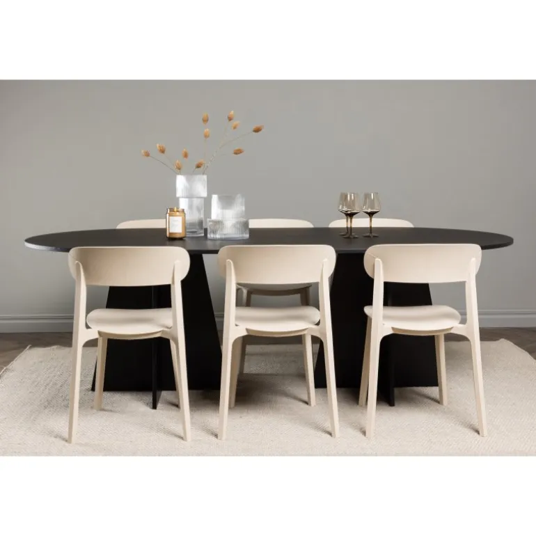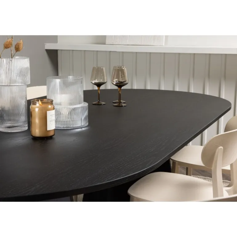 En skøn farvekombination i bæredygtigt træ! Vores ovale spisebord Bootcut har et unikt design med en oval bordplade i sort MDF med finer og en karakteristisk ramme med to kegleformede ben i åben design. Her i en slank kombination med træstole fra Åstol-serien. Stolen er konsekvent lavet i en smagfuld lyspoleret farve i trækombinat med et luftigt design og nordiske lige former. Indret stuen hjemligt! Bordmål: 230x115cm.