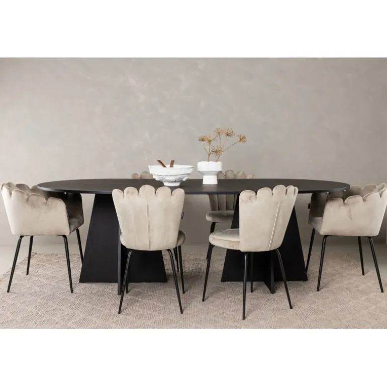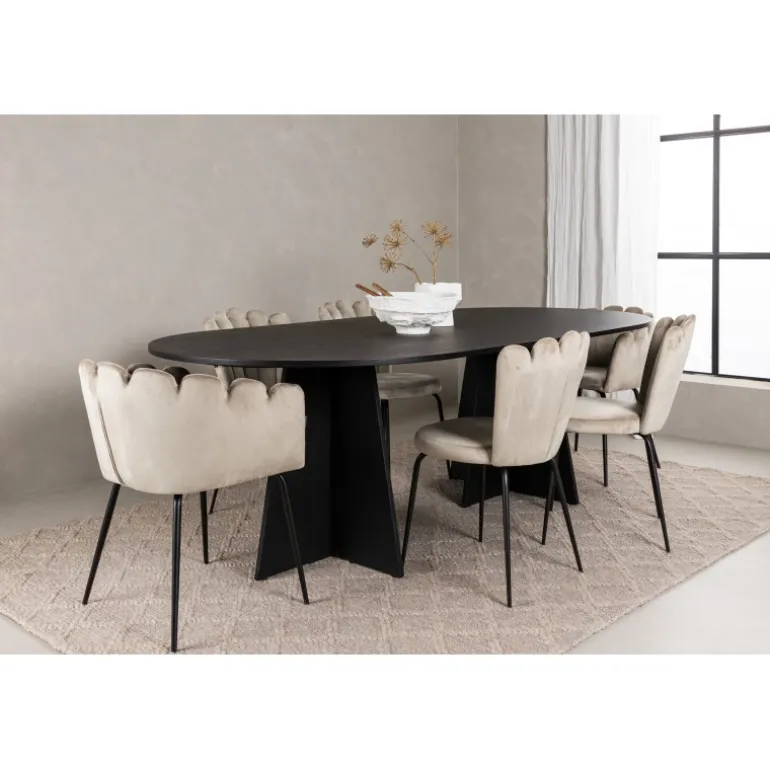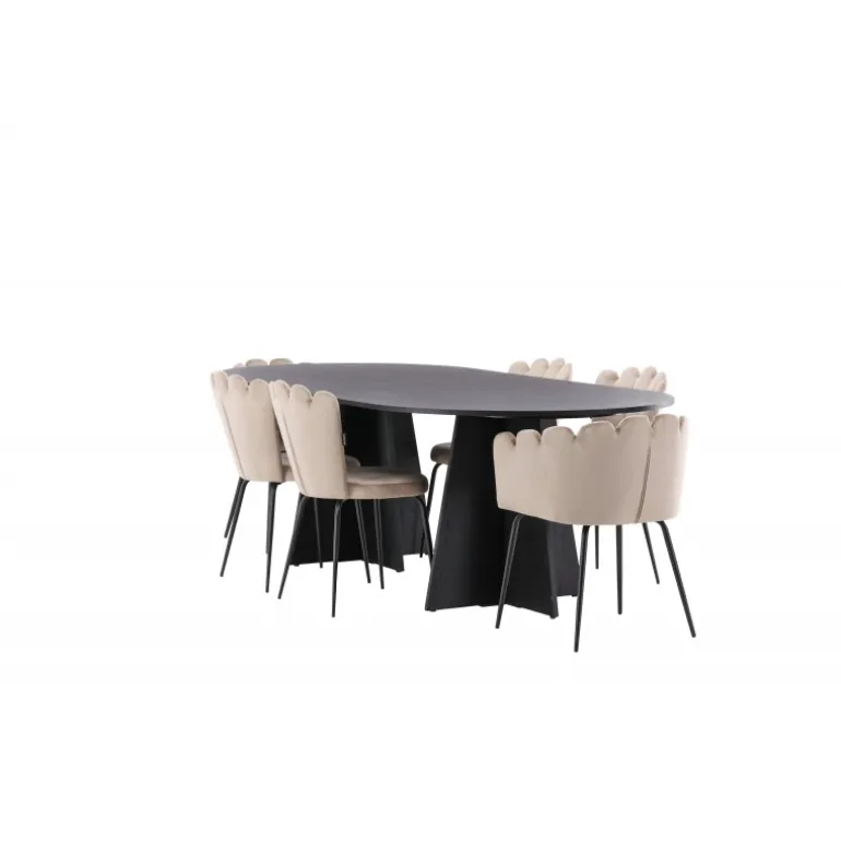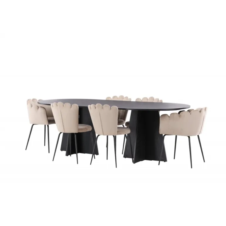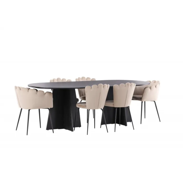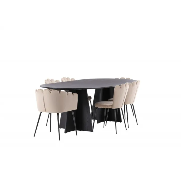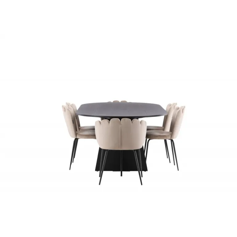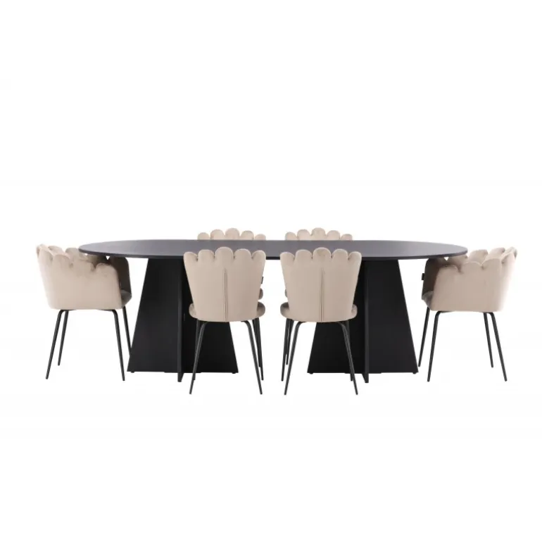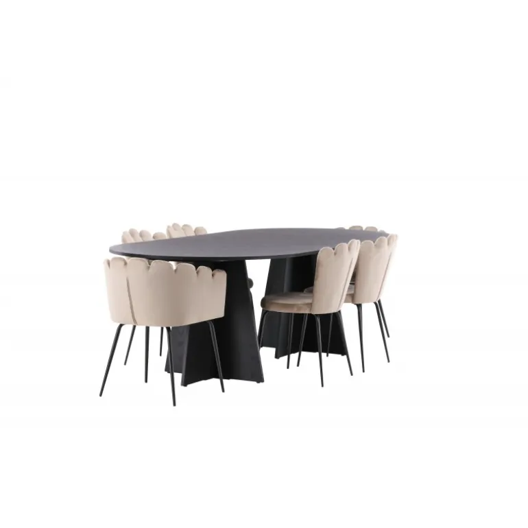 En storslået Spisebordssæt! Bootcut spisebordet har et unikt design med en oval bordplade i sort MDF med finer og en særpræget ramme med to kegleformede ben i et åbent design. Den tynde bordplade skaber et minimalistisk indtryk og er en smagfuld kontrast til den mere robuste ramme. Her sammen med vores komfortable spisebordsstole fra Limhamn-serien. Stolen er en moderne favorit i mange husholdninger med sit indbydende design, dekorative skaldformede ryg med dekorative syninger og et rundt sæde i smagfuldt beige velourstof. Benene er i sort pulverlakeret metal. Læn dig tilbage og nyd det!