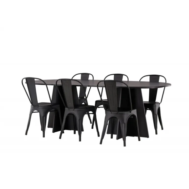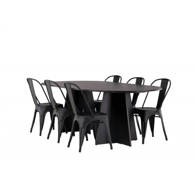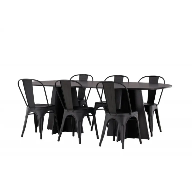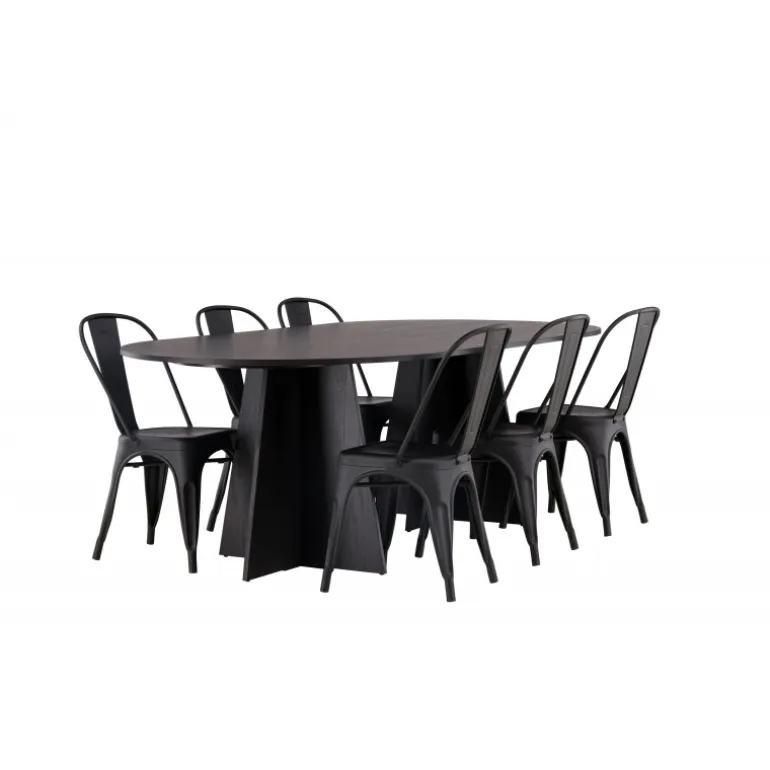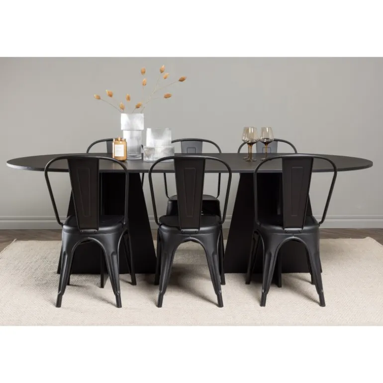 Magnifik og praktisk! Vores ovale spisebord Bootcut har et unikt design med en oval bordplade i sort MDF med finer og en karakteristisk ramme med to kegleformede ben i åben design. Her, sammen med vores sorte spiseborde fra Tempe-serien. Stolen har let udadvendte ben, der glider smukt sammen med sæde og ryglæn i et stilfuldt design, lavet af sort metal hele vejen igennem. En Spisebordssæt, der står tidens prøve og er nem at holde frisk! Bordmål: 230x115cm.
