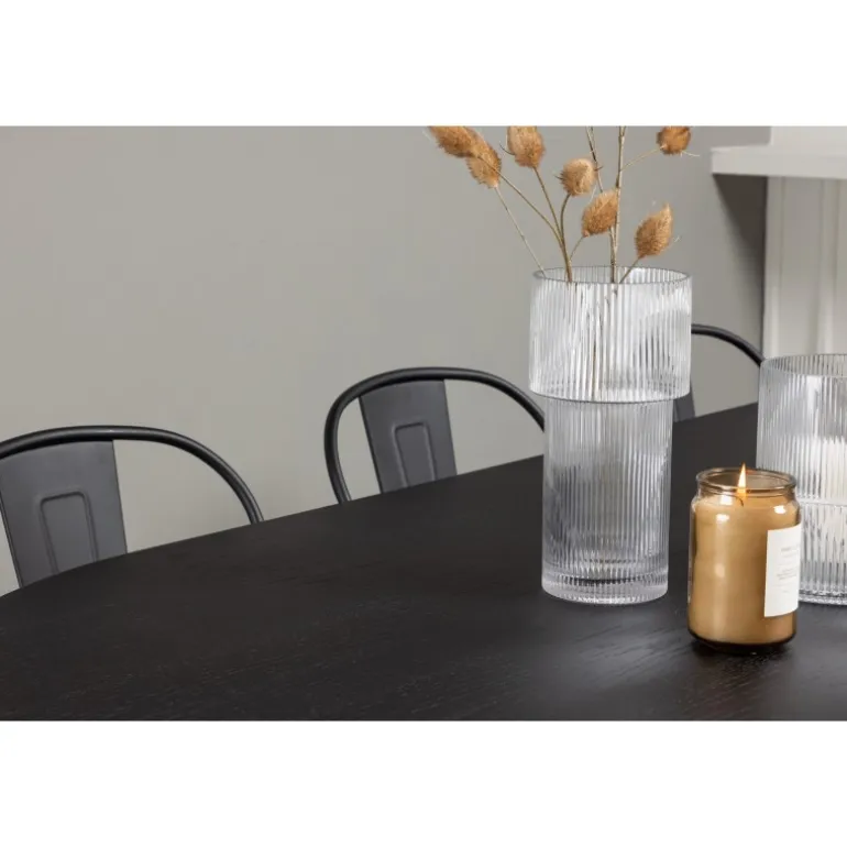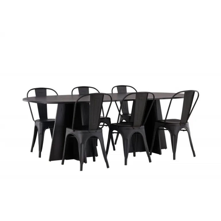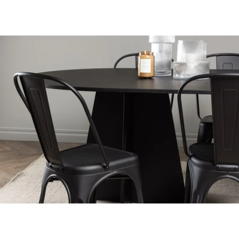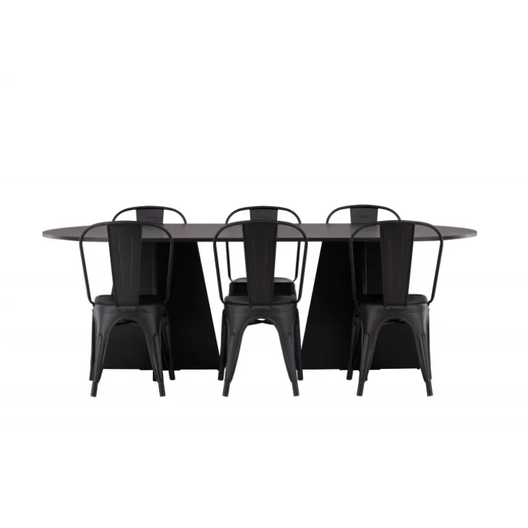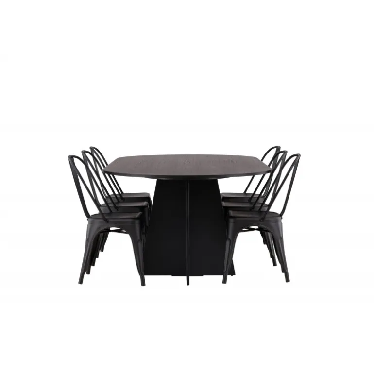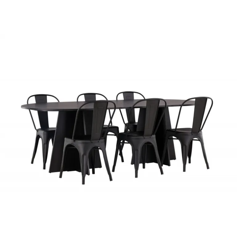 Magnifik og praktisk! Vores ovale spisebord Bootcut har et unikt design med en oval bordplade i sort MDF med finer og en karakteristisk ramme med to kegleformede ben i åben design. Her, sammen med vores sorte spiseborde fra Tempe-serien. Stolen har let udadvendte ben, der glider smukt sammen med sæde og ryglæn i et stilfuldt design, lavet af sort metal hele vejen igennem. En Spisebordssæt, der står tidens prøve og er nem at holde frisk! Bordmål: 230x115cm.