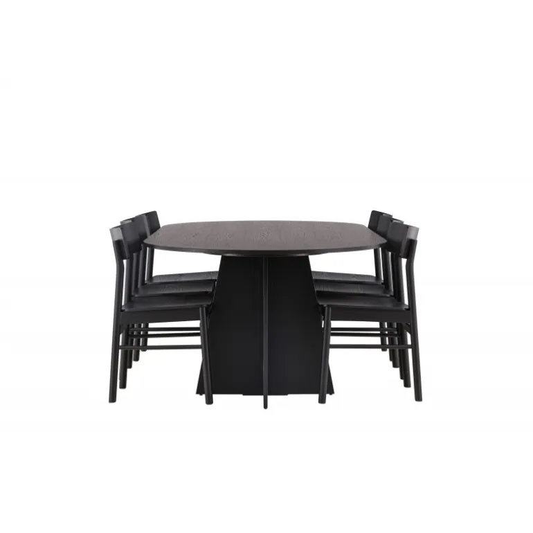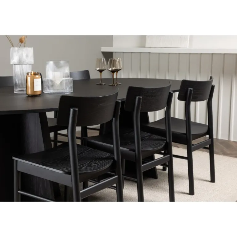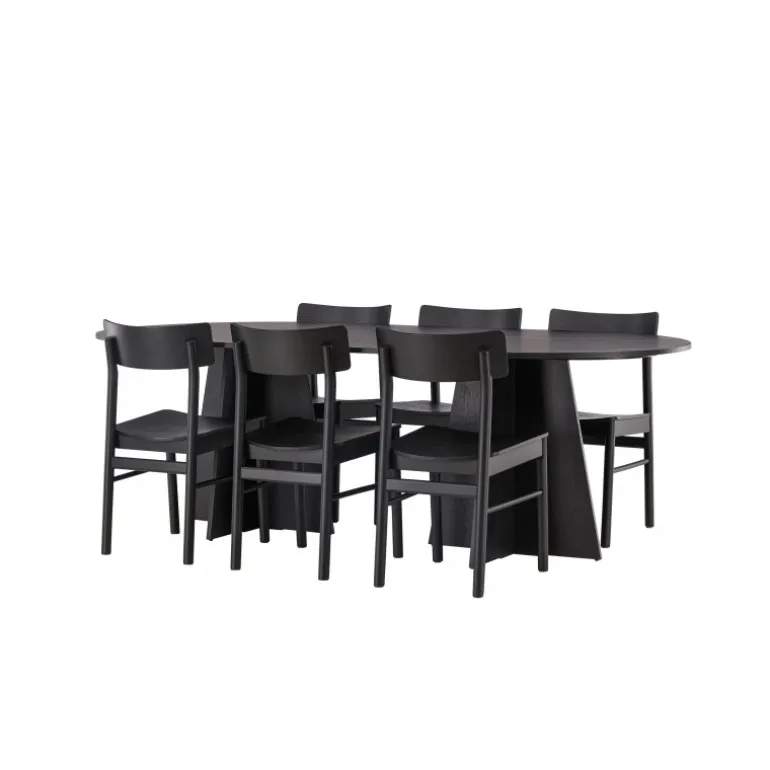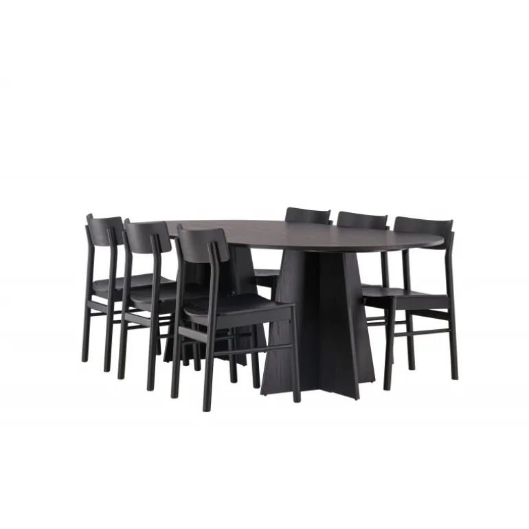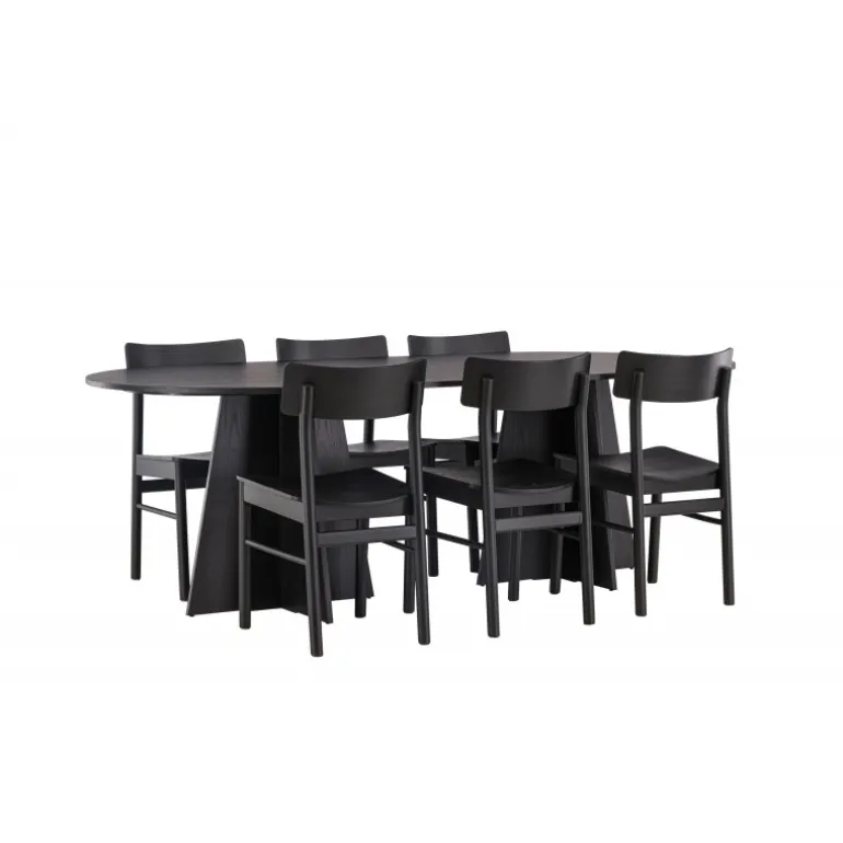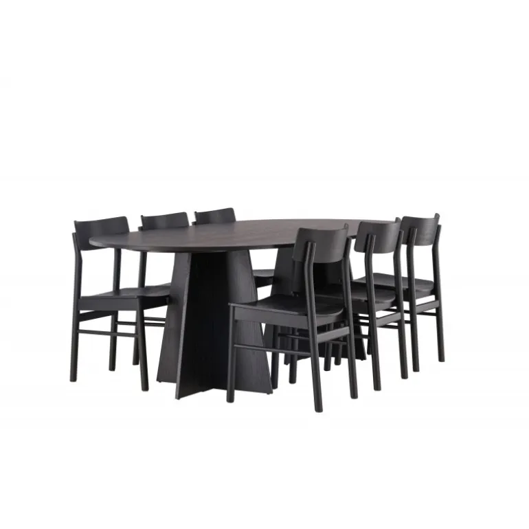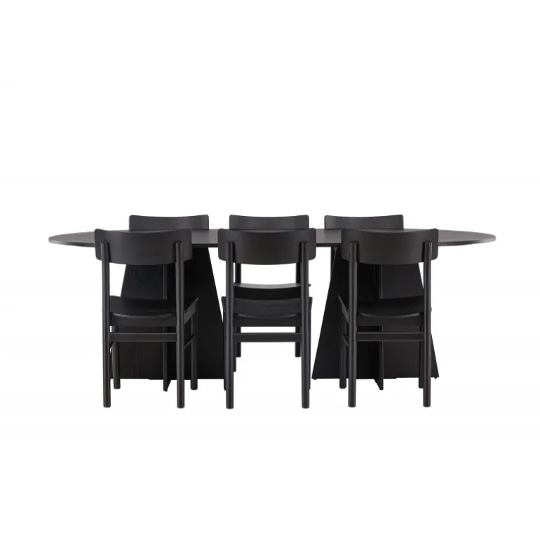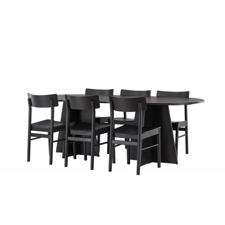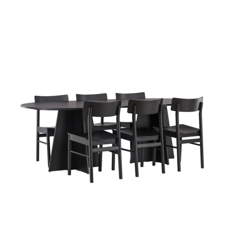 Oplev vores elegante Spisebordssæt med bootcut-bordet og Montros-stolene – den perfekte kombination af stil og funktionalitet til dit køkken eller spisestue. Bootcut-bordet har en oval form og måler 230×115 centimeter. Fremstillet af MDF-materiale, tilbyder det en robust og pålidelig base for alle dine måltider. Bordets sorte farve tilføjer et elegant og moderne touch til din indretning. Montros-stolene er lavet af birketræ og giver en komfortabel siddeoplevelse omkring bordet. Deres sorte farve og enkle, elegante design komplementerer perfekt bootcut-bordet, hvilket skaber en sammenhængende og stilfuld æstetik for hele Spisebordssættet. Uanset om det er en stille familiemiddag eller en festlig sammenkomst med venner, er vores Spisebordssæt med bootcut-bordet og Montros-stolene det perfekte valg til at skabe en indbydende og stilfuld atmosfære i dit hjem.