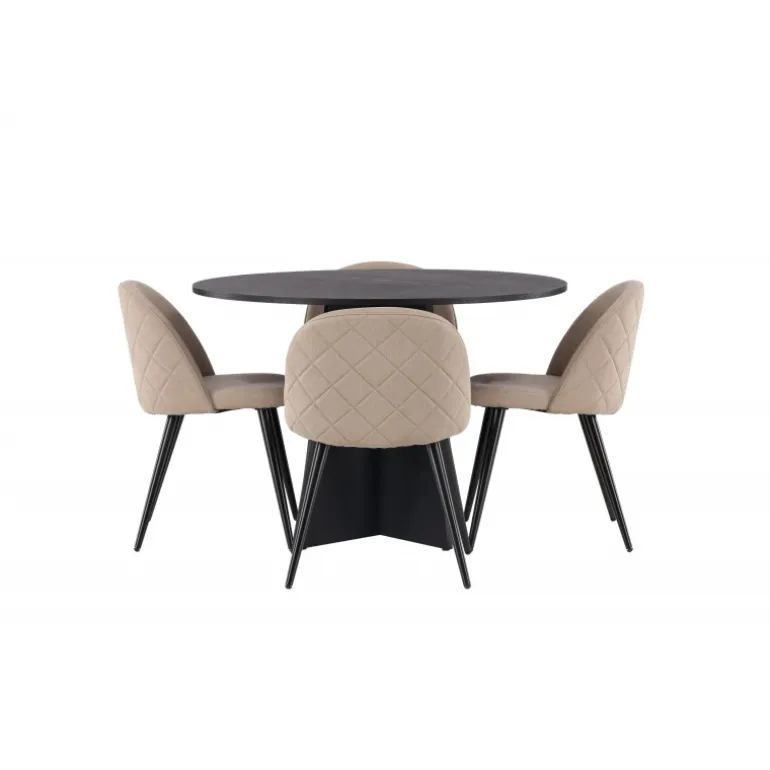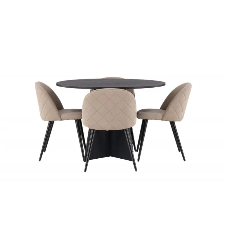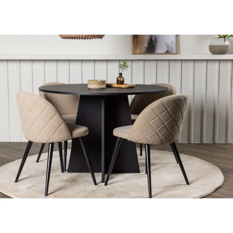 Skab et blikfang, der imponerer! Det runde spisebord Bootcut i en konsekvent sort farve har en bordplade i MDF med finer og en designrig ramme, der giver et dejligt indtryk til helheden. Her i en trend-sikker kombination med spisebordsstole fra Velvet Stitches-serien. Stolens ryg er afrundet og ligesom sædet, er det blødt polstret i beige fløjl og polyesterlinned med dekorative syninger og skakmønstre på bagsiden. Benene er let udadgående i sort jern og giver et stabilt indtryk. Her får du en smagfuld kombination af stil og bekvemmelighed! Bordets dimensioner: 110 cm.