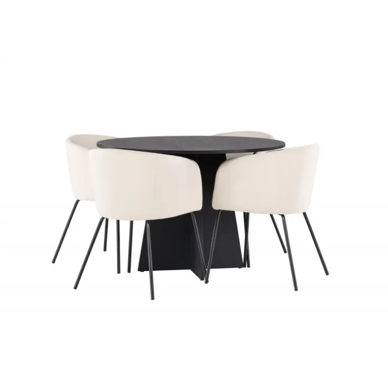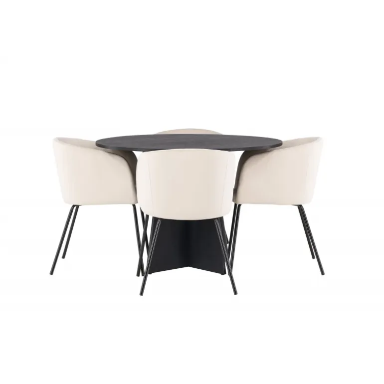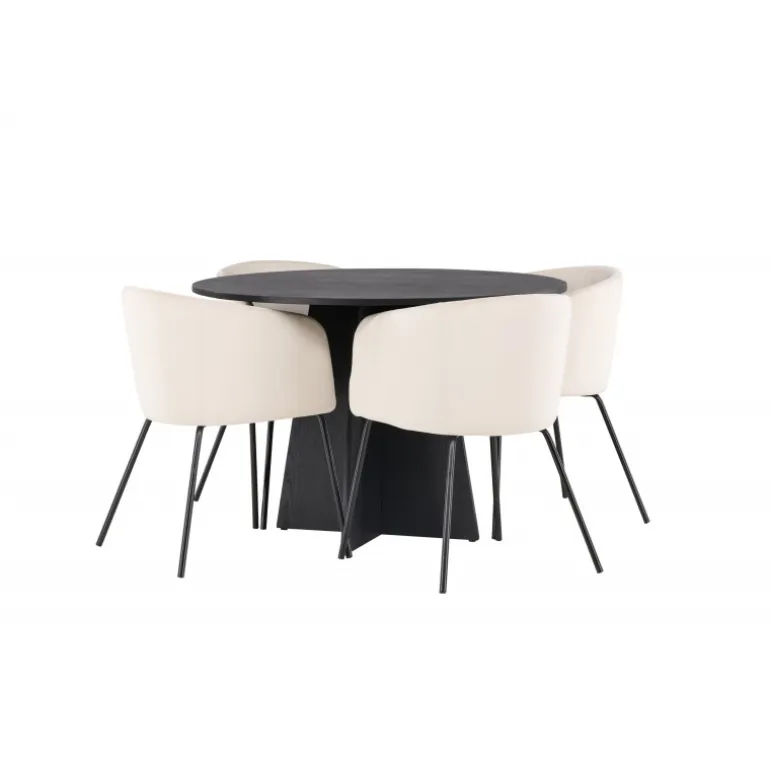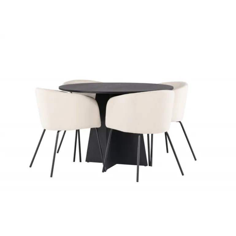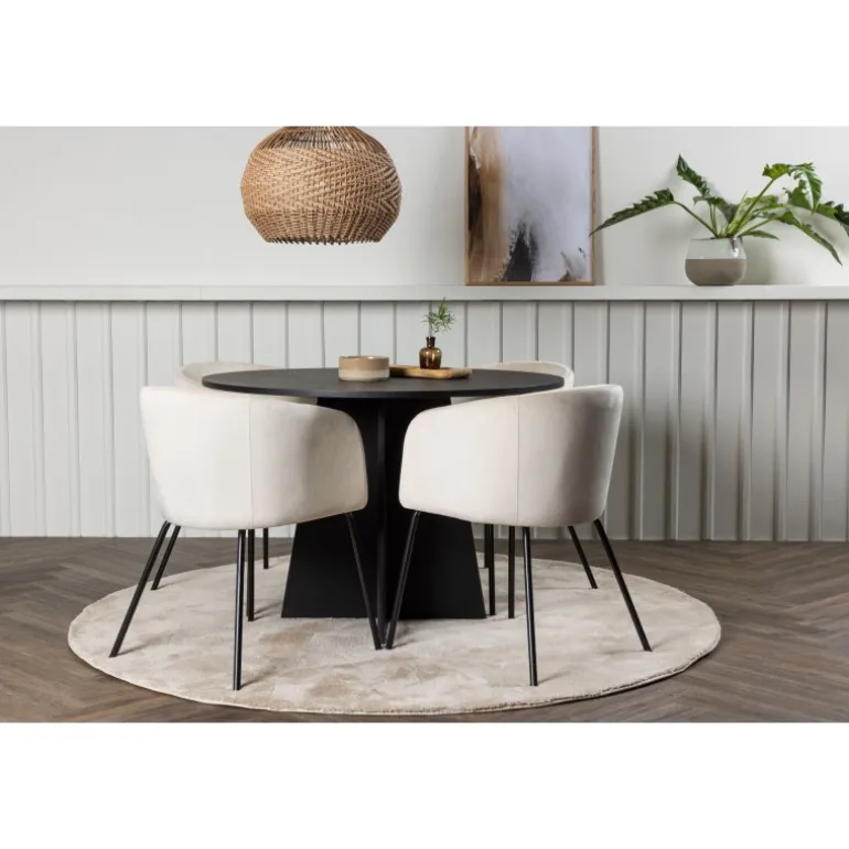 En moderne farvekombination! Det runde spisebord Bootcut i gennemgående sort farve har en bordplade i MDF med finer og en designrig ramme, der giver et skønt indtryk til det samlede billede. Her sammen med vores storslåede spisestuestole Berit. Stolen har et fuldt polstret design med en let afrundet ryg og sæde i velourstof og smalle ben i sort jern. Sid komfortabelt og indret stuen festligt! Bordets dimensioner: 110 cm.