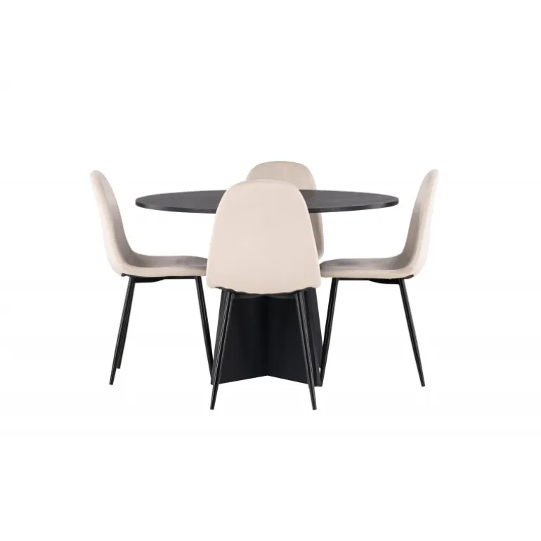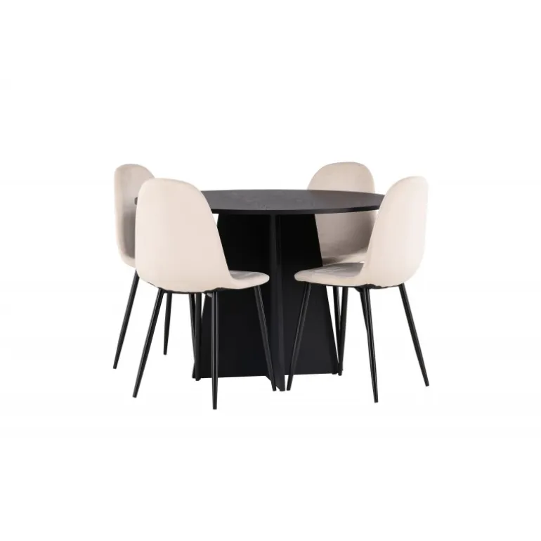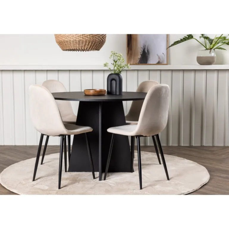 Det handler om detaljerne! Det runde spisebord Bootcut i en konsekvent sort farve har en bordplade i MDF med finer og en designrig ramme, der giver et dejligt indtryk af det samlede billede. Her sammen med vores vidunderlige spisestole Polar. Denne spisestol i et fuldt polstret design med en let afrundet ryg og sæde i beige velourstof og ben i sort pulverlakeret metal er lige så komfortabel, som den er iøjnefaldende. Den varme, beige farve er prikken over i’et! Bordets dimensioner: 110 cm.