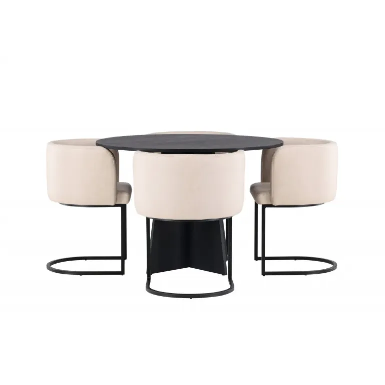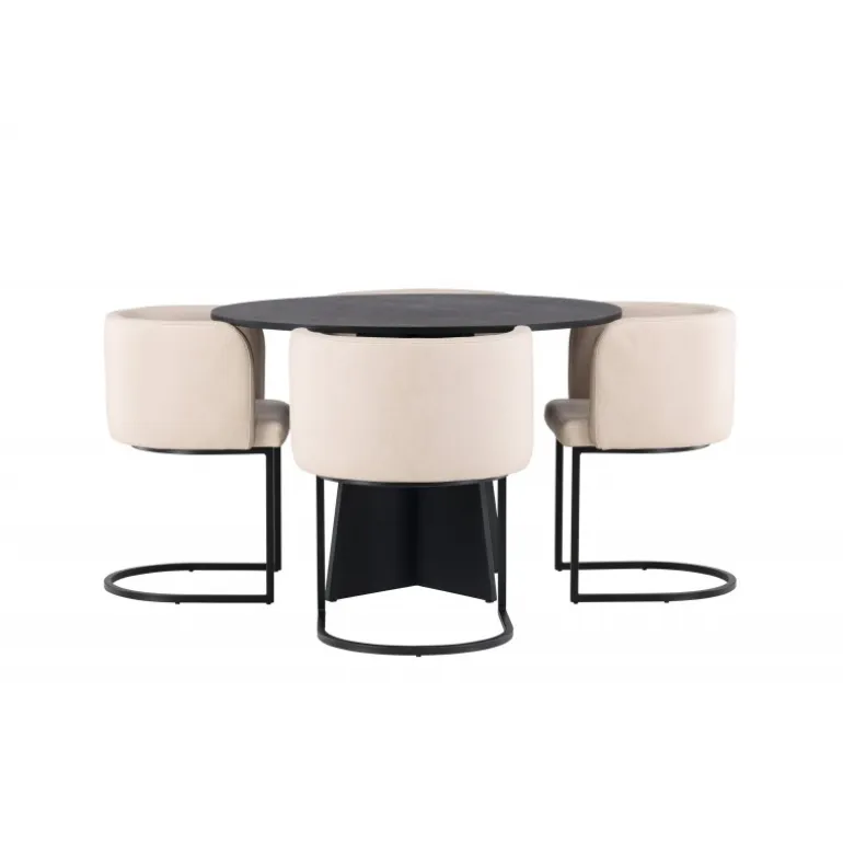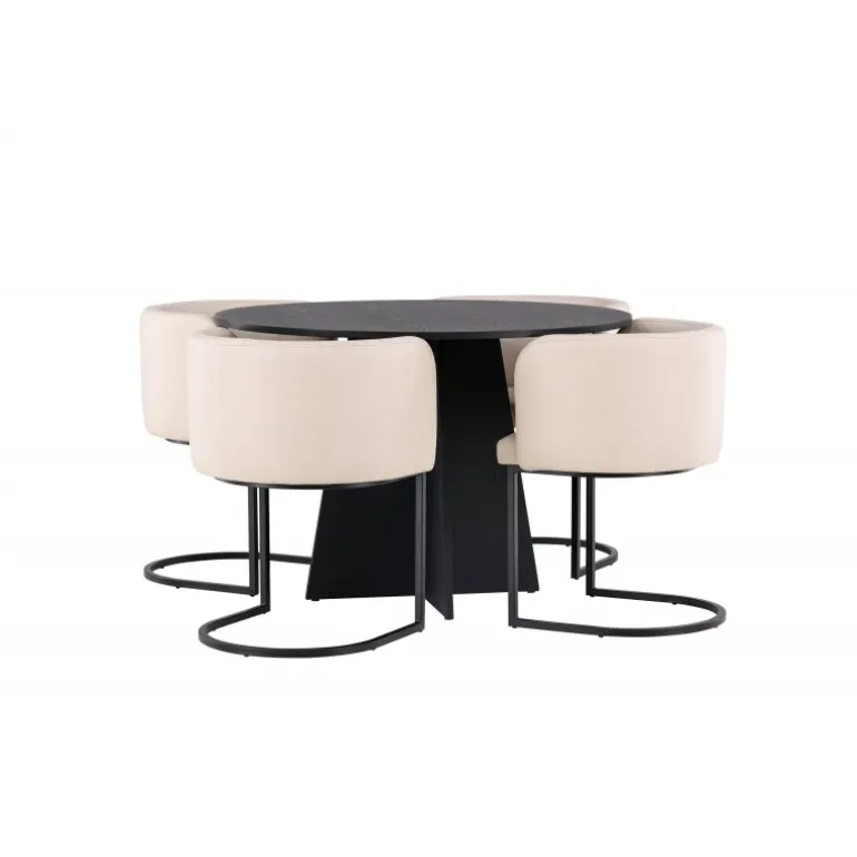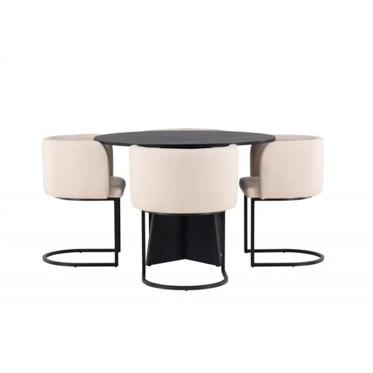 Indret luksuriøst og storslået! Det runde spisebord Bootcut i gennemført sort farve har en bordplade i MDF med finer og en designrig ramme, der giver et skønt indtryk til det samlede billede. Her sammen med vores elegante spisebordsstole fra Simrishamn-serien. Stolen har et fuldt polstret sæde med en rundet ryglæn i beige TC-stof og dekorative, minimalistiske ben i sort stål. Sid komfortabelt og nyd måltider sammen med dine kære! Borddimensioner: 110cm.