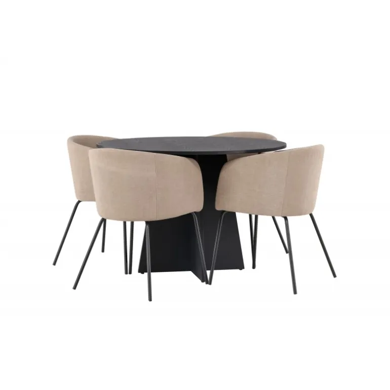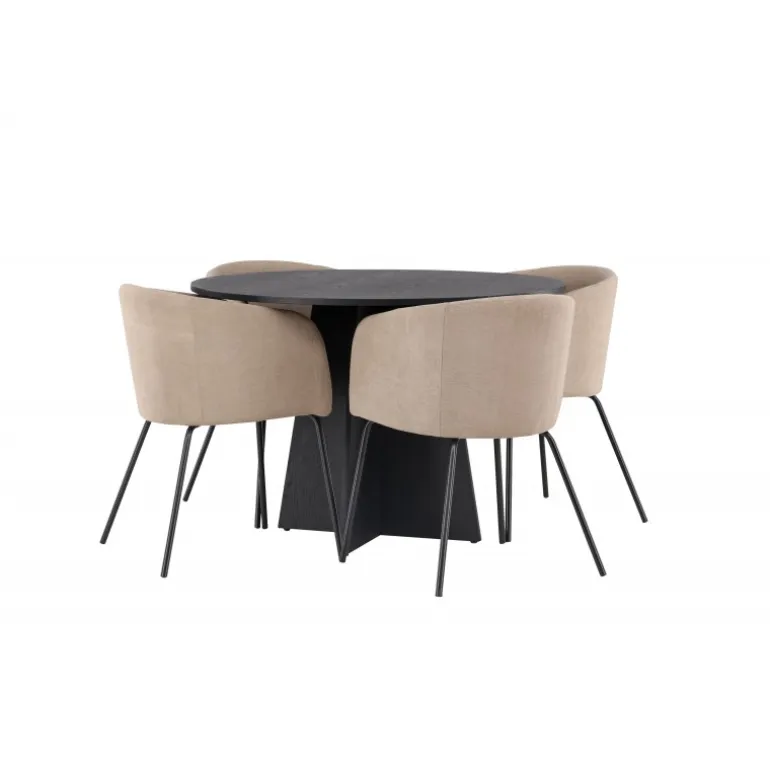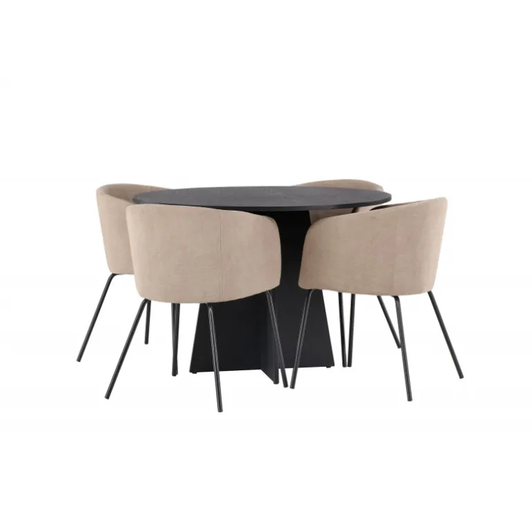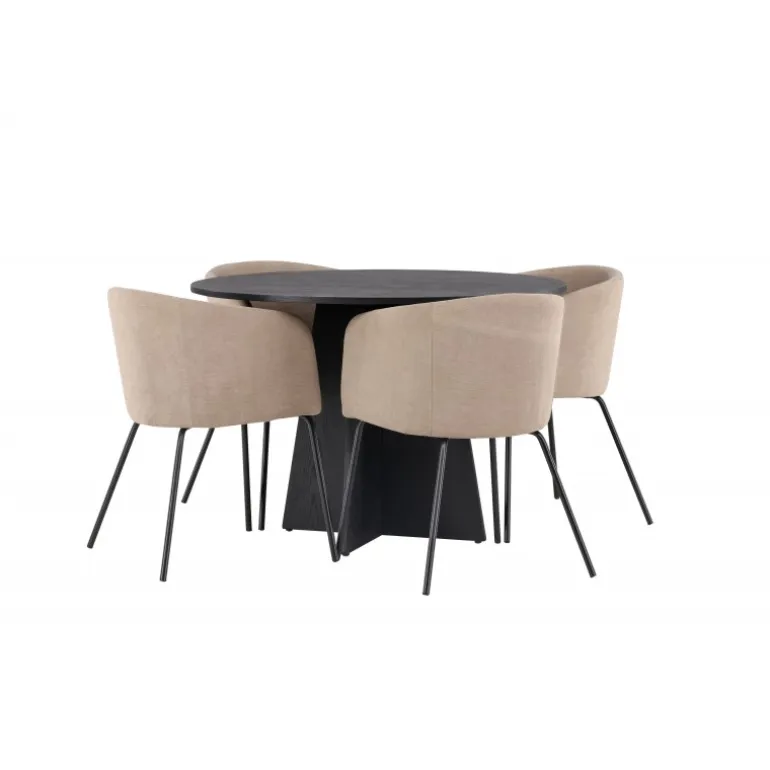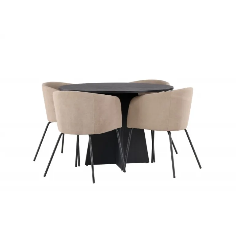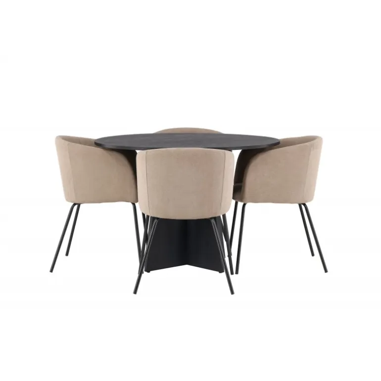 En smagfuld kombination af bekvemmelighed og charmerende former! Det runde spisebord Bootcut i en konsekvent sort farve har en bordplade i MDF med finer og et designrigt stel, der giver et dejligt indtryk til det samlede billede. Her sammen med vores komfortable spisebordsstole Berit. Stolen har et fuldt polstret design med en let rundet ryg og sæde i velourstof og polyesterlinned samt smalle ben i sort jern. Lad tiden her være nydelig for hele familien! Bordets dimensioner: 110 cm.