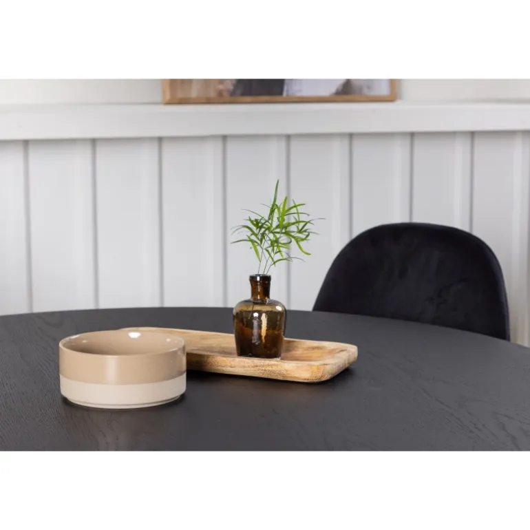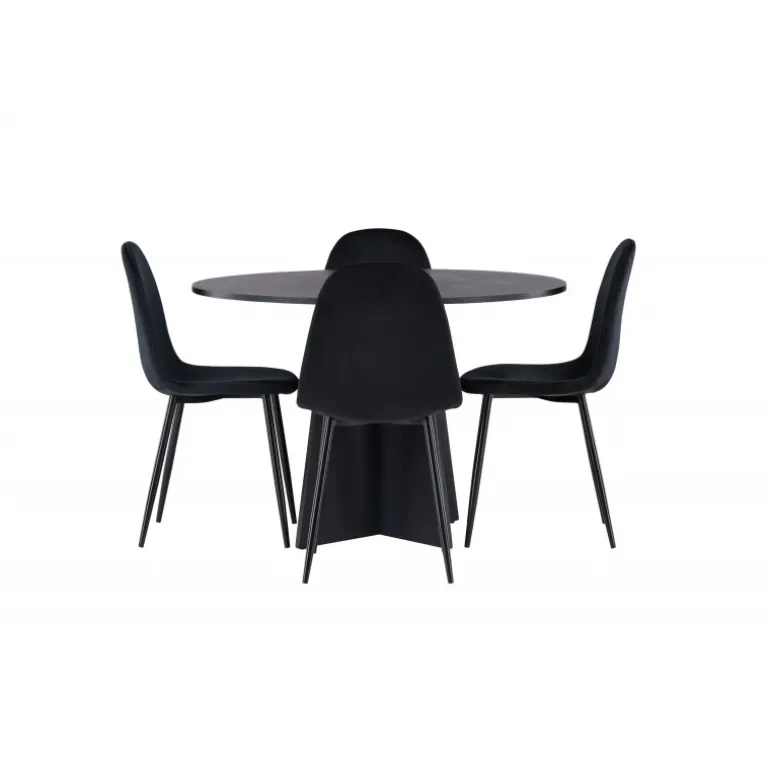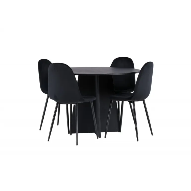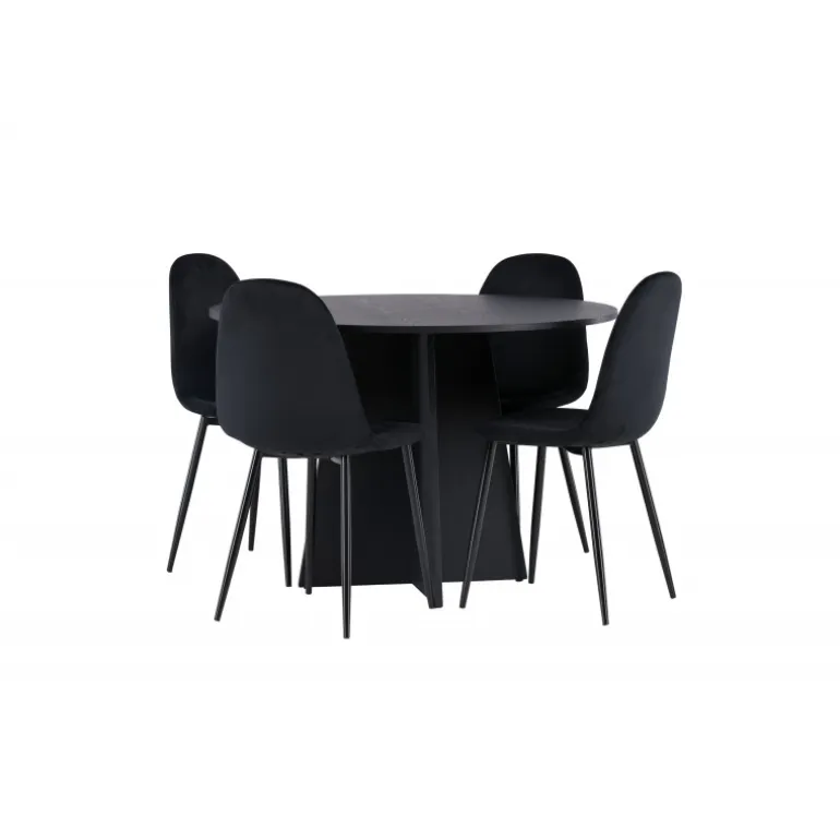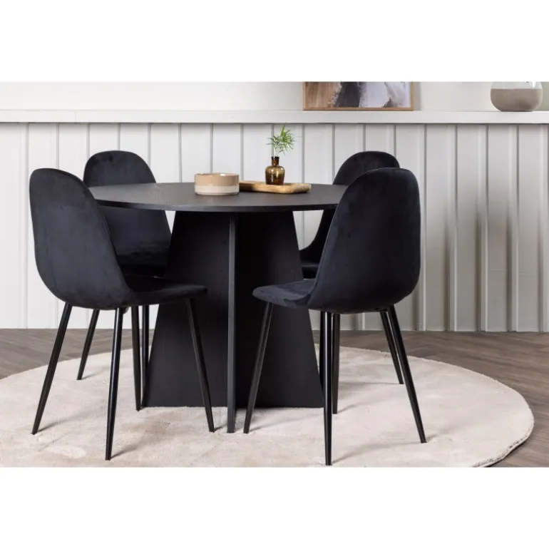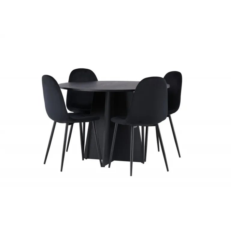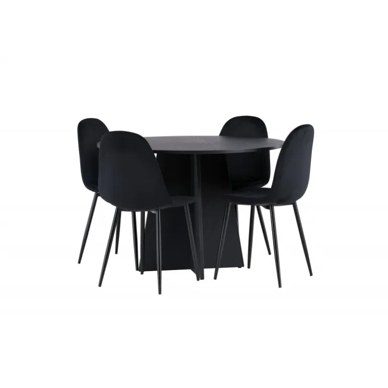 Et helt sort Spisebordssæt går aldrig af mode! Det runde spisebord Bootcut i gennemgående sort farve har en bordplade i MDF med finer og en designrig ramme, der giver et smukt indtryk til det samlede billede. Her i en stilfuld kombination med sorte spisebordsstole fra Polar-serien. Stolen har et fuldpolstret design, ben i sort pulverlakeret metal og rundet ryg og sæde i sort velourstof med blød polstring. Indret smart og komfortabelt! Bordmål: 110 cm.