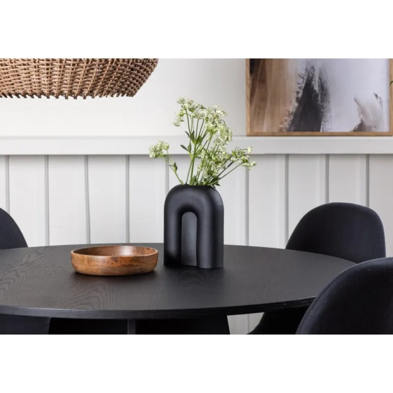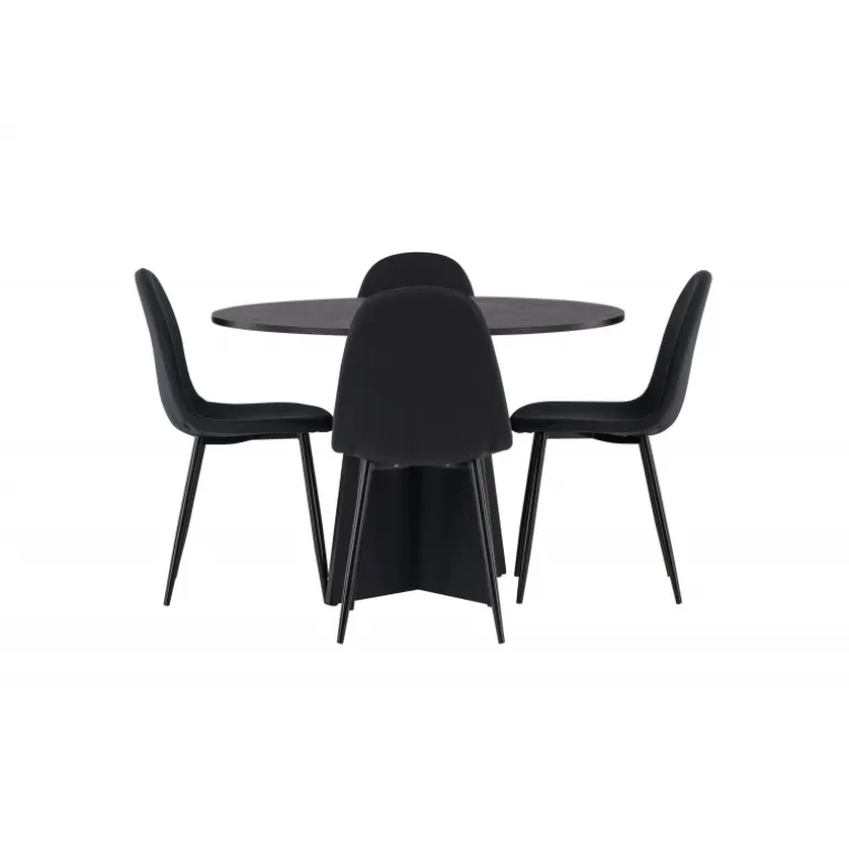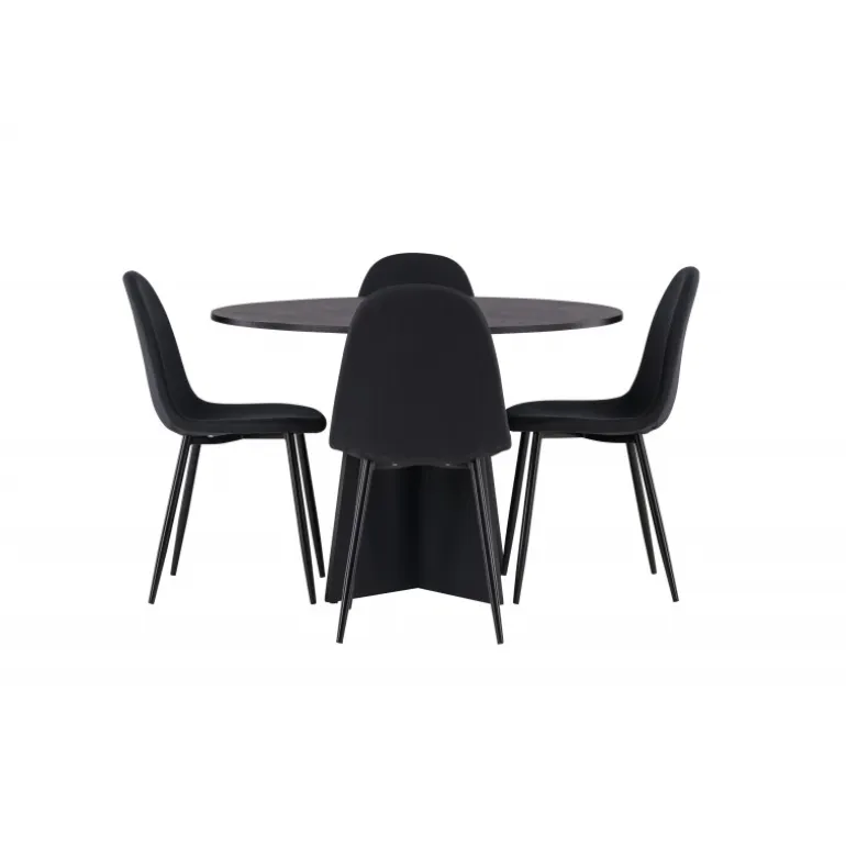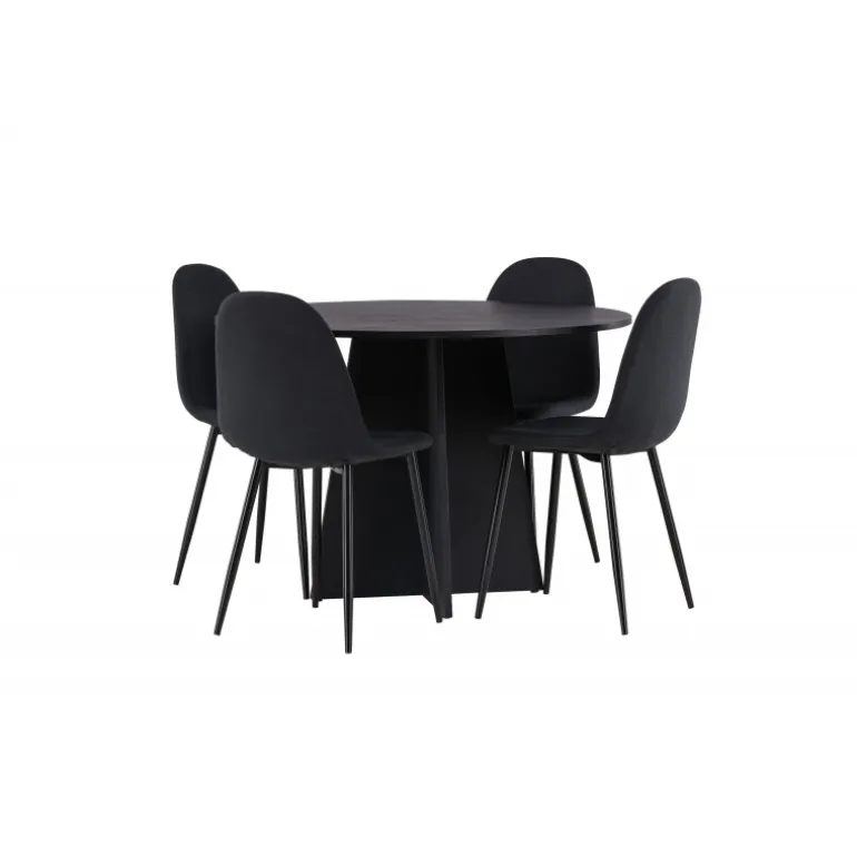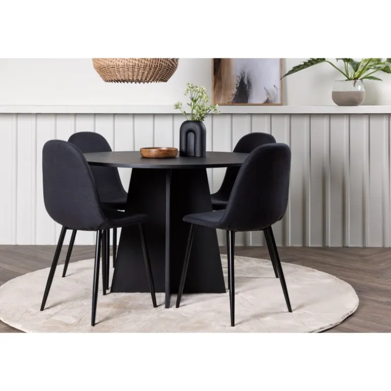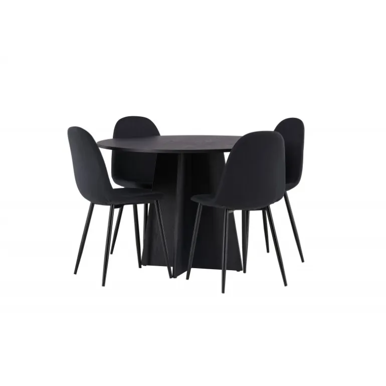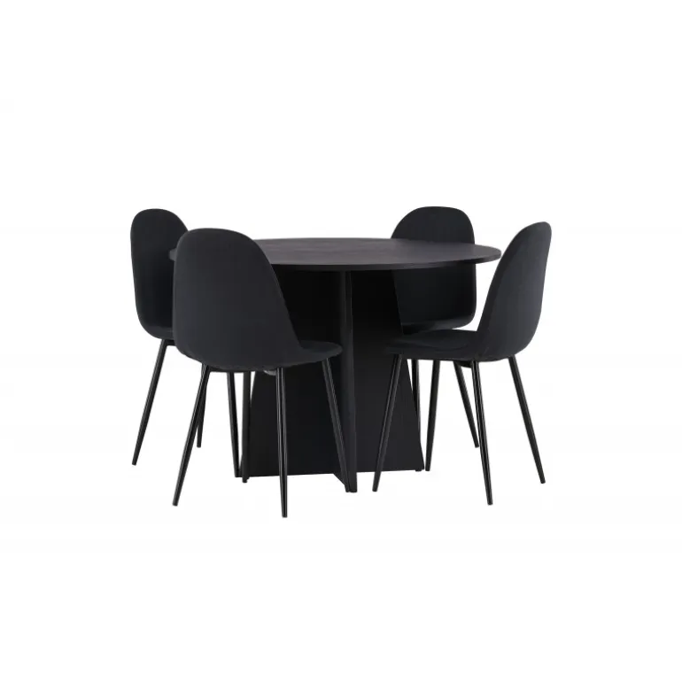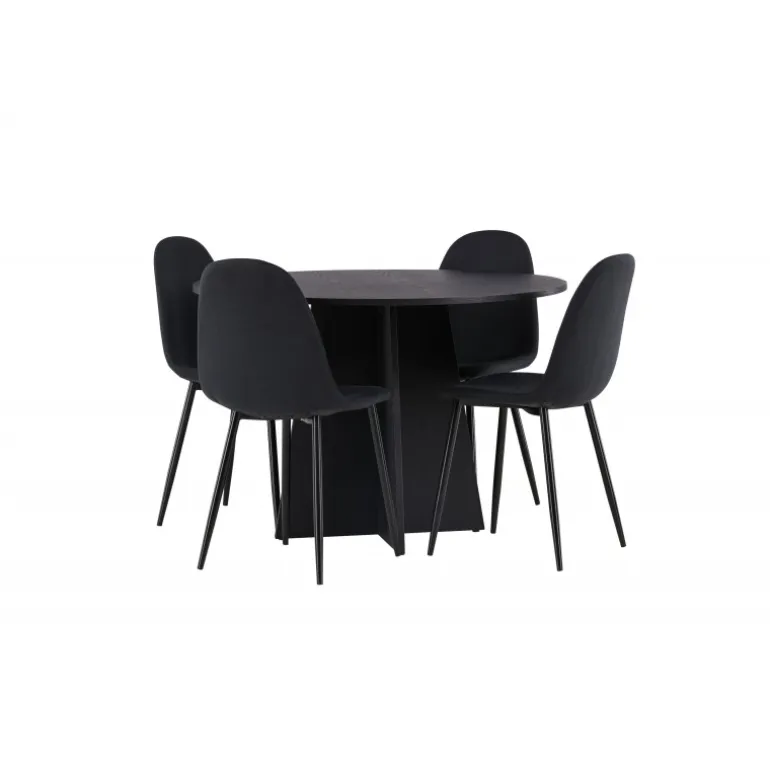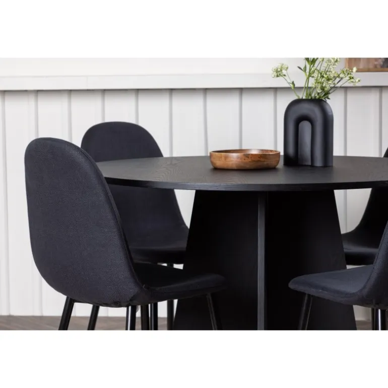 Det bliver ikke bedre end dette! Det runde spisebord Bootcut i konsekvent sort farve har en bordplade i MDF med finer og et designrigt stel, der giver et dejligt indtryk til det samlede billede. Her er bordet kombineret med sorte spisebordsstole fra Polar-serien. Stolen har et afrundet design med et klassisk udseende – lige så praktisk som tidløst. Ryg og sæde er polstret i sort polyester stof og ben i sort pulverlakeret metal. Indret dit hjem charmerende og komfortabelt! Borddimensioner: 110 cm.