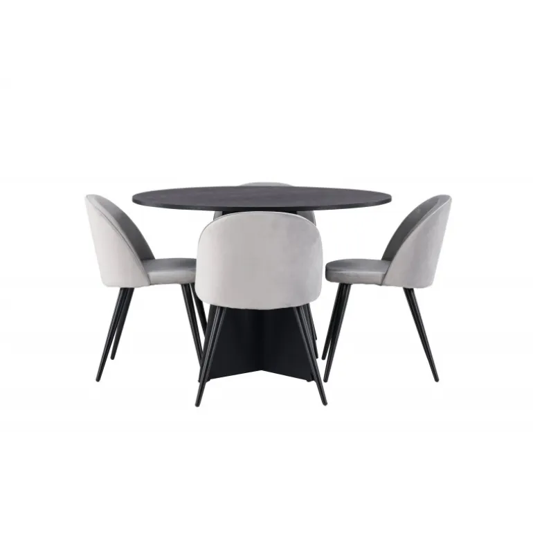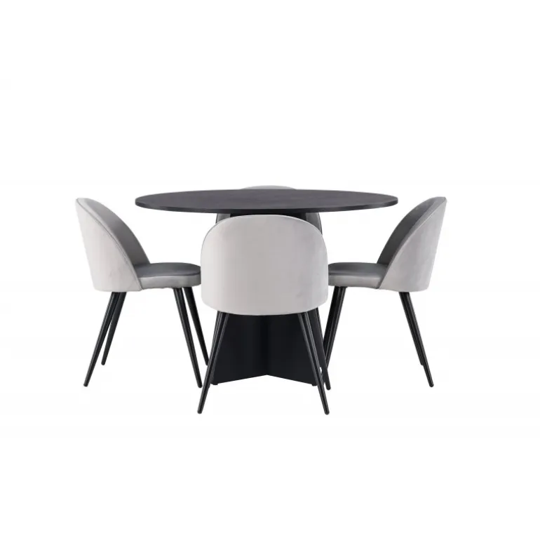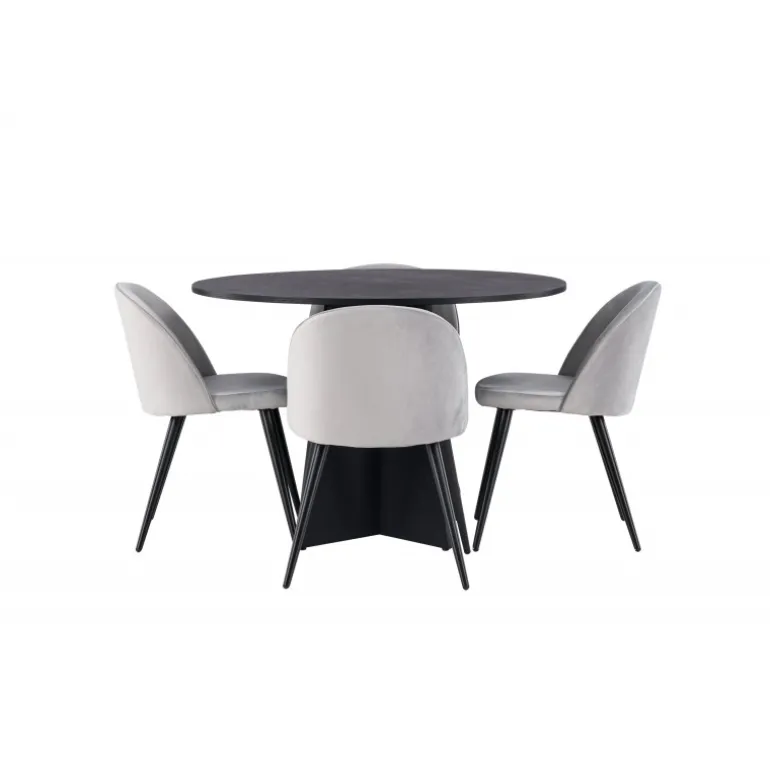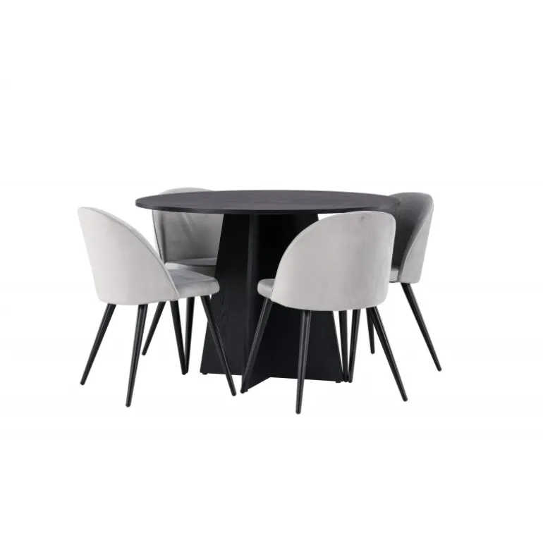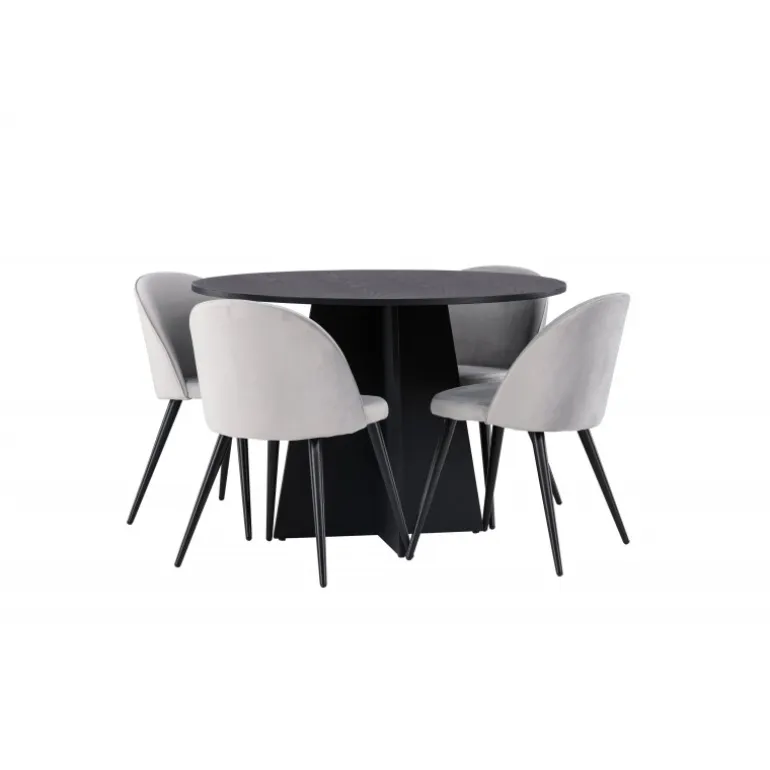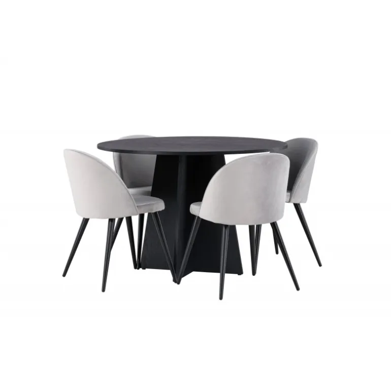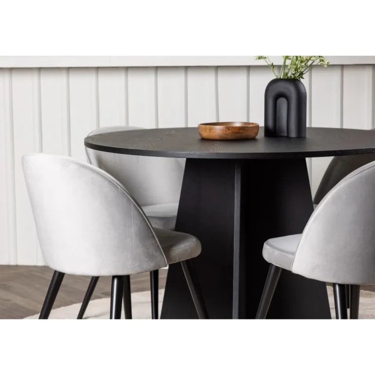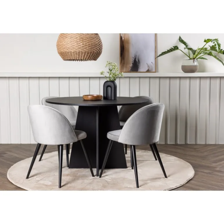 En behagelig spisestuegruppe i smagfuldt, skandinavisk design! Det runde spisebord Bootcut i gennemgående sort farve har en bordplade i MDF med finer og en designrig ramme, der giver et dejligt indtryk til det overordnede billede. Her i perfekt kombination med vores grå spisebordsstole fra Velvet-serien. Stolen har et fuldt polstret design, ben i sort pulverlakeret metal og rundet ryg og sæde i gråt velourstof med blød polstring. Lige så stilfuld som den er komfortabel! Bordets diameter: 110 cm.