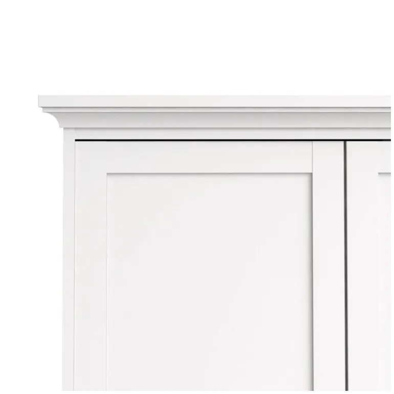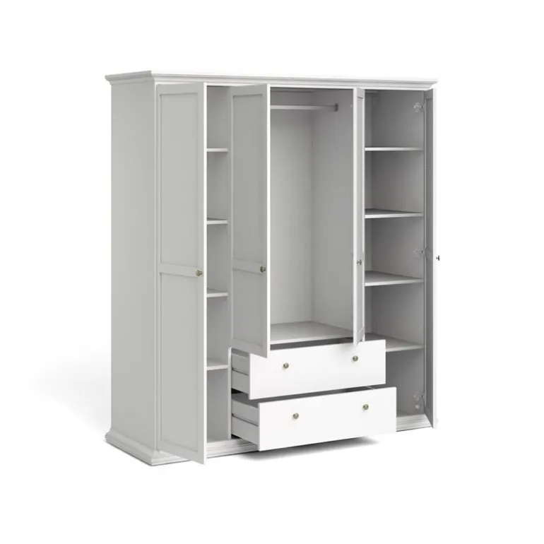 Bordeaux klædeskab i hvid med 4 låger og 2 skuffer. Inde i skabet er der både bøjlestang og 8 hylder med god plads til opbevaring.