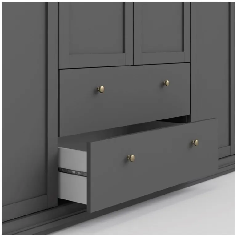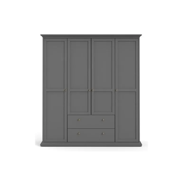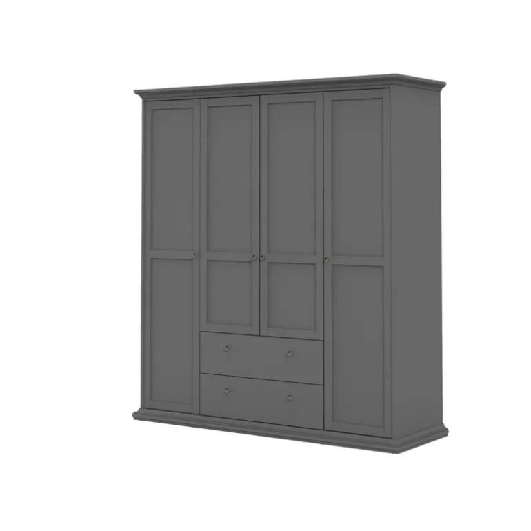 Bordeaux klædeskab i Mørkegrå med 4 låger og 2 skuffer. Inde i skabet er der både bøjlestang og 8 hylder med god plads til opbevaring.