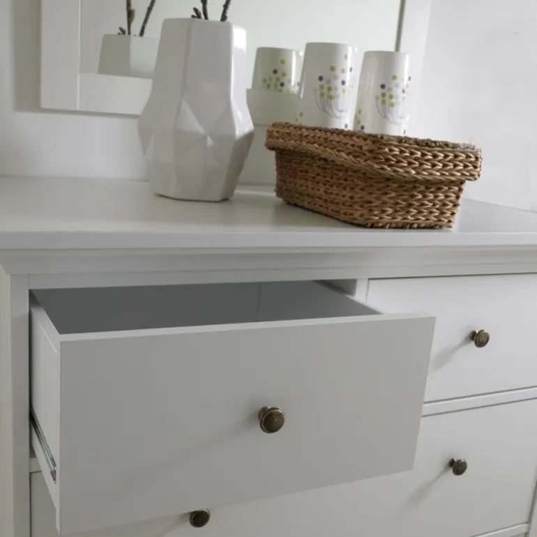 Bordeaux-serien er en komplet designet møbelserie, der skaber varme, ro og rene omgivelser med sin gennemgående hvide farve – og skønne romantiske detaljer. Alle skuffer og låger har metalgreb, der understøtter den romantiske stil.