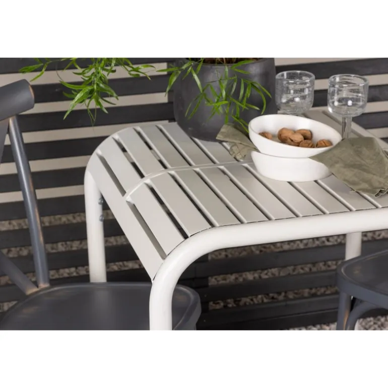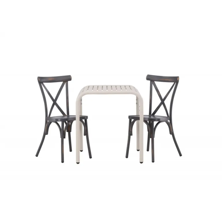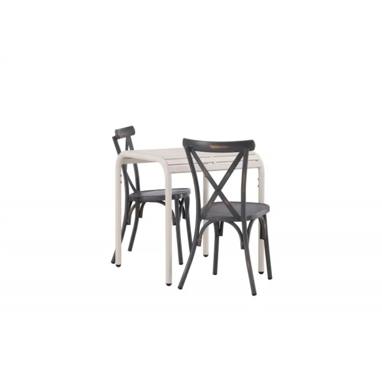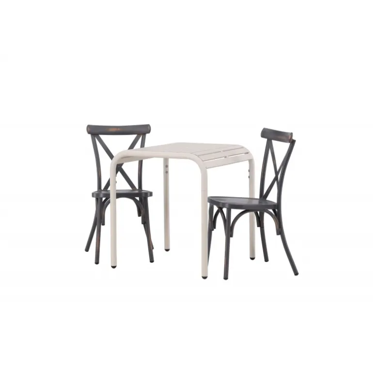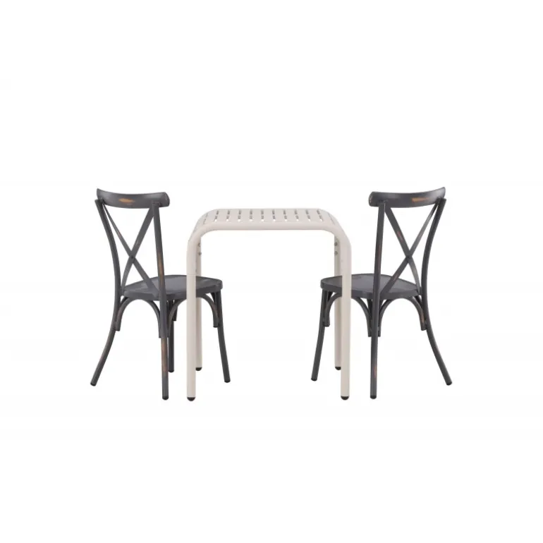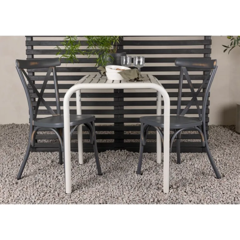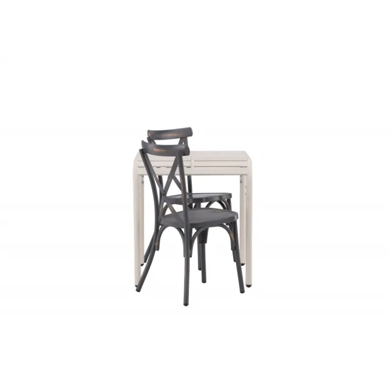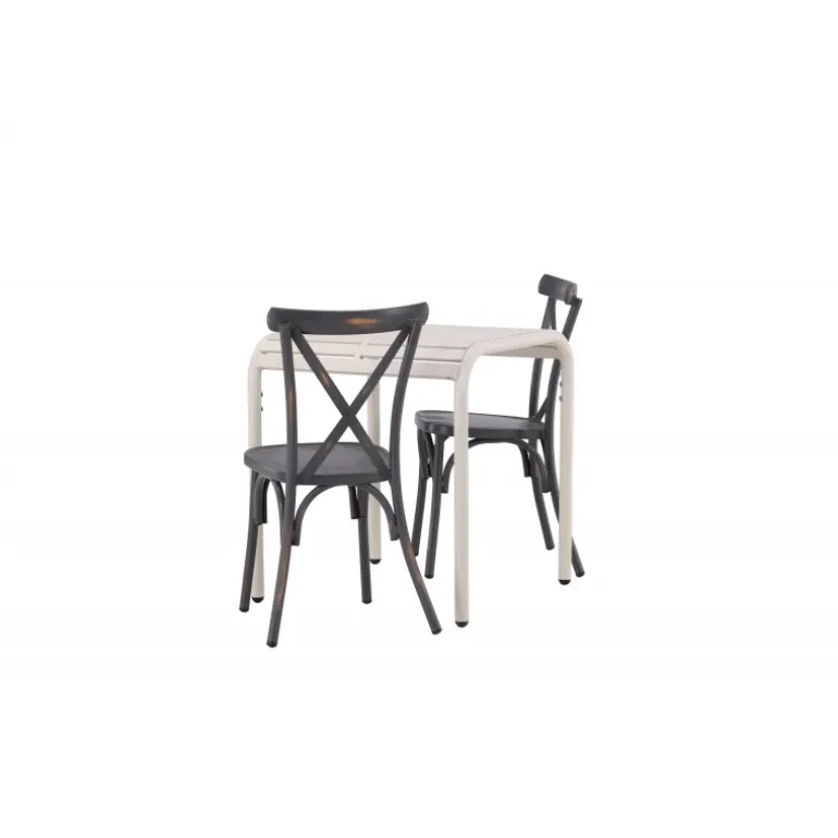 Den perfekte kaffebordgruppe til din terrasse! Dette cafébord fra Borneo-serien har et tidløst skandinavisk design. Bordpladen er ribbet og bølger ned langs kanterne ved benene. Alt sammen lavet af beige aluminium, hvilket giver dig et holdbart bord, der er let at flytte rundt. Her sammen med 2 spisestole fra Tablas-serien. Stolen har et krydset ryglæn og let udfladede ben for et stabilt indtryk. Alt i alt lavet af aluminium i en sodsort farve. Tag din kaffepause udenfor denne sommer og nyd frie øjeblikke sammen! Bordmål: 70×70 cm.