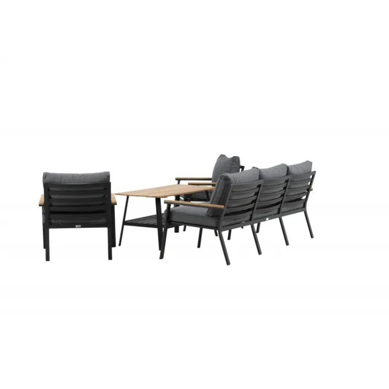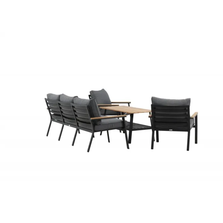 Oplev ultimativ komfort og stil med vores Brasilia Sofa Sæt. Dette moderne og stilfulde sæt inkluderer en tre-personers sofa, to ramme lænestole og et sofabord, komplet med grå puder. Sofaen og lænestolene har en ramme lavet af sort pulverlakeret metal med integrerede armlæn med teakdetaljer. Sofabordet har en ramme af sort pulverlakeret metal med en teakbordplade. Lettere samling kræves. Perfekt til enhver udendørs samtaleområde.