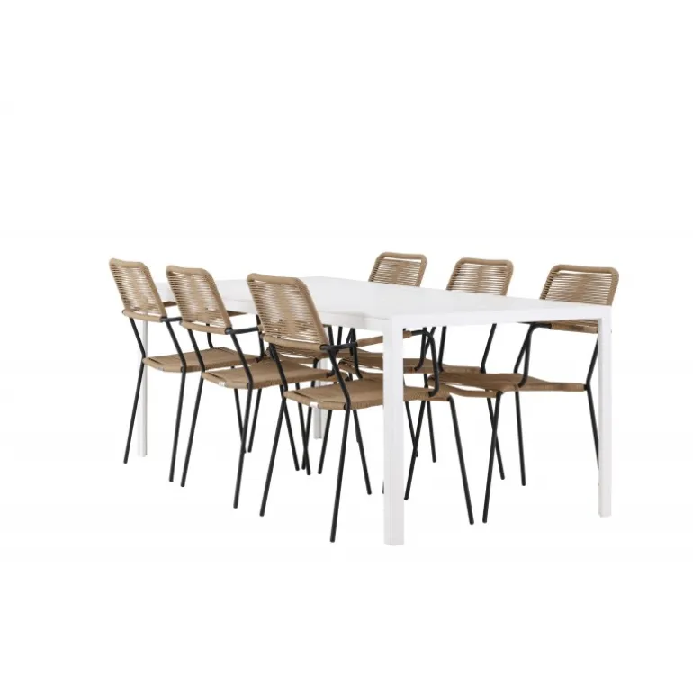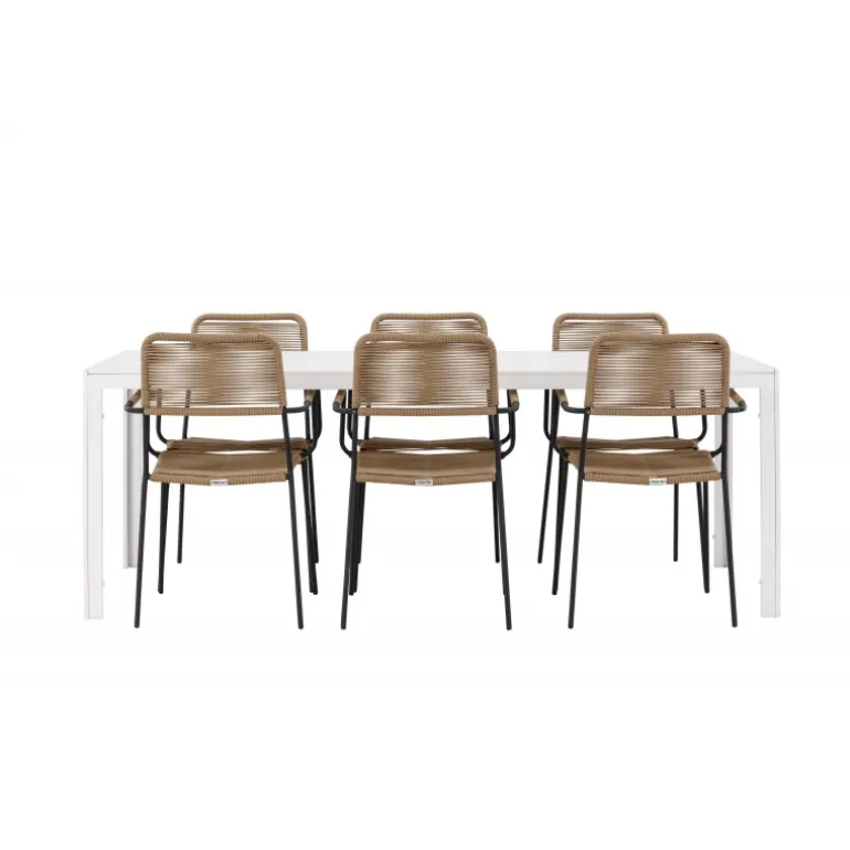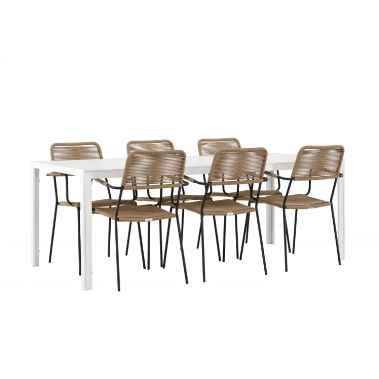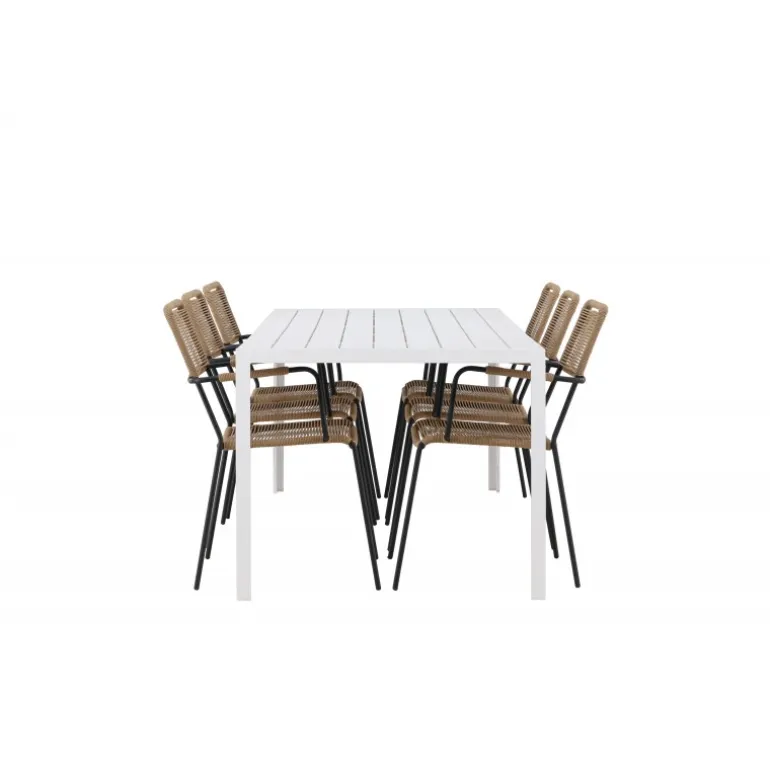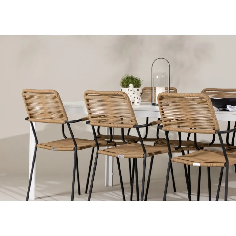 Oplev den perfekte kombination af rustik charme og trend-sættende design med vores eksklusive Loungesæt – Havemøbelsæt, komplet med seks elegante Lindos stole og det slanke Break bord. Dette ensemble er skabt til at fremkalde en varm følelse og skabe en indbydende atmosfære til sammenkomster med venner og familie. Lindos stolene, med deres brune reb sæder og sorte stålrammer, tilbyder både komfort og holdbarhed. Deres naturlige udseende tilføjer et rustikt touch til din udendørs plads. Break bordet fungerer som det perfekte midtpunkt for din udendørs spiseoplevelse, med en hvid aintwood bordplade og en aluminiumsbase, der udstråler moderne elegance. Med generøse dimensioner på 205×75 cm, er det komfortabelt til at rumme seks personer til hyggelige udendørs sammenkomster. Dette Loungesæt – Havemøbelsæt er mere end blot et funktionelt udendørs møbel; det er et symbol på fællesskab og sammenhold. Skab minder og nyd hvert øjeblik med vores varme og trend-sættende Lindos og Break Loungesæt – Havemøbelsæt.