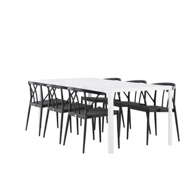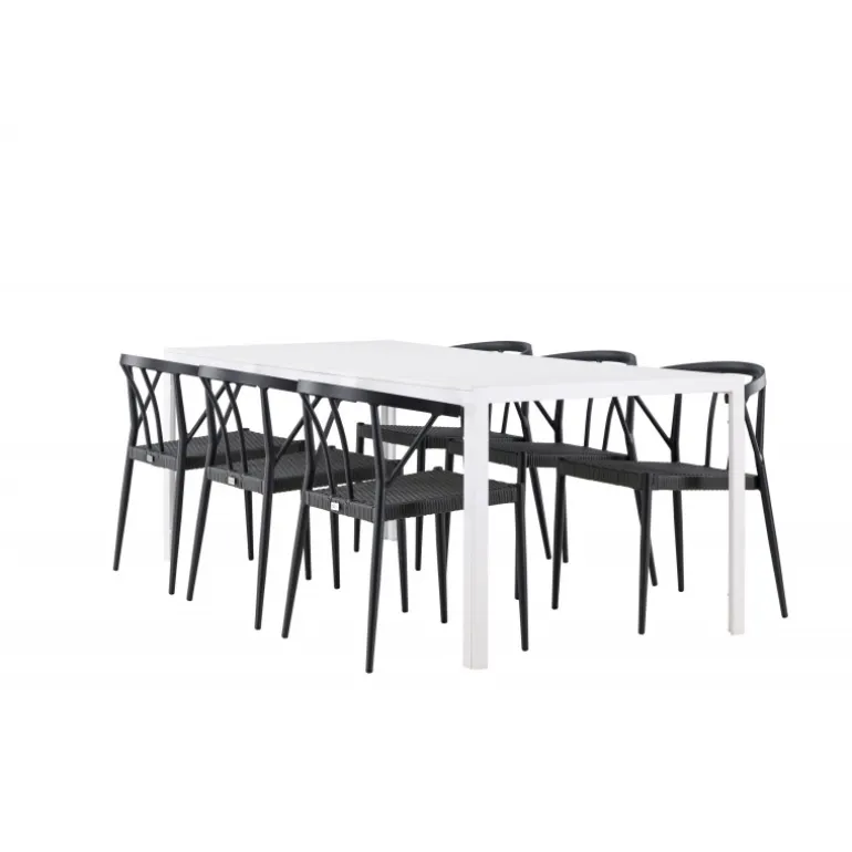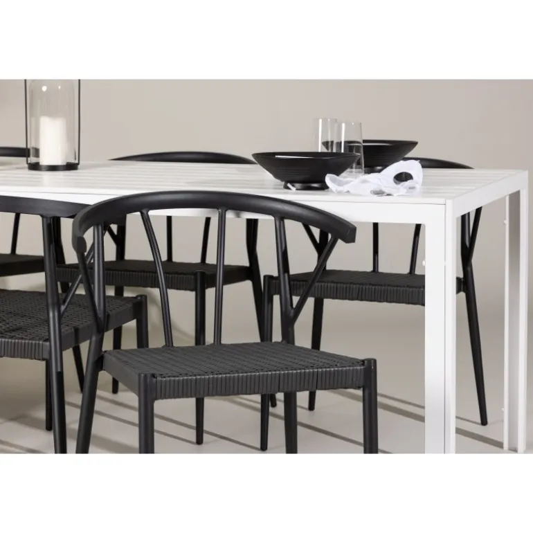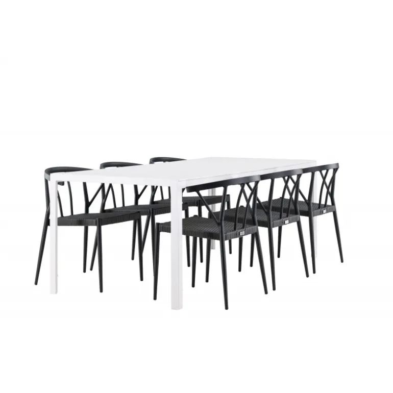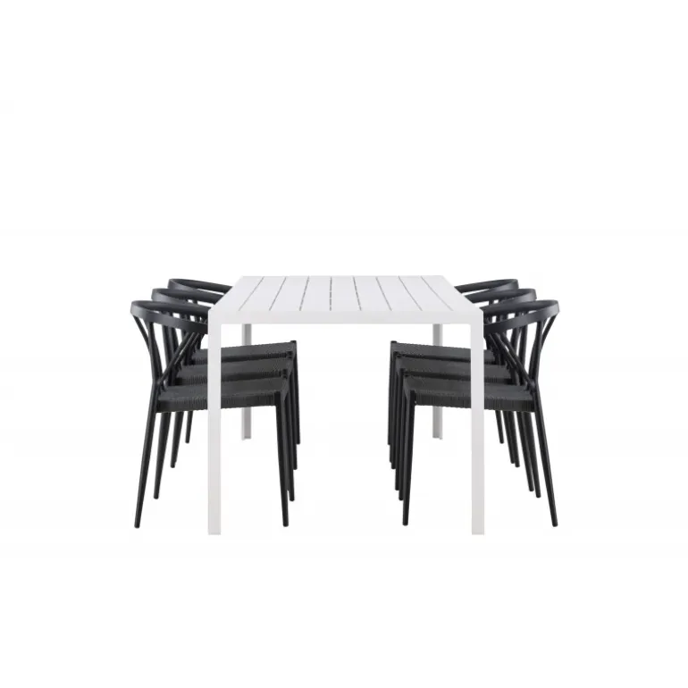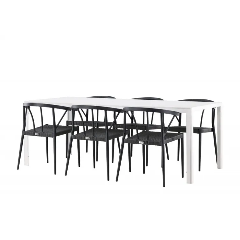 Oplev det perfekte samlingssted for fællesskab og stil med vores nye Loungesæt – Havemøbelsæt – Stina og Break. Med et imponerende design og en neutral følelse vil dette ensemble løfte dine udendørsområder til et nyt niveau. Stina-stolene kombinerer elegance og komfort. Med en sort farve og sæder lavet af syntetisk rattanmateriale tilbyder de både stil og komfort. Stolens ramme er lavet af aluminium, hvilket giver stabilitet og et moderne touch til det overordnede design. Break-bordet er midtpunktet i dette Loungesæt – Havemøbelsæt. Med en hvid bordplade lavet af aintwood-materiale og en aluminiumsramme skaber det et imponerende og slankt udseende. Med målene 205×75 cm tilbyder det masser af plads til seks personer, perfekt til at samle dine kære til måltider og samtaler udendørs. Dette Loungesæt – Havemøbelsæt er ideelt til udendørs brug og fungerer som en stilfuld erklæring og indretningsdetalje med sin imponerende tilstedeværelse. Med seks inkluderede stole er dette sæt komplet til at skabe mindeværdige øjeblikke og løfte dit udendørsområde til et nyt niveau af stil og komfort.