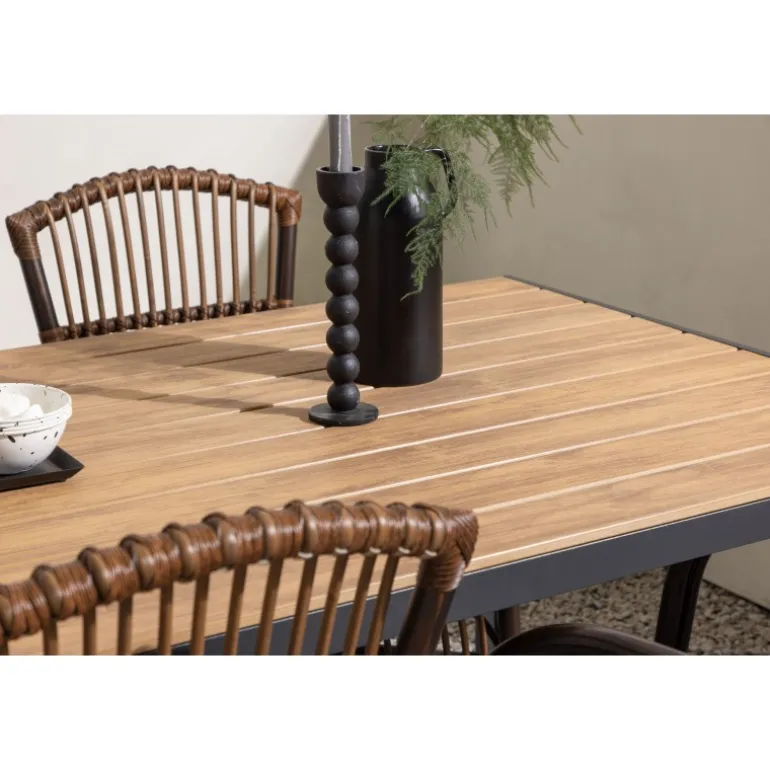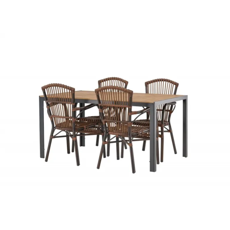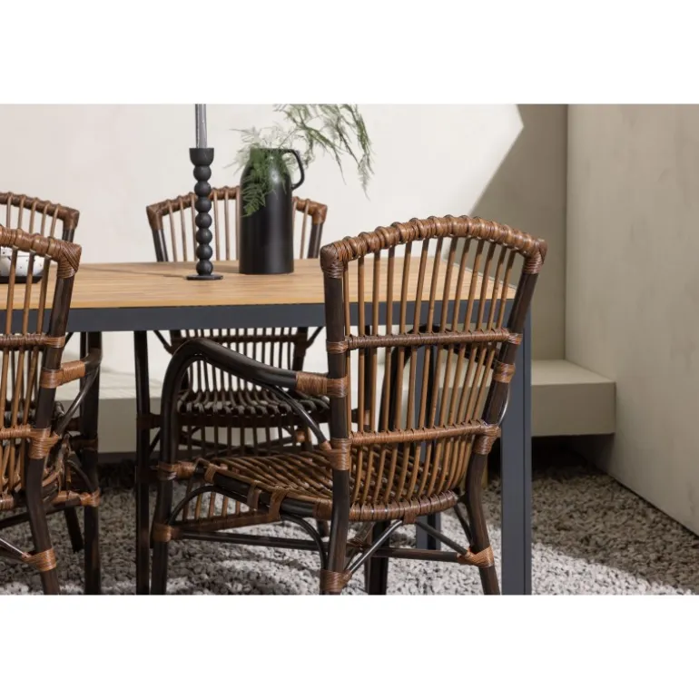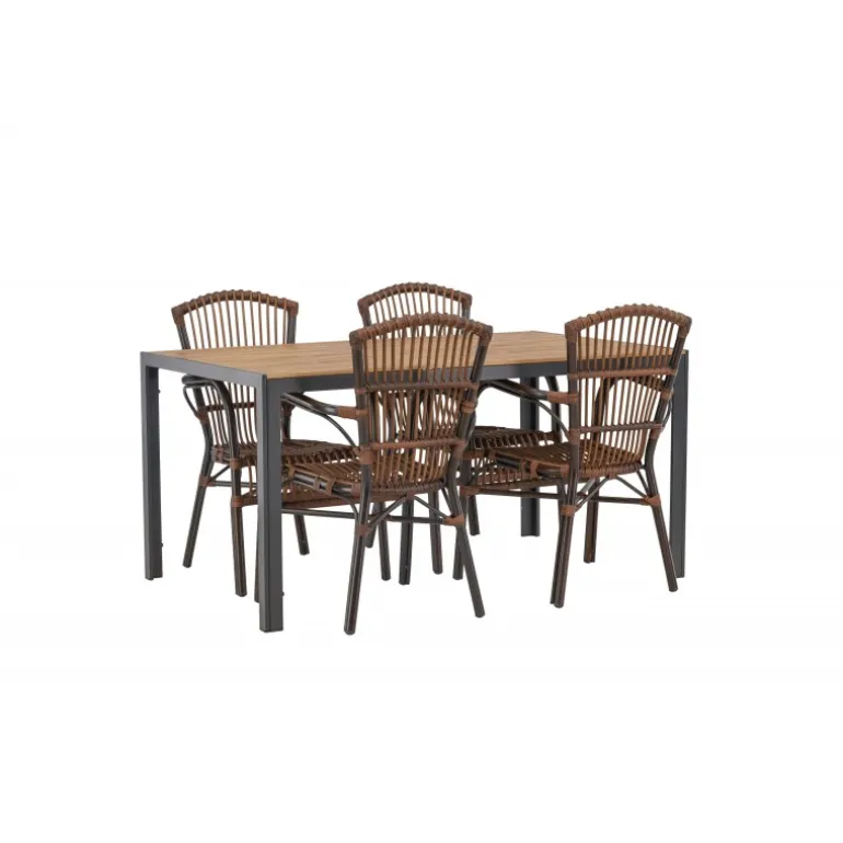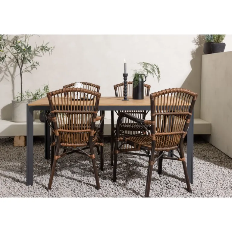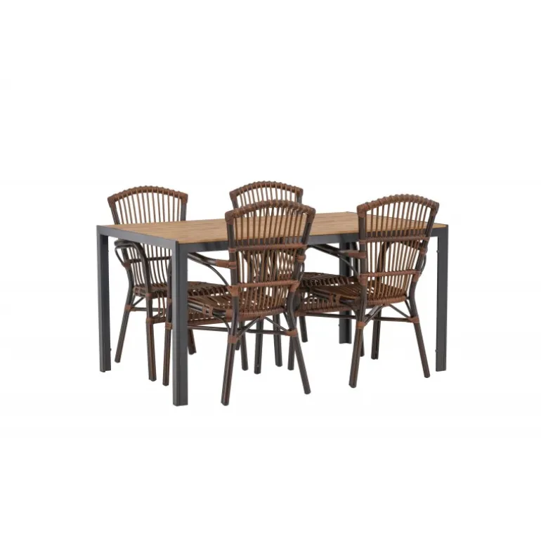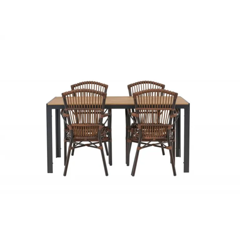 Dette Loungesæt – Havemøbelsæt imponerer med sit tidløse design og høje komfort! Vores rektangulære spisebord Break har lige former i klassisk nordisk design med en bordplade i krydsfiner og bordben i sort aluminium. Her sammen med 4 af vores populære spisebordsstole fra Galera-serien. Stolen har en moderne farve i valnød og et smagfuldt design i flettet kurvemateriale. Den robuste aluminiumsramme har høje armlæn for ekstra komfort og en dejlig sædedybde, der gør det behageligt at sidde længe. Nyd lækre måltider denne sommer! Bordmål: 150×90.