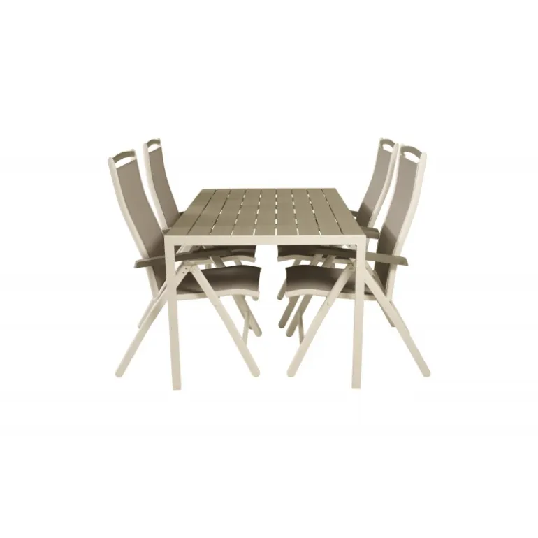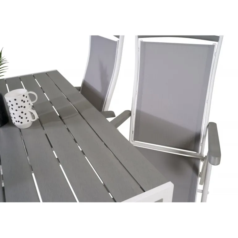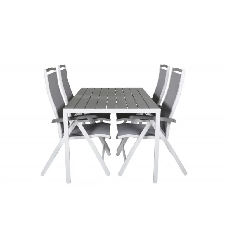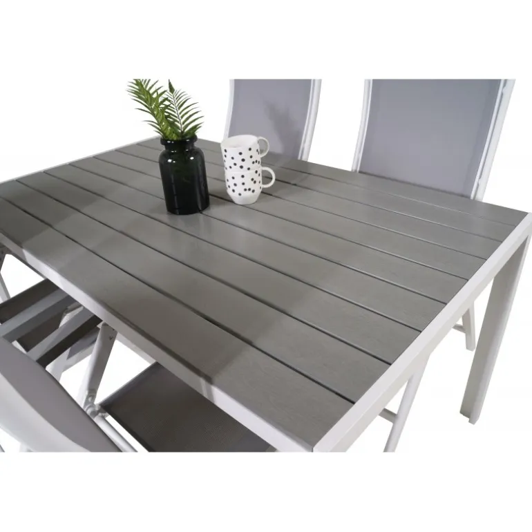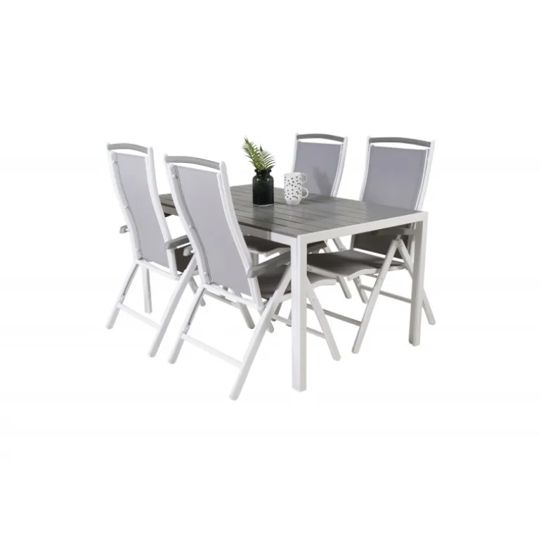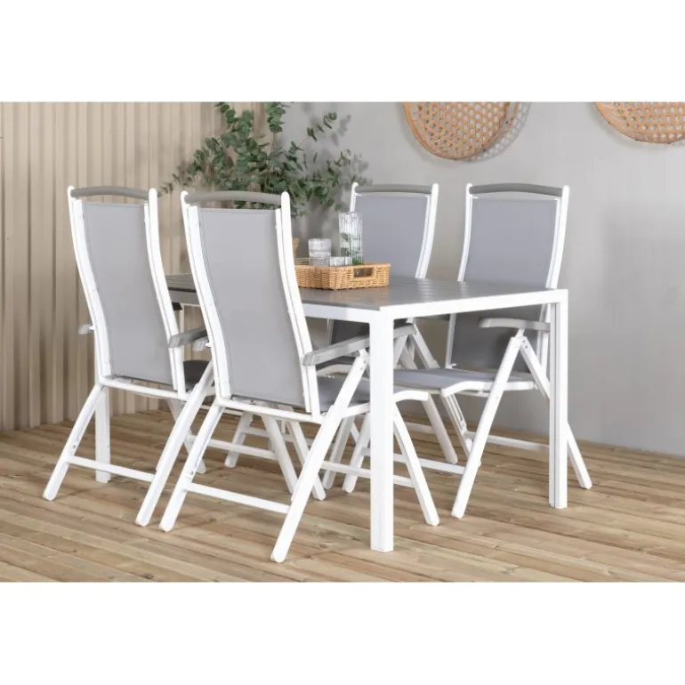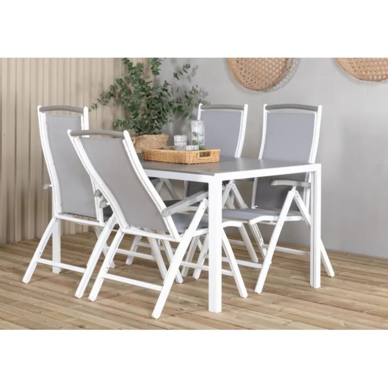 En moderne madgruppe i lækre gråtoner! Klassisk stil spisebord er både tidsløst og praktisk. Her sammen med de komfortable spisebordsstole fra Albany-serien med foldbar ryglæn. Saml familie og venner og nyd varme sommeraftener på terrassen! Montering krævet.