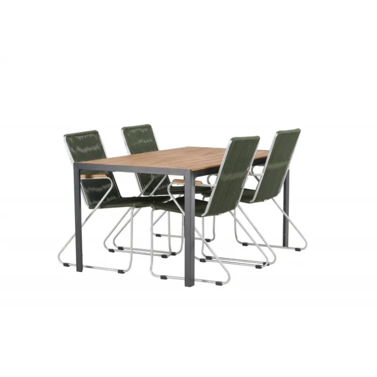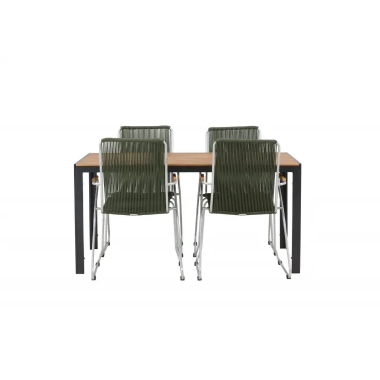 Bryt op med de enkle farver med en iøjnefaldende farvekombination – her får du en Loungesæt – Havemøbelsæt, der imponerer! Det rektangulære spisebord Break har lige nordiske former med en bordplade af krydsfiner og sorte aluminium bordben. Her i en unik kombination med 4 grønne spisestole fra Bois-serien. Denne stol har et komfortabelt zinkkonstruktion design, sæde i grønt reb og dekorative armlæn i teak. Loungesæt – Havemøbelsætn er udendørsmodstandsdygtig og passer lige så godt på terrassen som i havestuen! Bordmål: 150×90 cm.