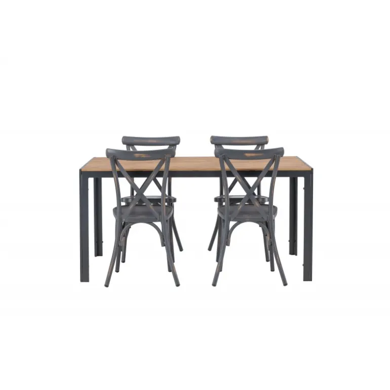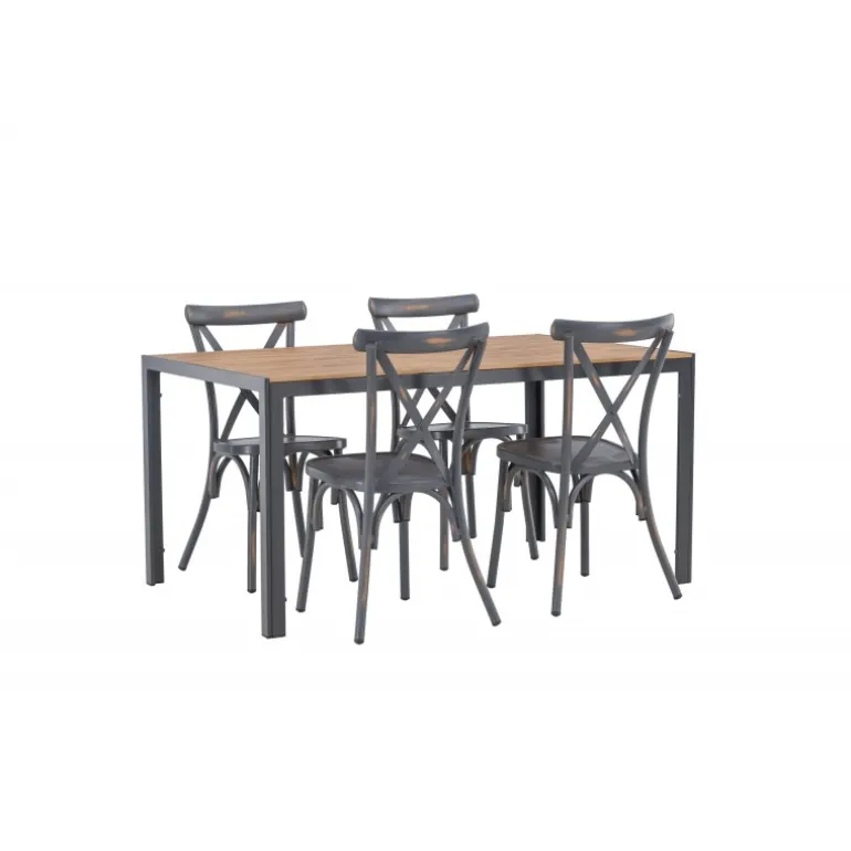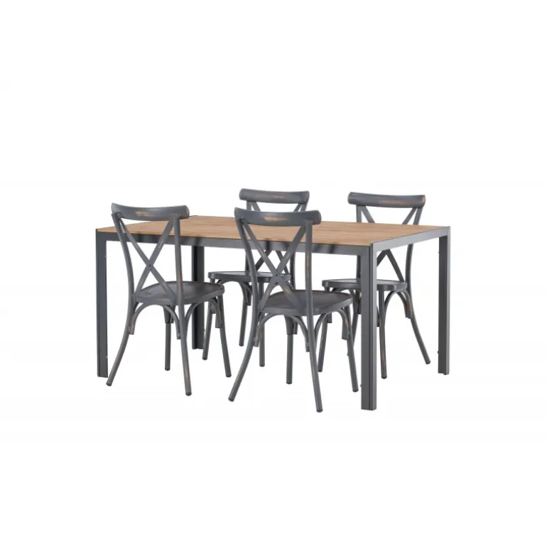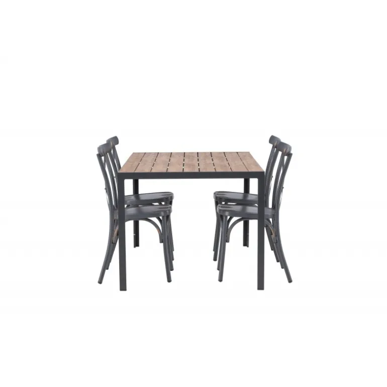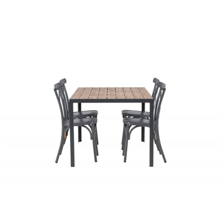 En Loungesæt – Havemøbelsæt med en fantastisk skandinavisk design! Vores rektangulære spisebord Break har lige former i klassisk nordisk design med en bordplade i aintwood og bordben i sort aluminium. Her i stilfuld kombination med 4 spisestole fra serien Tablas. Stolen har en industriel stil og er lavet af holdbart aluminium i en sodet sort farve. Indret i udestuen eller på terrassen for at nyde fremtidige måltider udendørs! Bordmål: 150×90.