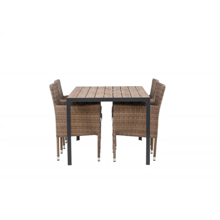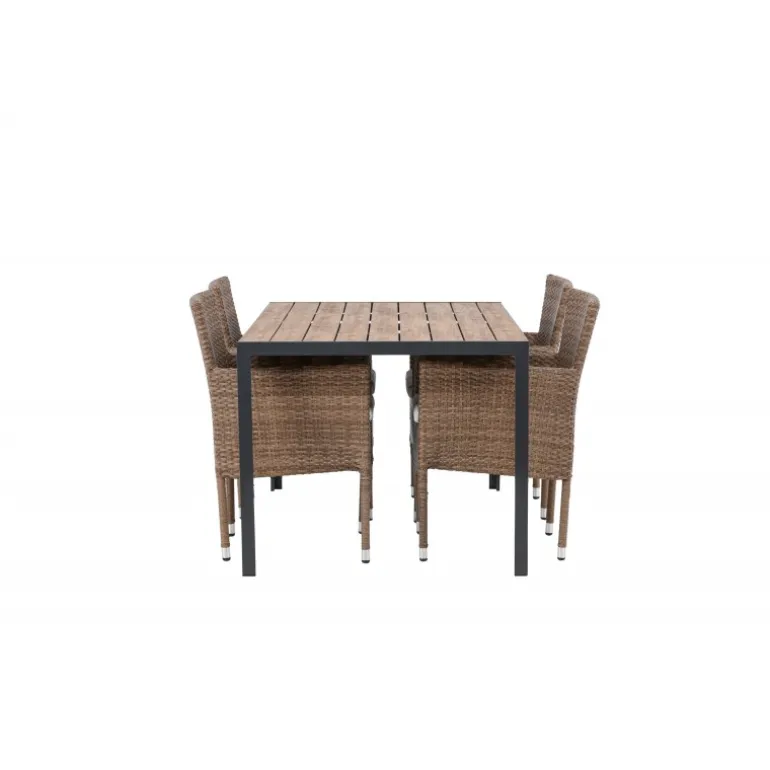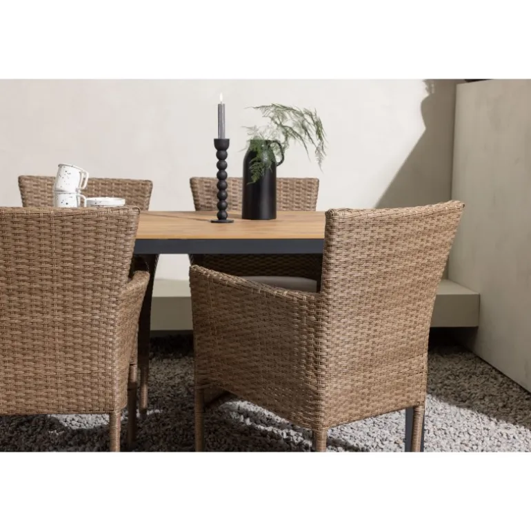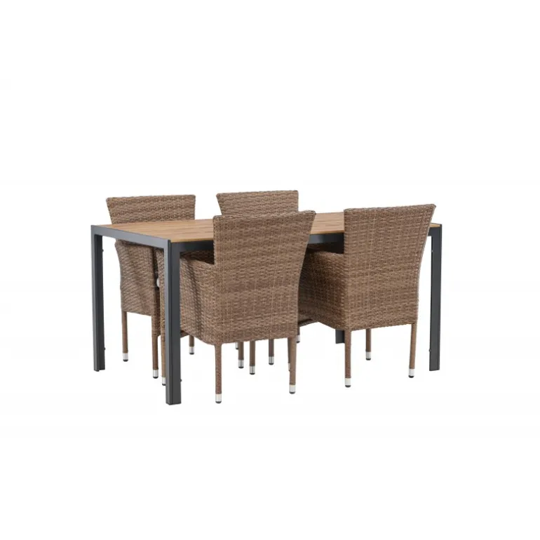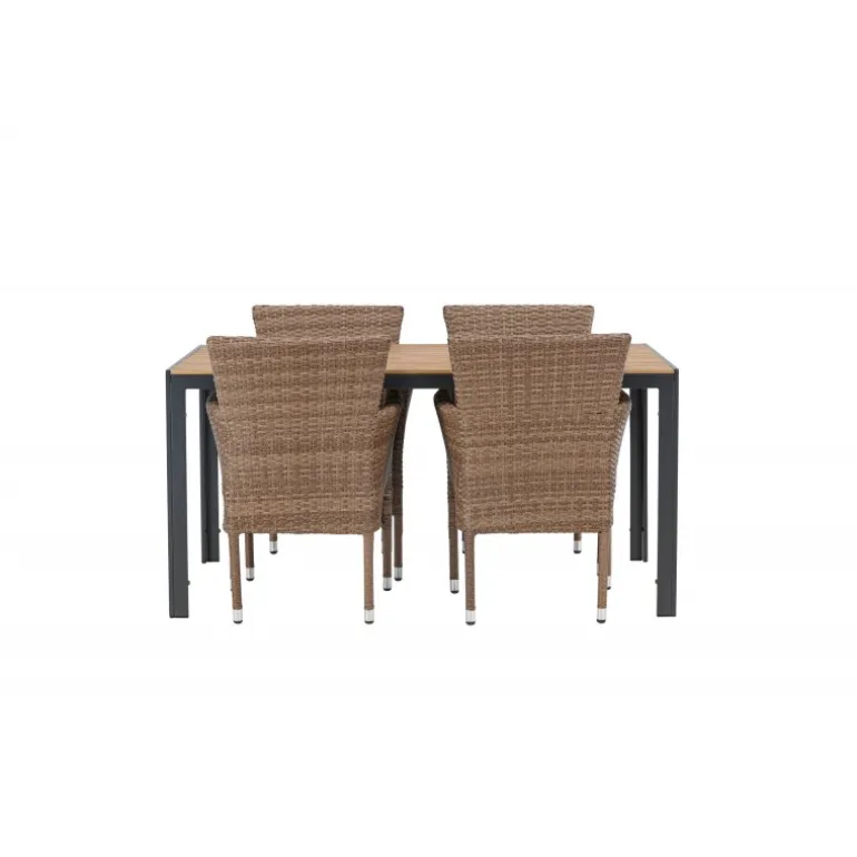 Dette Loungesæt – Havemøbelsæt imponerer med sit trend-sikre design og høje komfort! Vores rektangulære spisebord Break har lige linjer i klassisk nordisk design med en bordplade i aintwood og bordben i sort aluminium. Spisebordsstolene tilhører Malina-serien og er garanteret at stå tidens prøve. Stolen har en ramme i aluminium og er polstret i fletflettet, beige kunstig rattan. Inviter til mange vidunderlige måltider udendørs i fremtiden! Bordmål: 150×90.