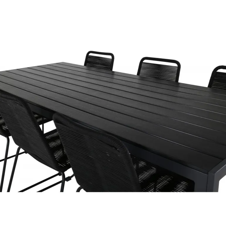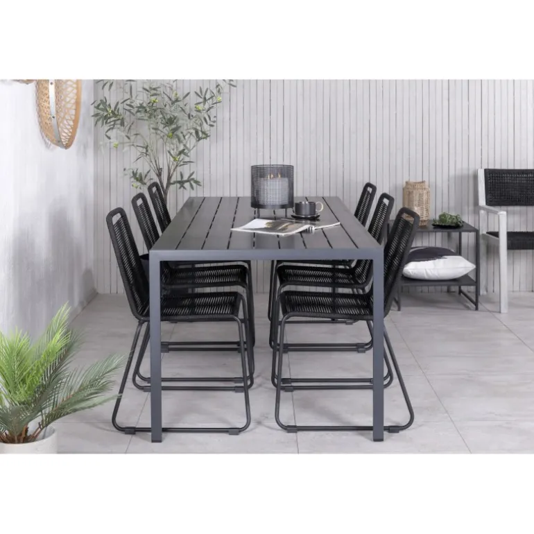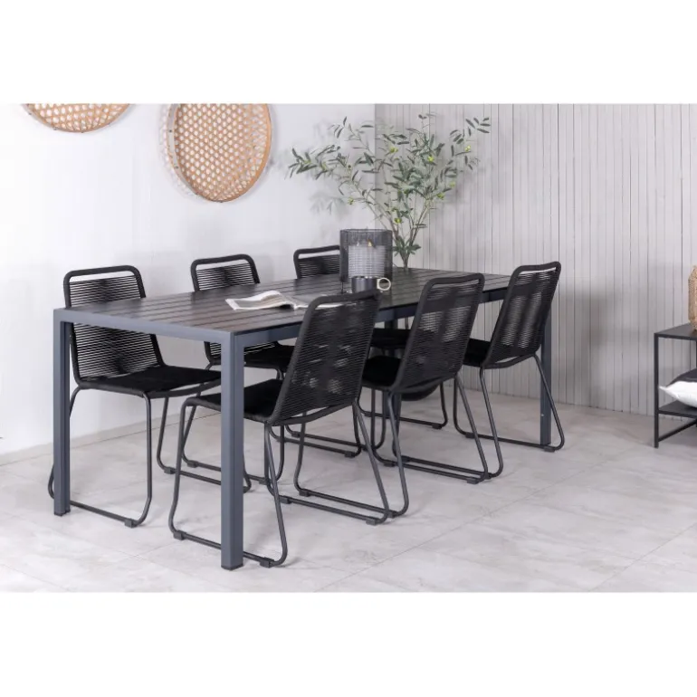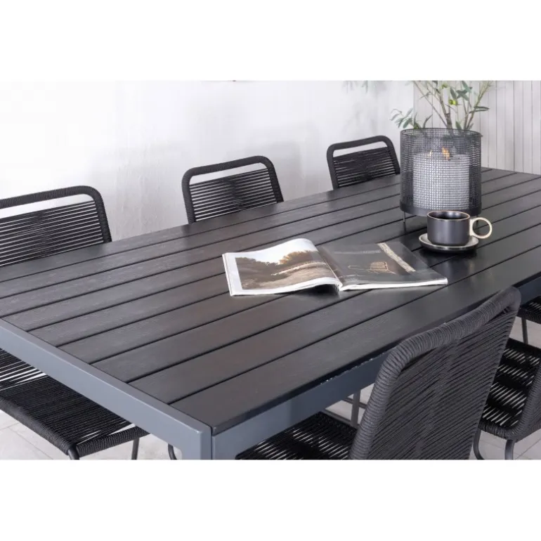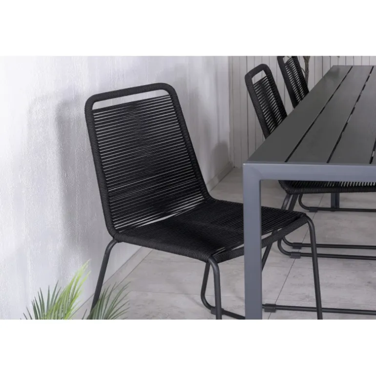 Klassisk Loungesæt – Havemøbelsæt med en indbydende følelse, der passer til de fleste terrasser! Spisebordet Break sammen med sorte spisebordsstole fra Lindos-serien er perfekt til dem, der ønsker at skabe en trendy og tidløs atmosfære. Forbered dig på sommerens dejlige nætter!