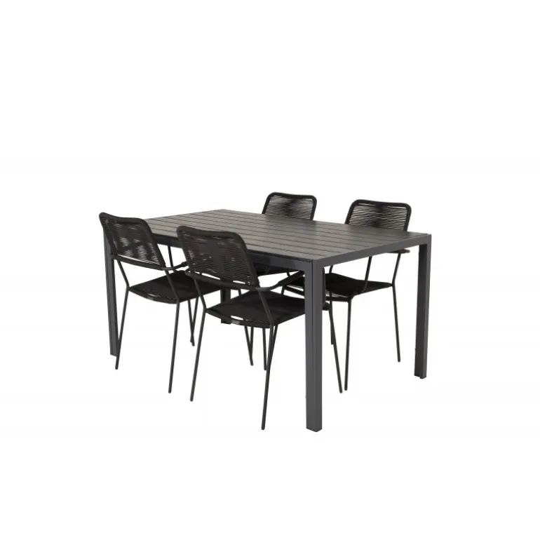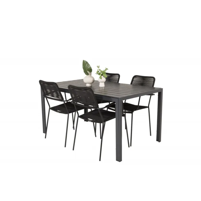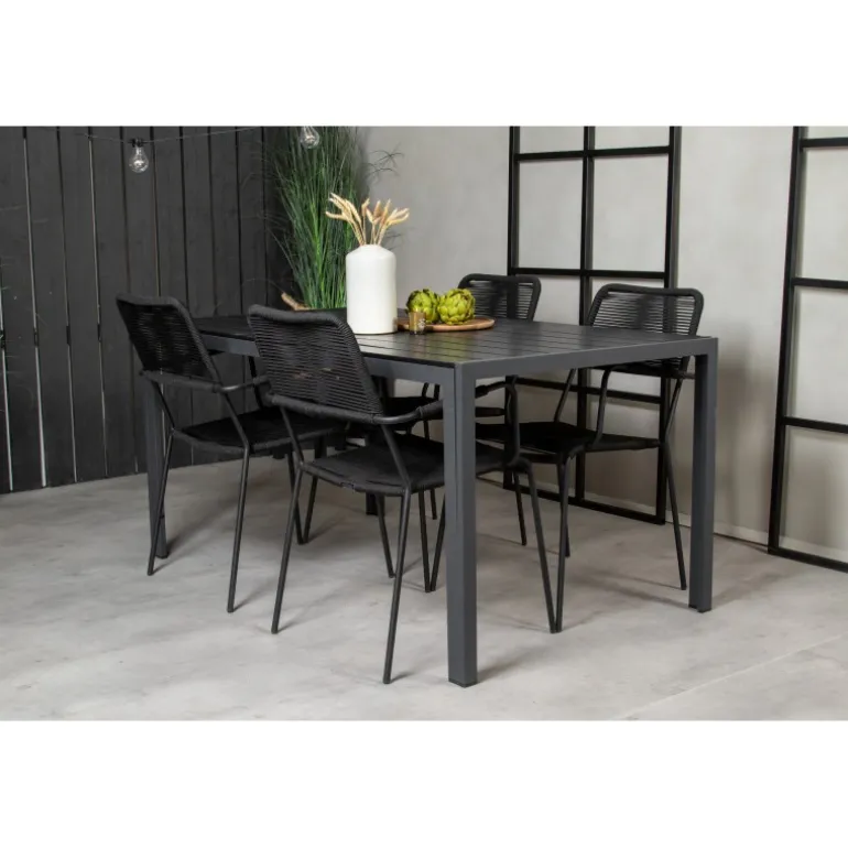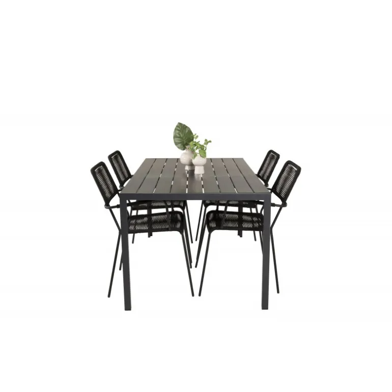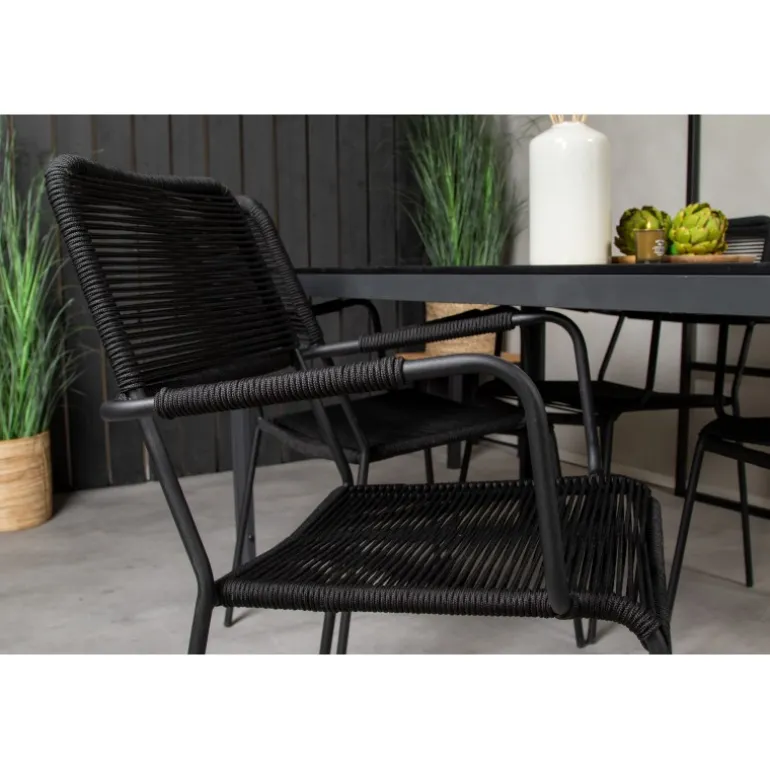 Et trendy Loungesæt – Havemøbelsæt perfekt til terrassen! Det klassiske spisbord har en lækker polywood bordplade. Her sammen med vores moderne spisebordsstole Lindos med sæde i sort flettet reb. Lad din terrasse blive prydet af dette iøjnefaldende Loungesæt – Havemøbelsæt og nyd sene sommeraftener!