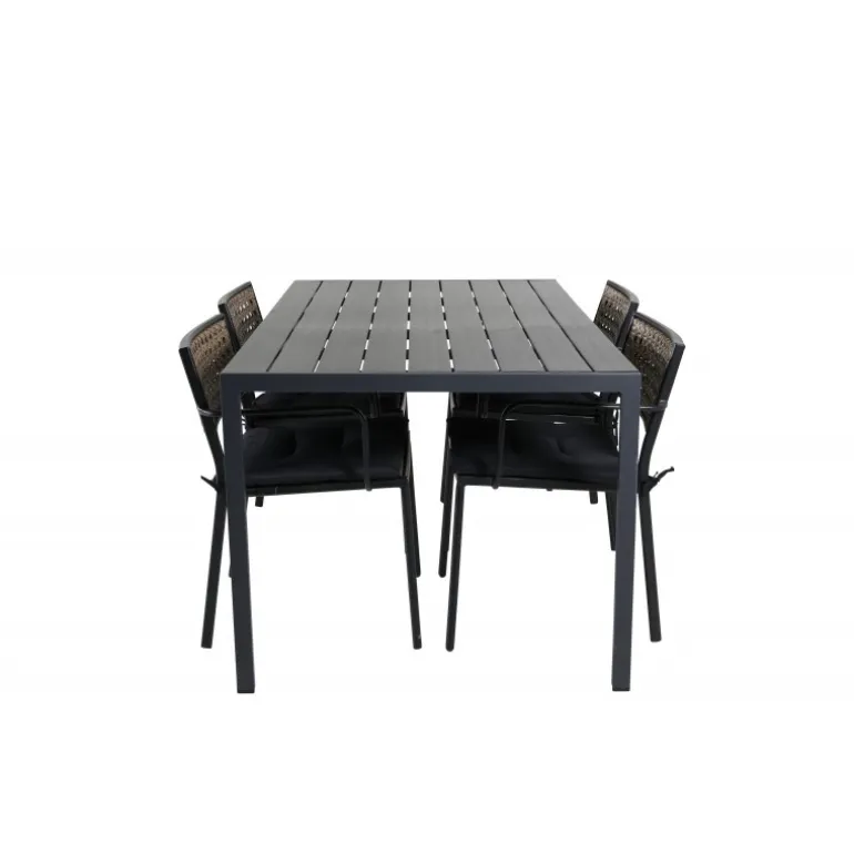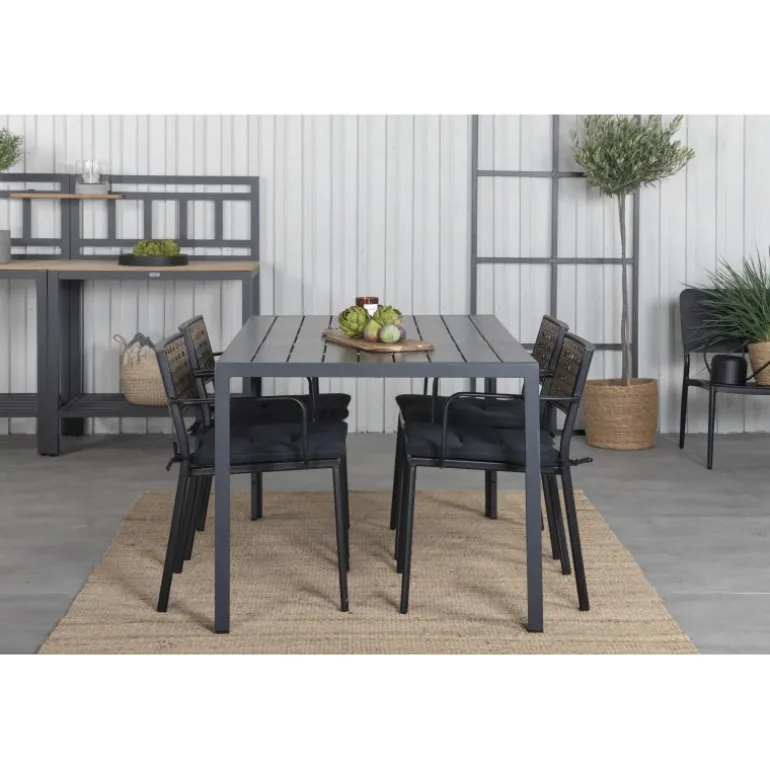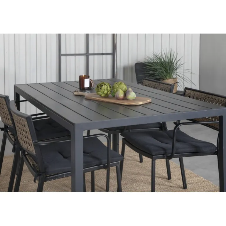 En harmonisk Loungesæt – Havemøbelsæt til sommermåltider! Paola spisebordsstol er en perfekt blanding af dekorativt træ og stilfuld sort farve. De fine kontraster mellem farverne skaber en harmonisk følelse i udendørsområdet! Her i perfekt kombination med vores rektangulære spisebord Break i sort aluminium og bordplade i aintwood. Simpelthen en gennemtænkt Loungesæt – Havemøbelsæt, som du nemt kan skabe charmerende udendørsmiljøer med!