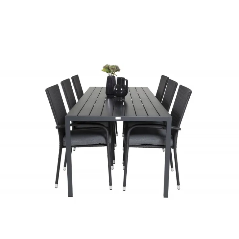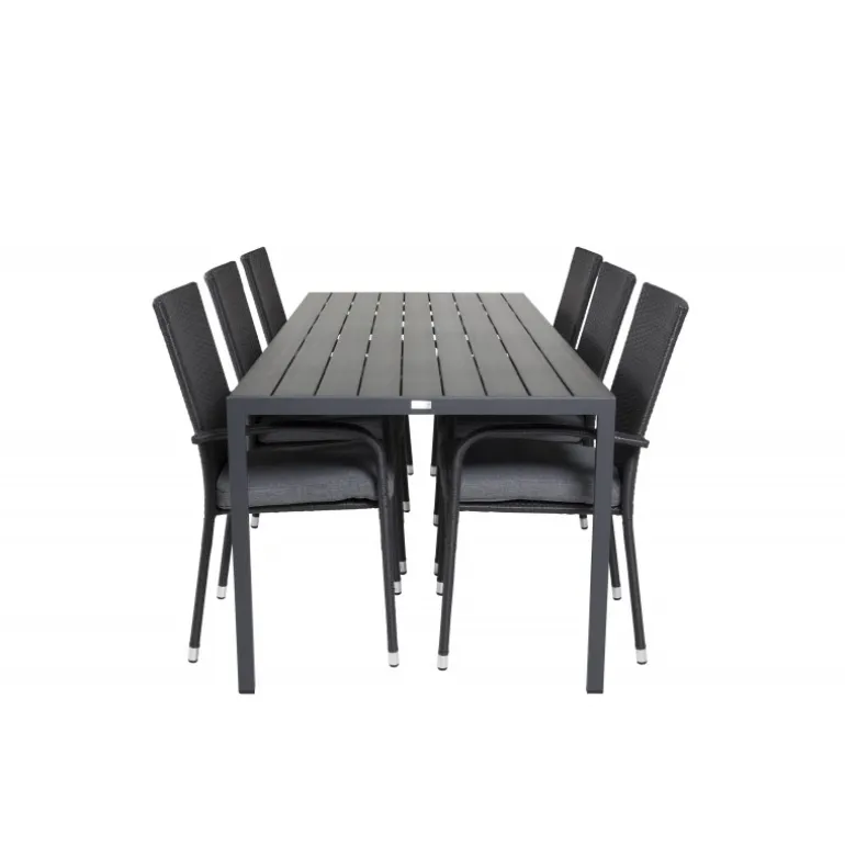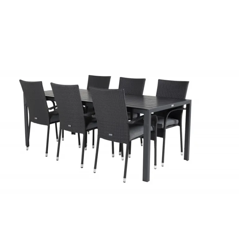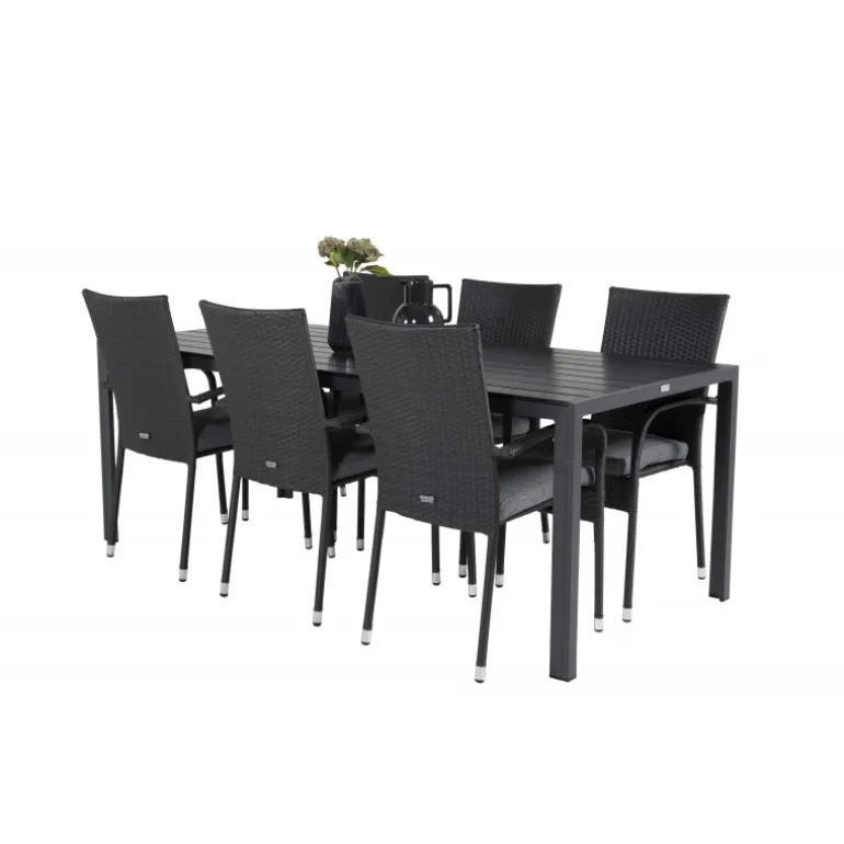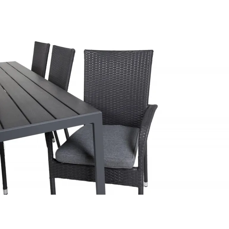 I et konsekvent sort og elegant design får du et Loungesæt – Havemøbelsæt, der står tidens prøve. Spisebordet Break med vores sorte, stilfulde spisebordsstole Anna i kunstig rattan.