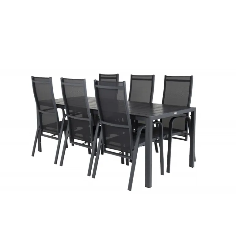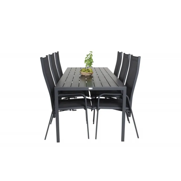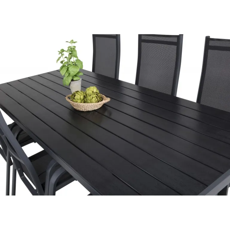 Vores stilfulde dining table Break er kombineret med de siddevenlige og foldbare stole Copacabana. Madgruppen er elegant matchet i sort. Inviter til mange sociale øjeblikke fremover!