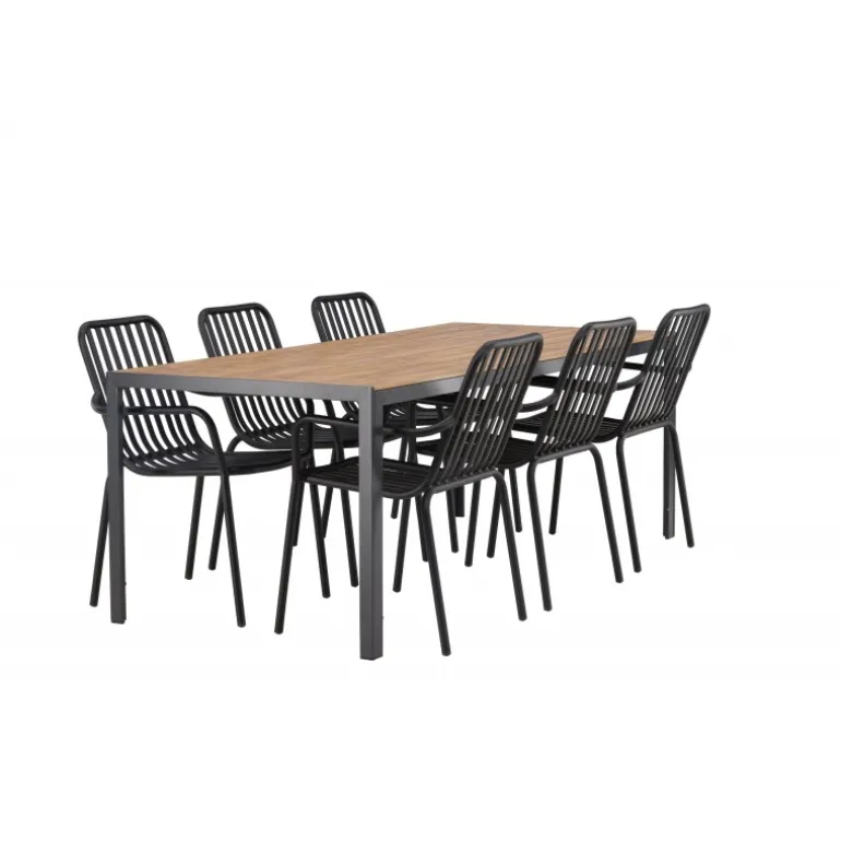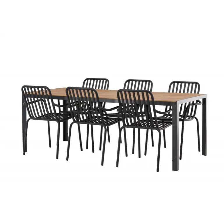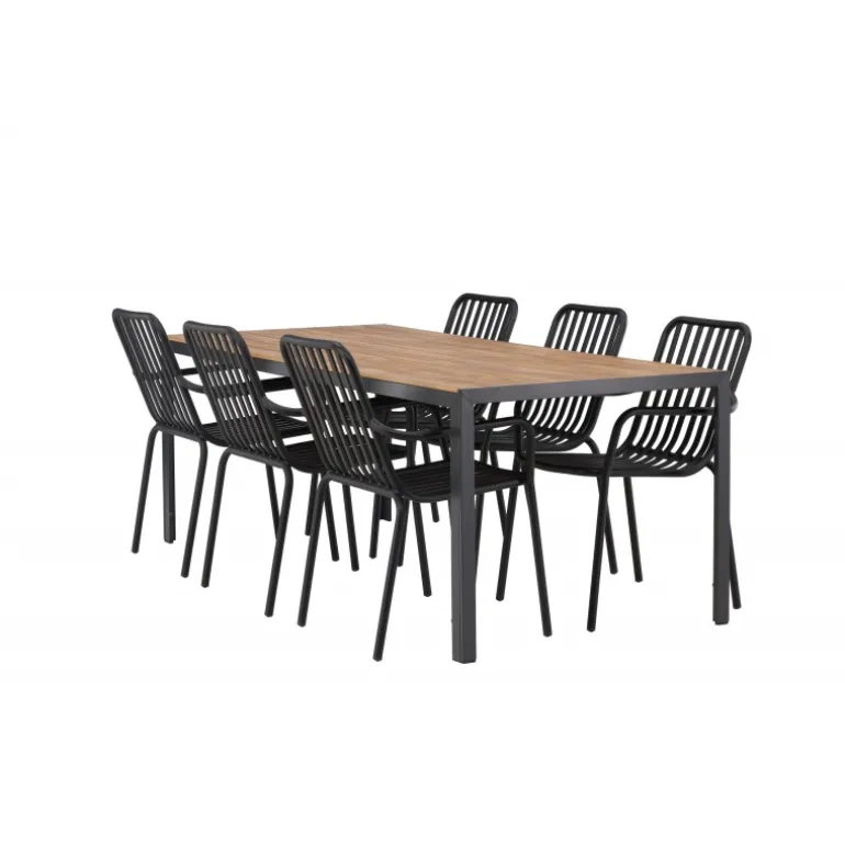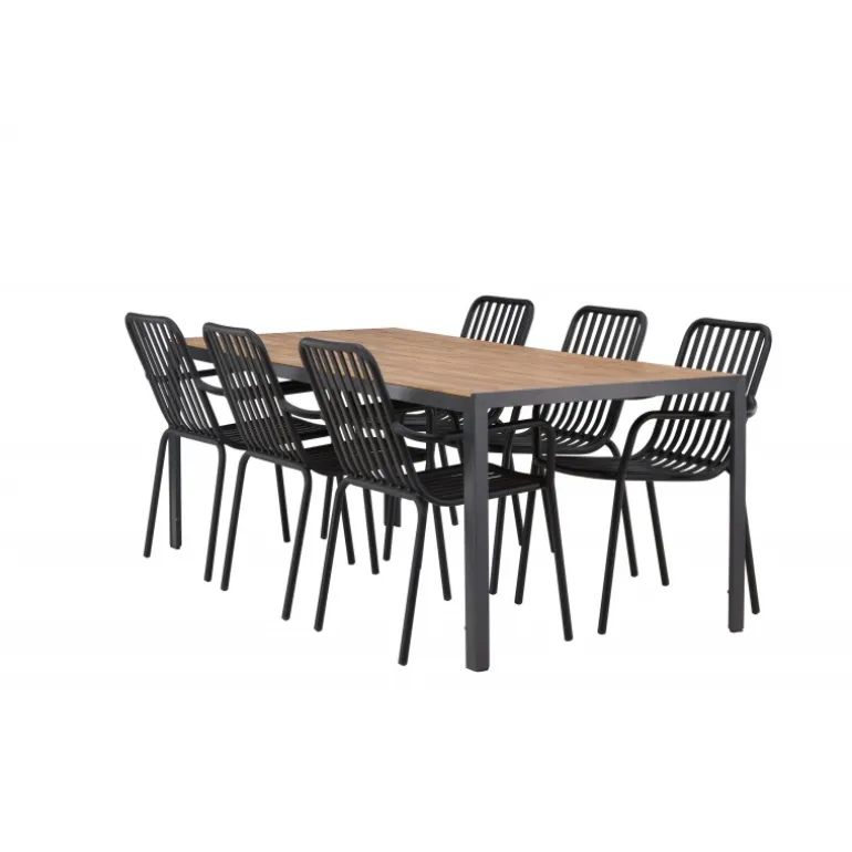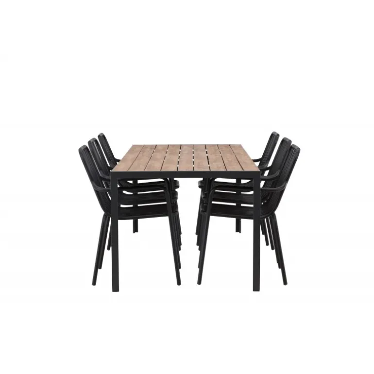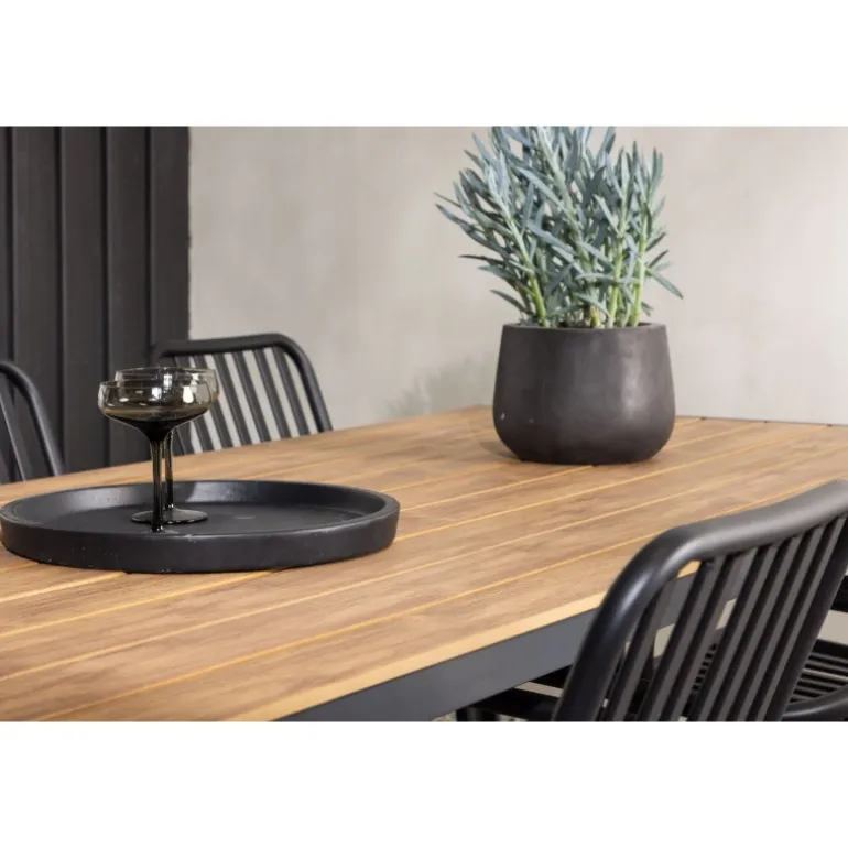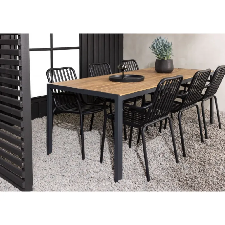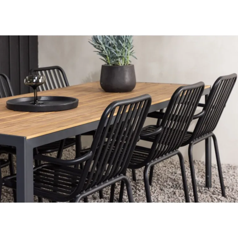 Opret et trendy blikfang på din terrasse med et Loungesæt – Havemøbelsæt, der matcher! Vores rektangulære spisebord Break har lige linjer i klassisk nordisk design med en bordplade i aintwood og bordben i sort aluminium. Her i stilfuld kombination med spisestole fra Beijing-serien. Stolens ribbede design og sodsorte farve får den til at føles både moderne og tidløs. Lavet af aluminium med en let vægt, der gør det nemt at flytte rundt på, og integrerede armlæn for ekstra komfort. Her kan du sidde længe og nyde din terrasse! Bordmål: 200×90 cm.