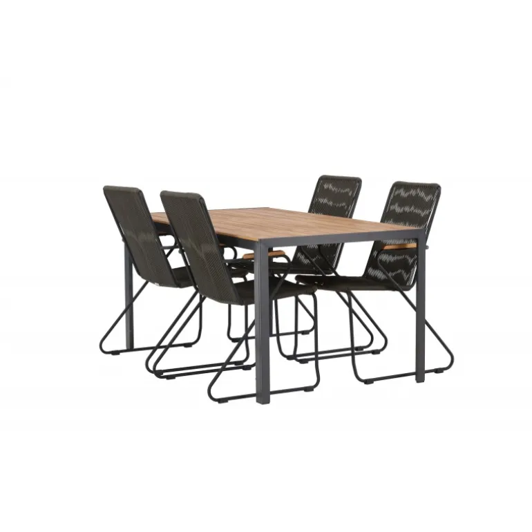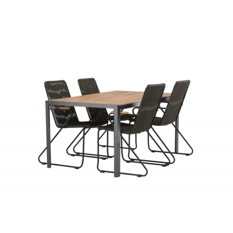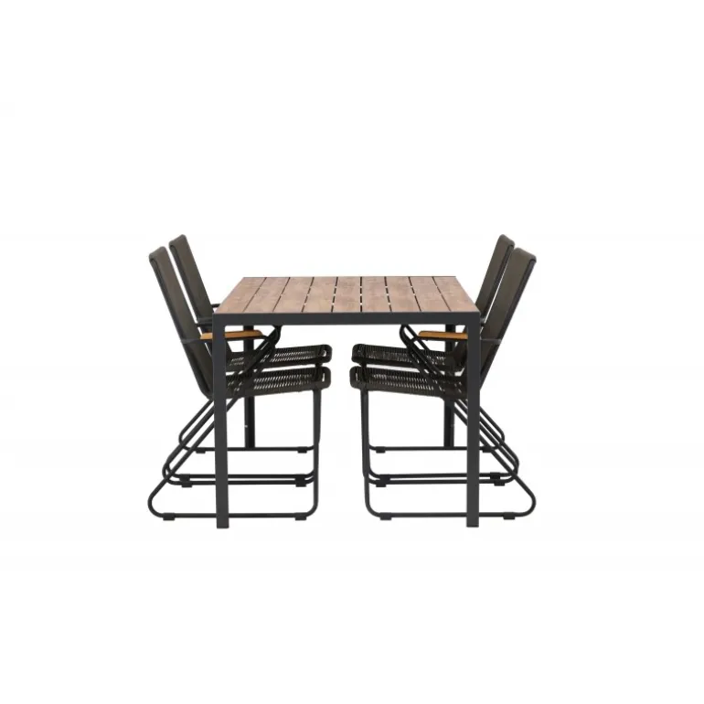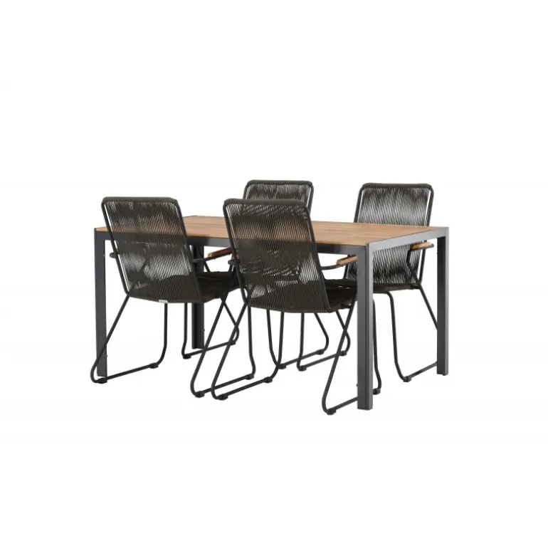 Nyd sommermåltiderne med et tidløst og komfortabelt Loungesæt – Havemøbelsæt! Vores rektangulære spisebord Break har lige linjer i klassisk nordisk design med en bordplade i finér og bordben i sort aluminium. Her i perfekt kombination med 4 spisebordsstole fra Bois-serien. Stolen har et komfortabelt design med armlæn i teak, mørkegråt sæde i reb og stel i sort stål. Gør familien klar til en enestående sommeraften! Bordmål: 150×90 cm.