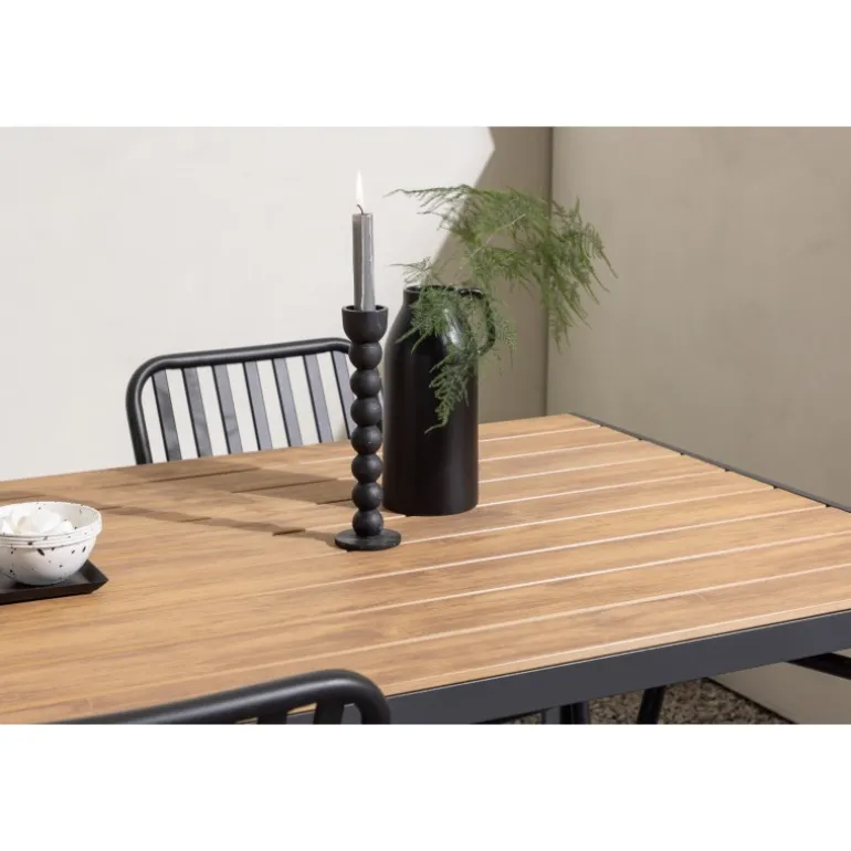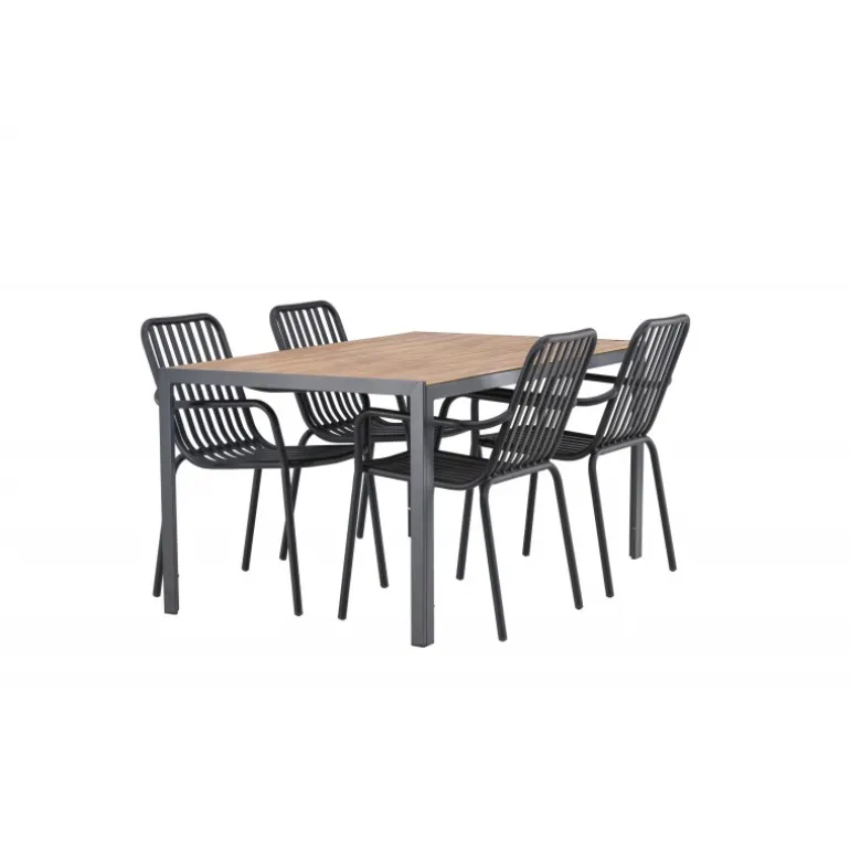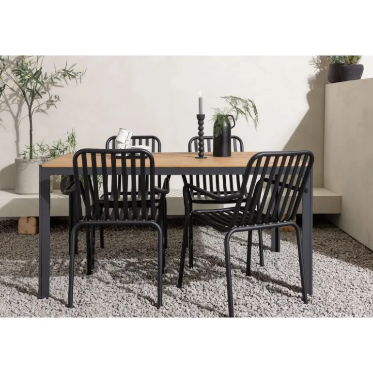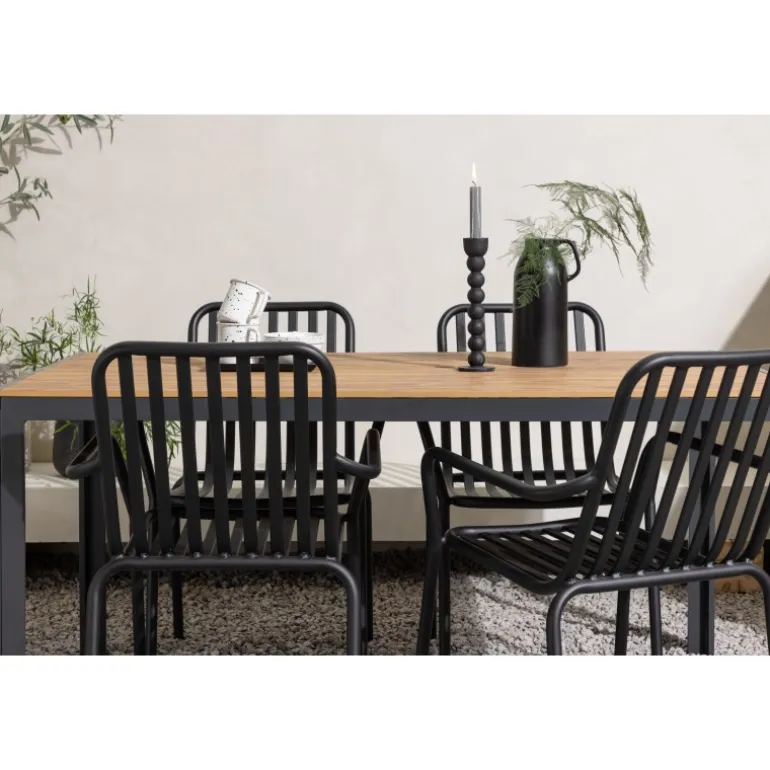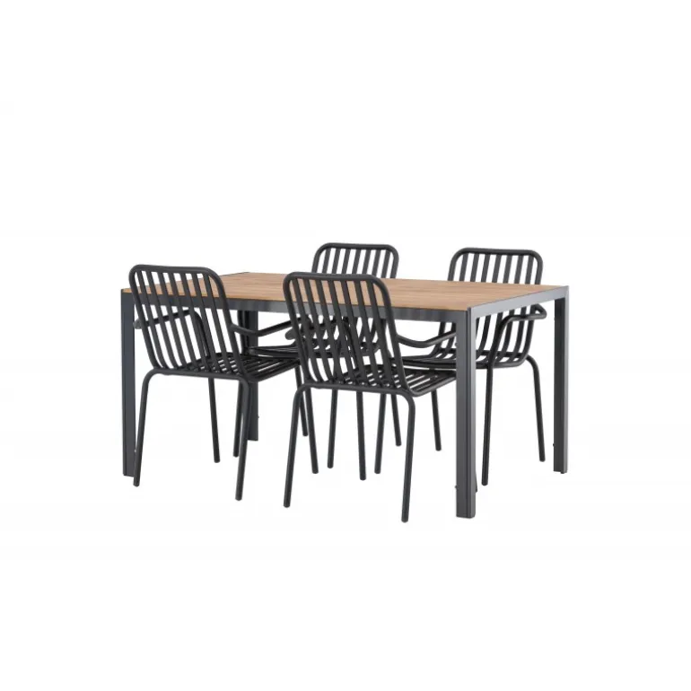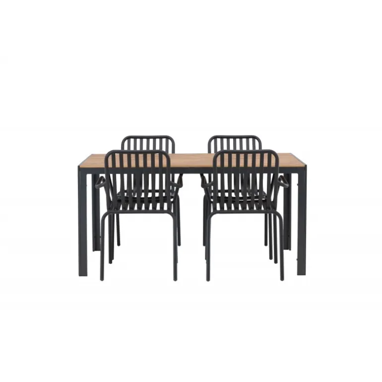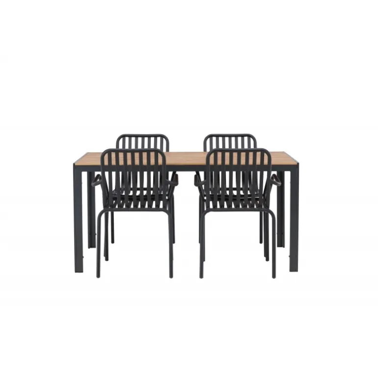 Skab en trendy stemning på din terrasse med et Loungesæt – Havemøbelsæt, der virkelig matcher! Vores rektangulære spisebord Break har lige linjer i klassisk nordisk design med en bordplade i krydsfiner og bordben i sort aluminium. Her i en stilfuld kombination med 4 spiseborde fra serien Beijing. Stolens ribbede design og sodsorte farve gør den både moderne og tidløs. Lavet af aluminium, der gør den let at flytte rundt på, og som også har integrerede armlæn for ekstra komfort. Her kan du sidde længe og nyde din terrasse! Bordmål: 150×90 cm.