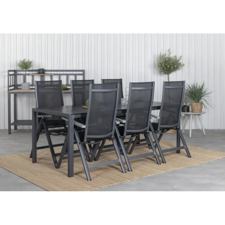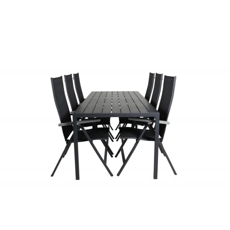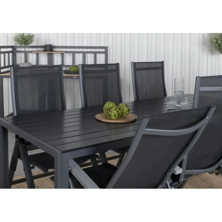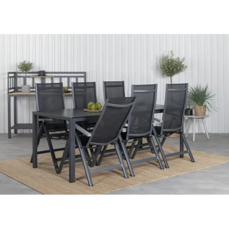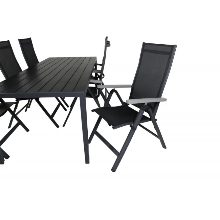 Gør dig klar til sommerens fantastiske udendørsoplevelser med et komfortabelt Loungesæt – Havemøbelsæt i lækker sort farve. Spisebordet Break kombineres perfekt med vores foldbare spisebordsstole fra Albany-serien – juster ryglænet for optimal komfort og bekvemmelighed denne sommer! Aintwood er et holdbart materiale, men vær opmærksom på at det er følsomt over for høje temperaturer. Brug altid bordskånere og beskyt møblerne med et møbelovertræk, når de ikke er i brug.