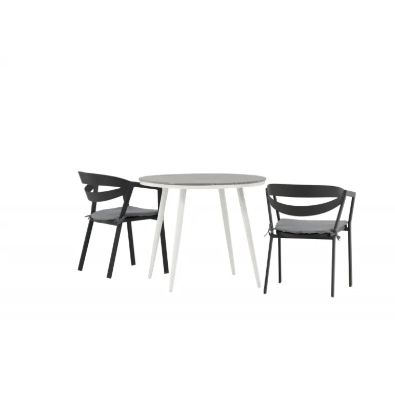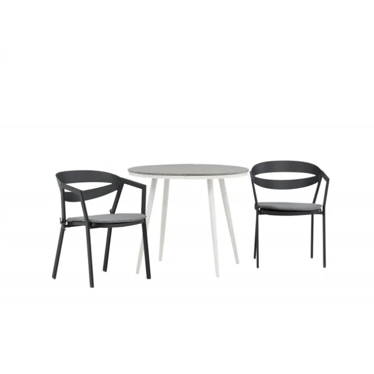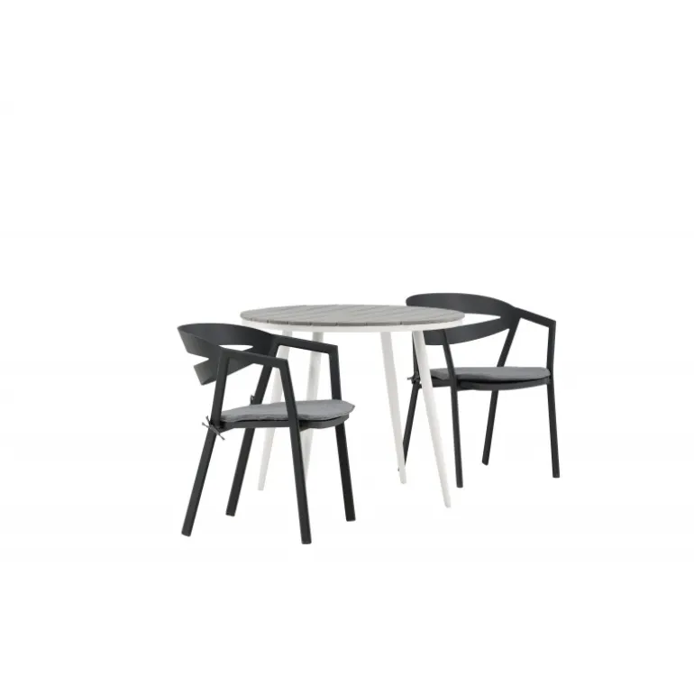 Et indbydende madområde til to, der er garanteret at forlænge hyggelige øjeblikke denne sommer! Break cafébord er det perfekte bord til alle sommerens udendørs morgenmad og eftermiddagskaffe. Bordpladen er i grå Aintwood og de let udadgående ben i hvidt aluminium. Sammen med de trend-sikre spisestole fra serien WORD, der er lige så komfortable som moderne. Stolene har integrerede armlæn i sort aluminium og en grå pude for ekstra komfort. Sid behageligt og nyd hyggelige måltider!