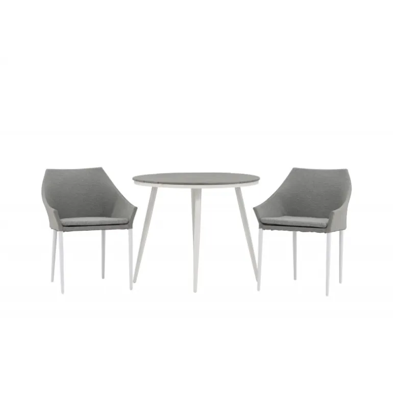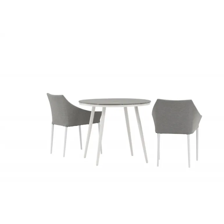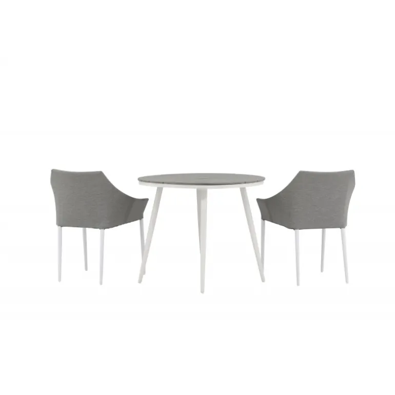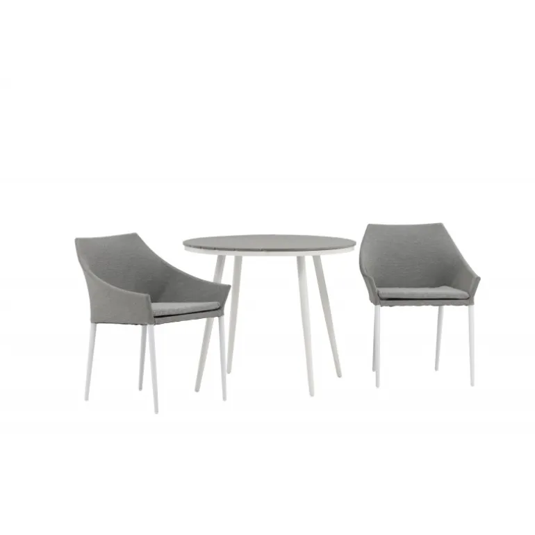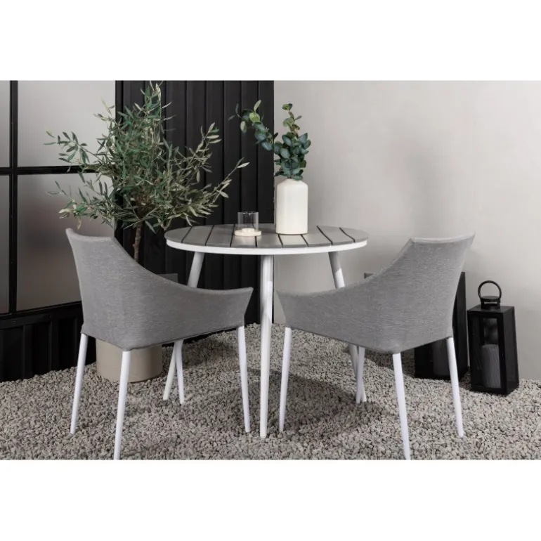 Skab det perfekte kaffested på din terrasse denne sommer! Her kombineres tidløst design med indbydende former i en smuk blikfang. Spisebordet Break har en grå bordplade i grå Aintwood og et klassisk hvidt aluminium understel. Stolene er fra serien Spoga, en stol med fokus på stil og komfort. Den indbydende sæde er let rundet i gråt stof, og benene er i hvidt stål. Nyd din morgenmad eller aftenkaffe og oplev sommerdagene!
