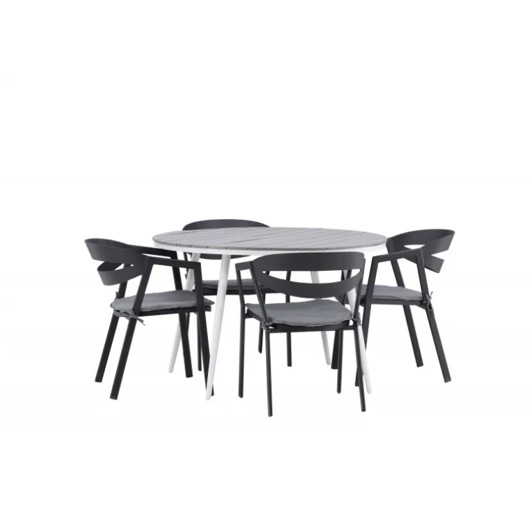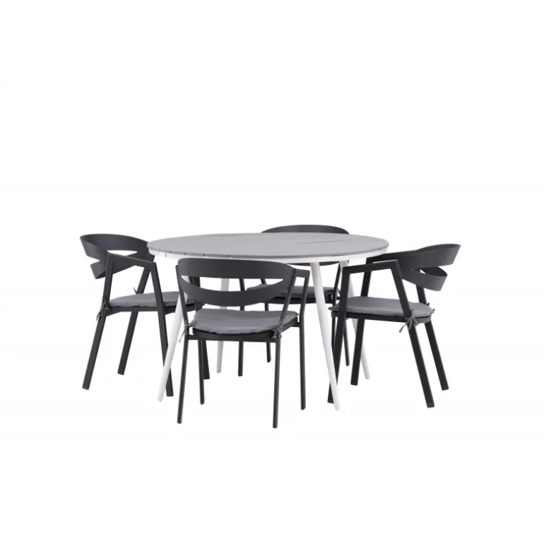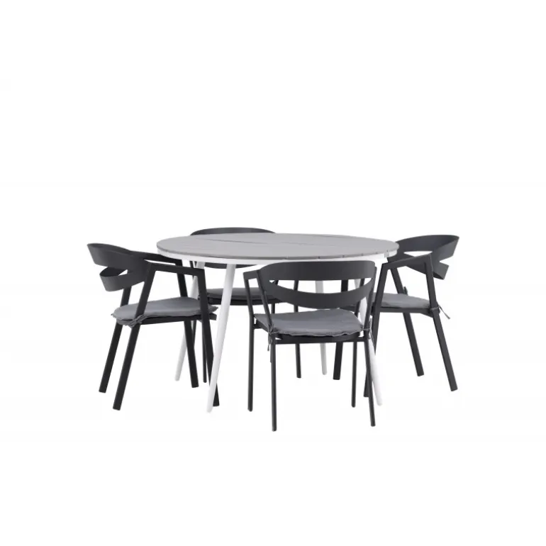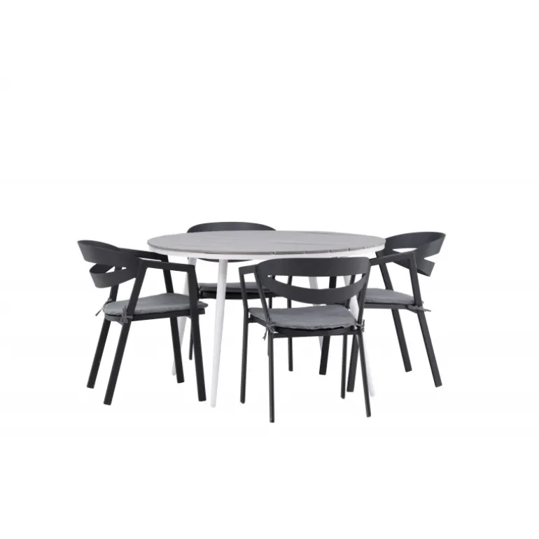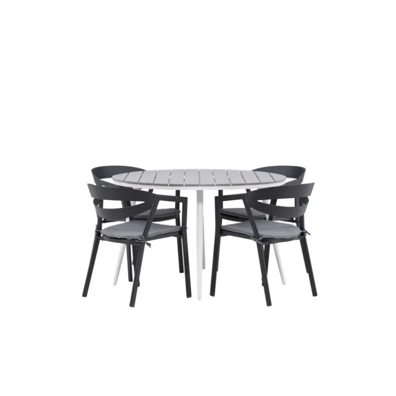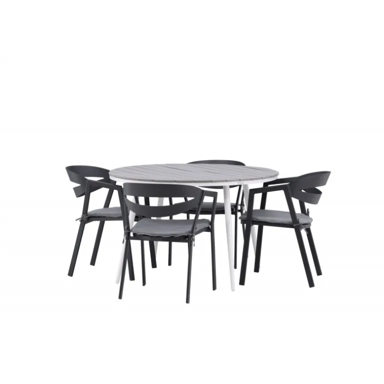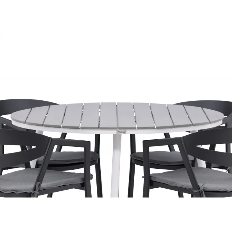 Et rundt Loungesæt – Havemøbelsæt, der kombinerer tidløst design med indbydende former! Spisebordet Break har et klassisk design med en rund bordplade i grå Aintwood og let udadbuede ben i hvid aluminium. Her i perfekt kombination med komfortable spisebordsstole fra serien Slit. Stolene har integrerede armlæn i sort aluminium og en grå pude for ekstra komfort. Skab det perfekte kaffested på din terrasse!