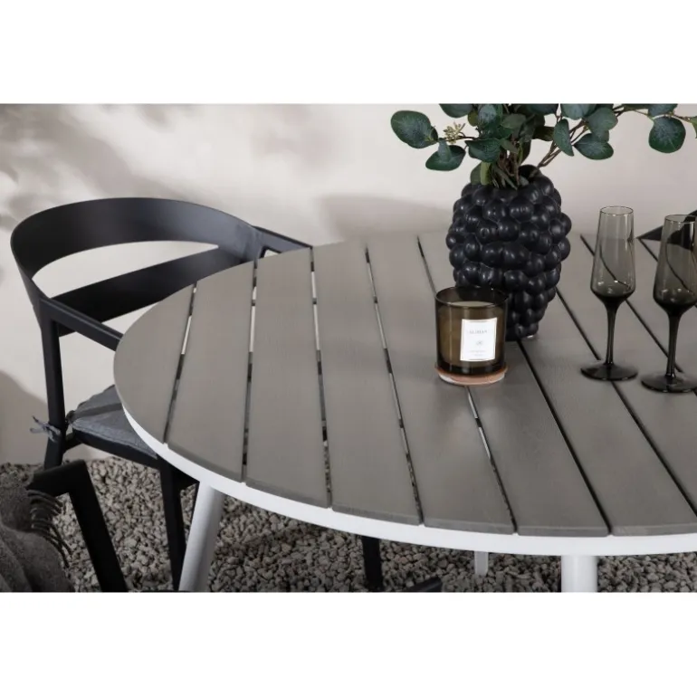 - Tidløst design: Klassisk rundt spisebord med grå Aintwood bordplade.