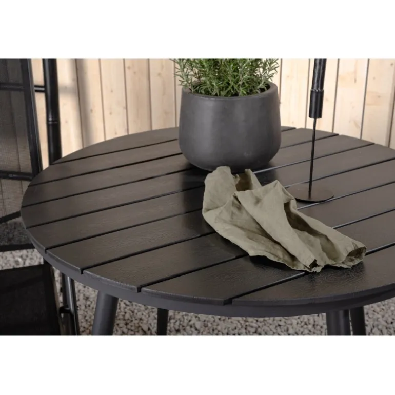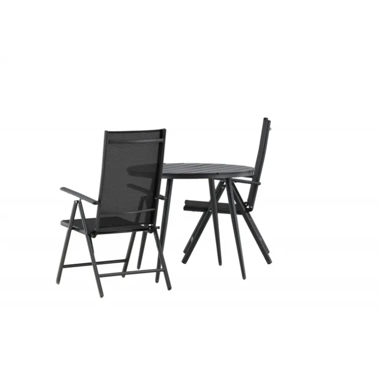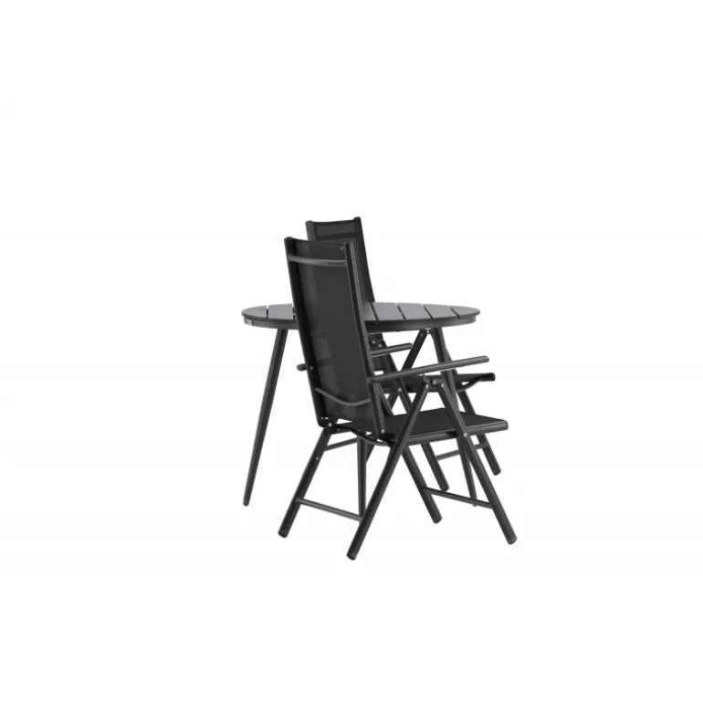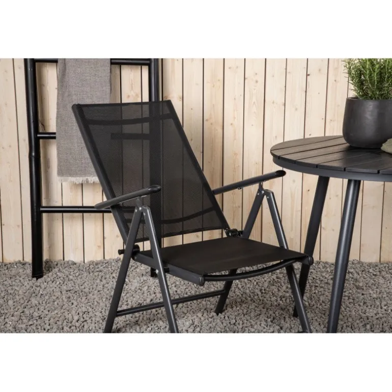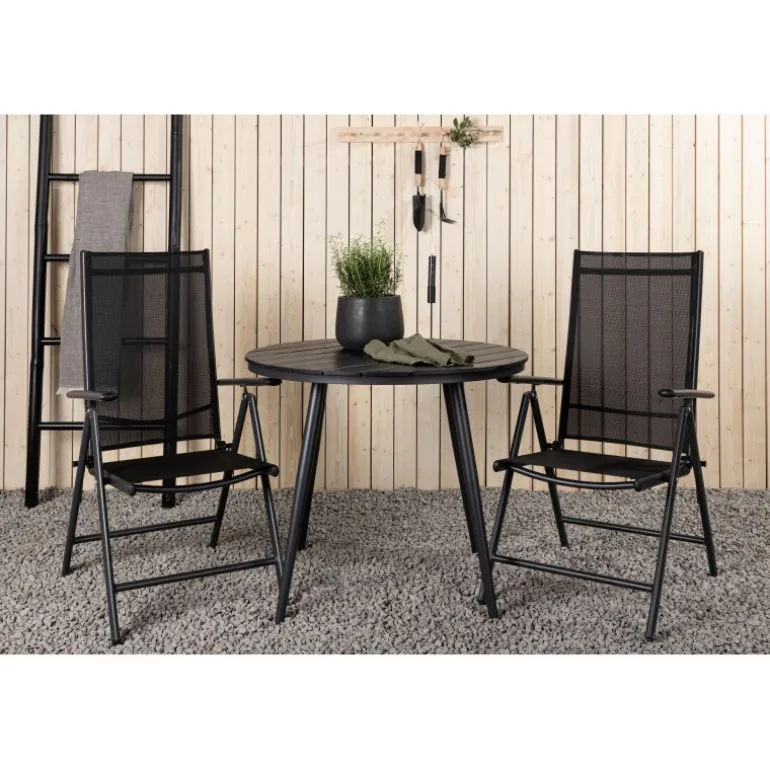 Komfortabelt, indbydende og smukt café-sæt i sort farve fra Break-serien – let at kombinere og tidløst i sit design! Break-bordet har en rund bordplade i Aintwood og et klassisk understel i sort aluminium. Her i perfekt kombination med foldbare spisestole fra samme serie. Ryglænene på stolene i sort tekstil kan justeres for optimal komfort og afslapning omkring spisebordet. Skab det perfekte kaffested på din terrasse!