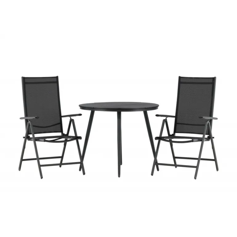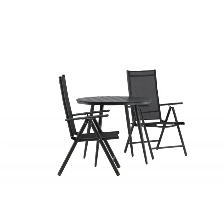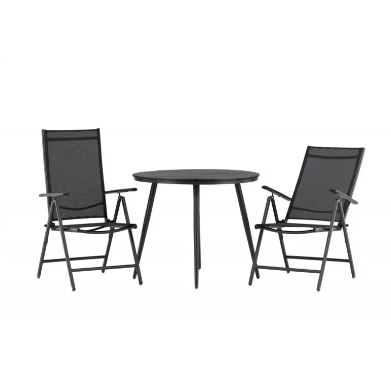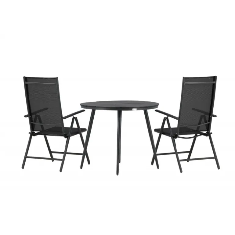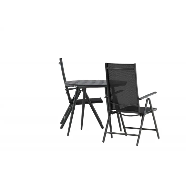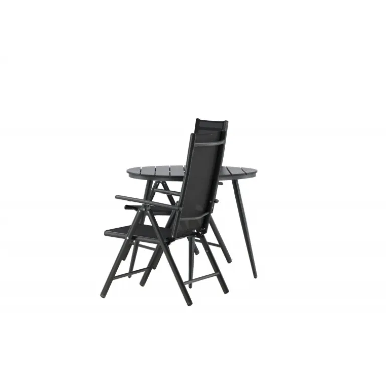 Komfortabelt, indbydende og smukt café-sæt i sort farve fra Break-serien – let at kombinere og tidløst i sit design! Break-bordet har en rund bordplade i Aintwood og et klassisk understel i sort aluminium. Her i perfekt kombination med foldbare spisestole fra samme serie. Ryglænene på stolene i sort tekstil kan justeres for optimal komfort og afslapning omkring spisebordet. Skab det perfekte kaffested på din terrasse!