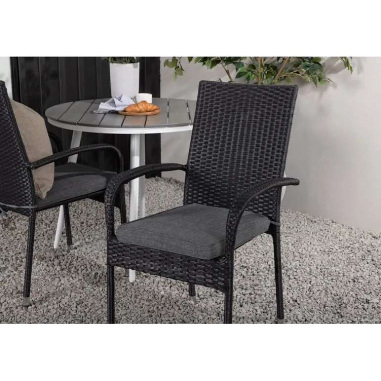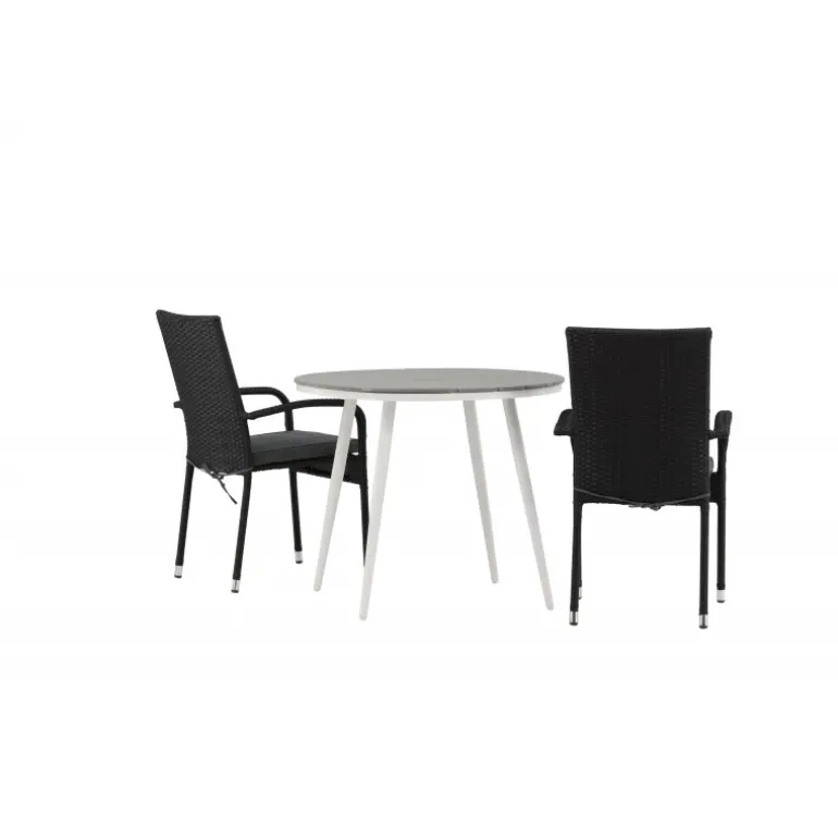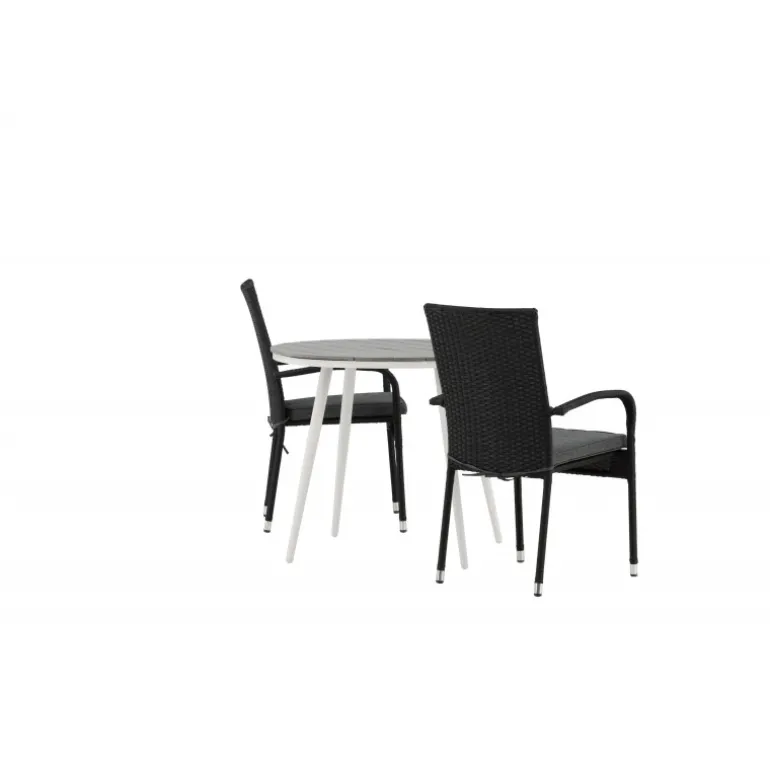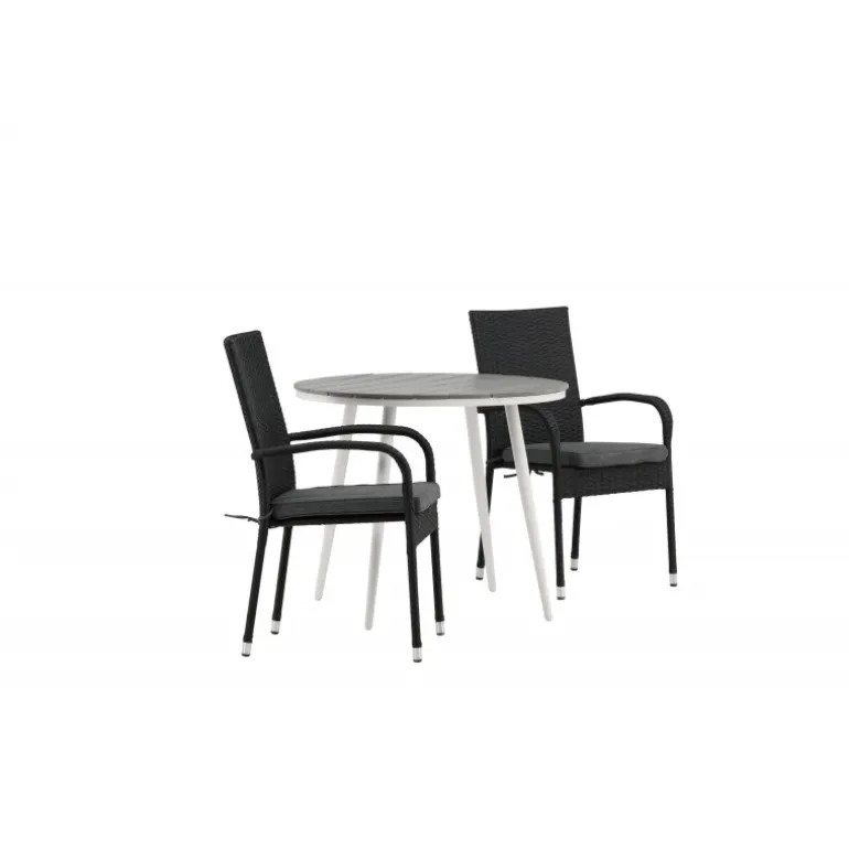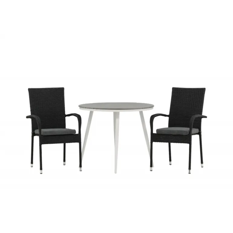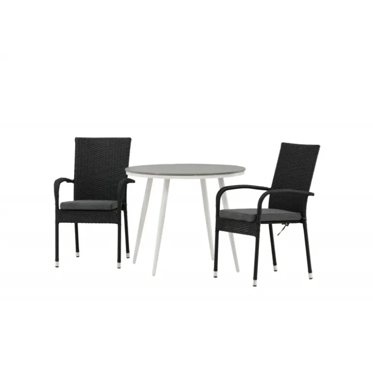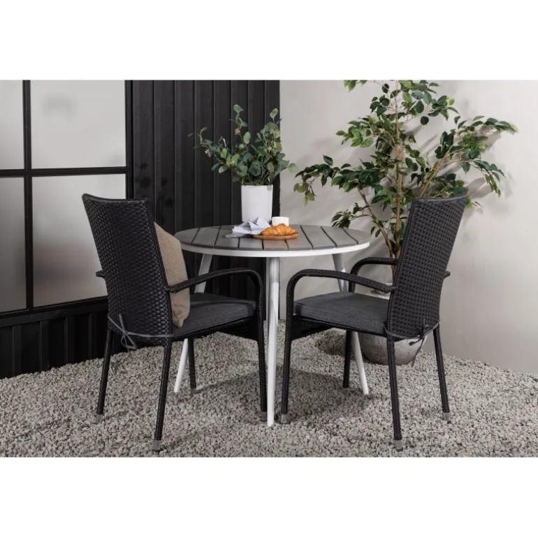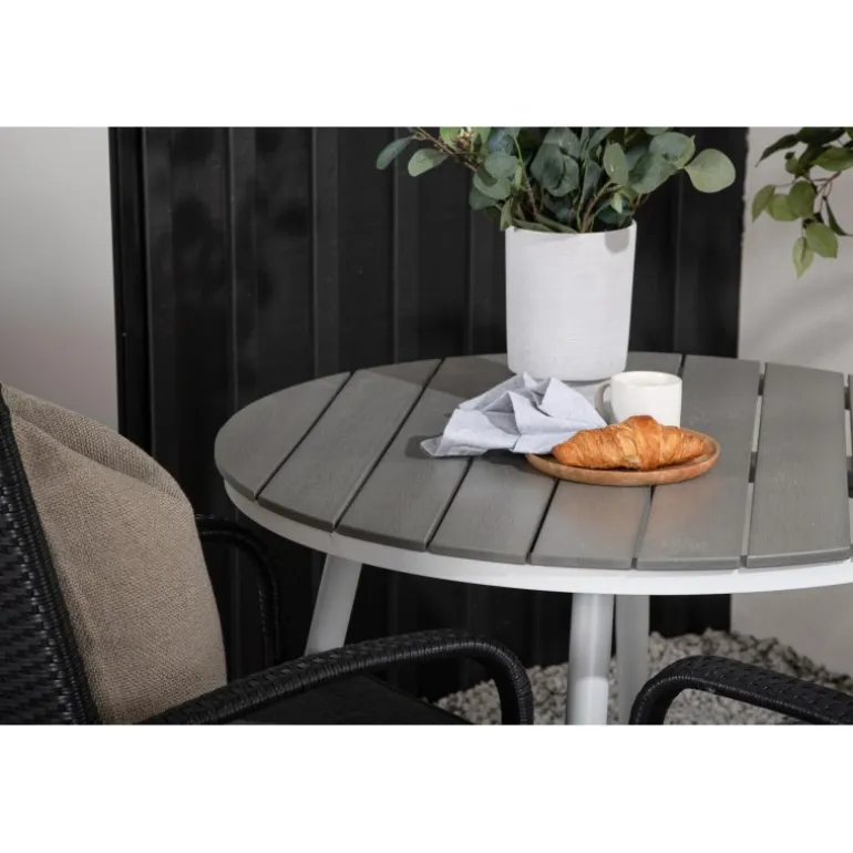Komfortabelt, indbydende og smukt café-sæt i behagelige farver – let at matche og tidløst i design! Break bordet har en rund bordplade i grå Aintwood og et klassisk hvidt aluminiumsstel. Dimensioner: 90ø cm. Her i perfekt kombination med komfortable spisestole fra Anna serien. Stolen er lavet af kunstig rattan, har integrerede armlæn, er stabelbar og kommer i en lækker sort farve, der er nem at matche med andet møblement. Skab det perfekte kaffested på din terrasse!