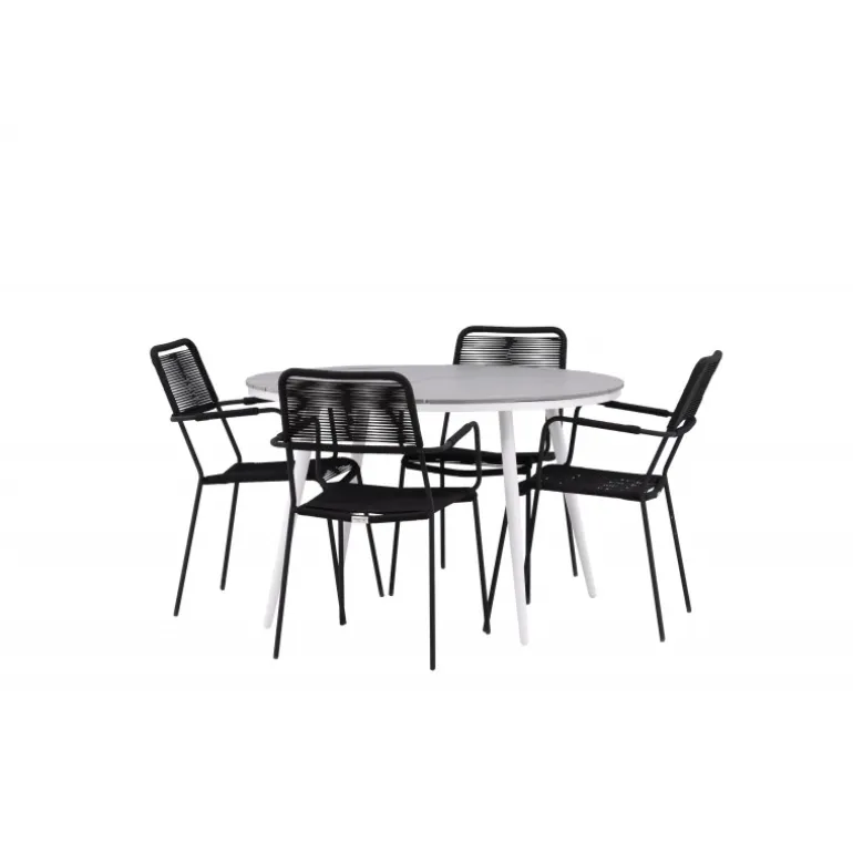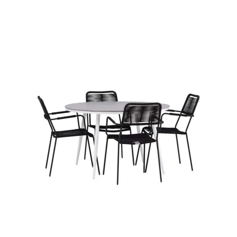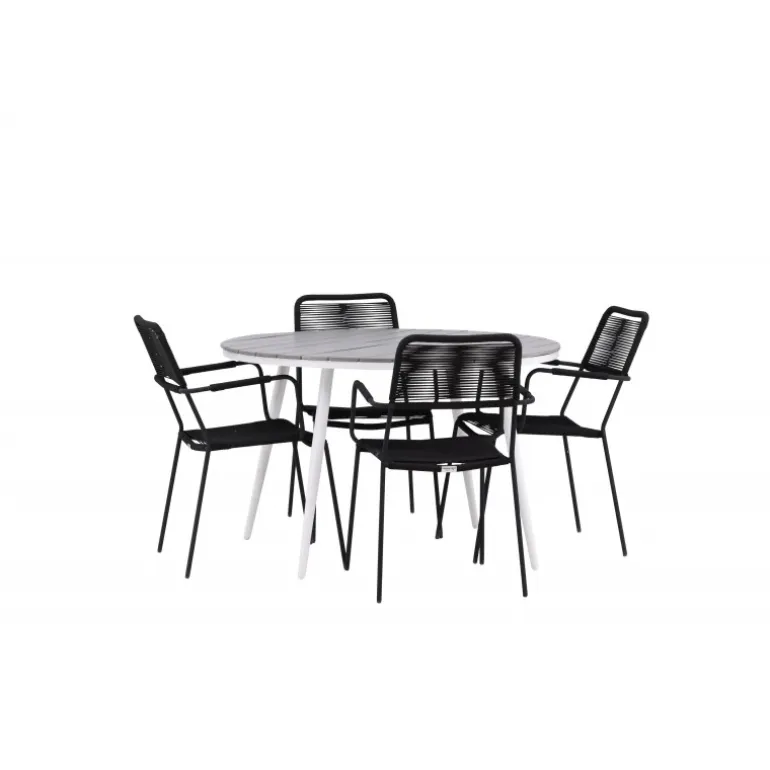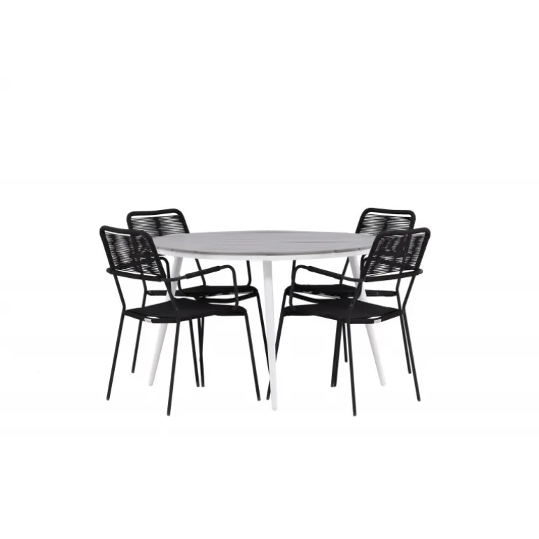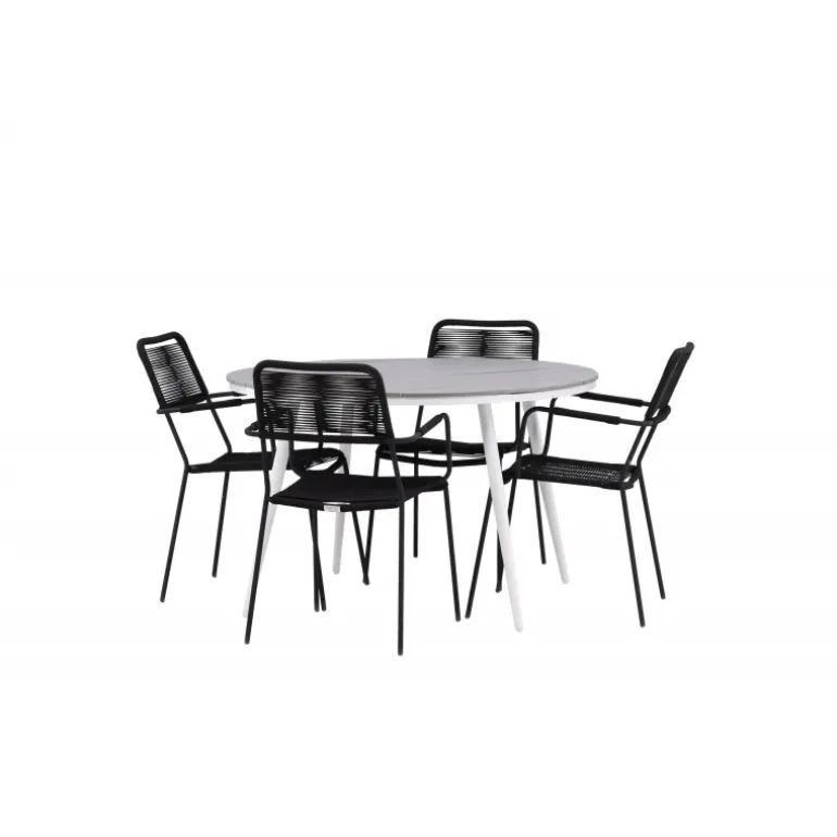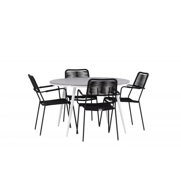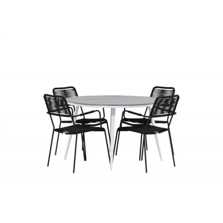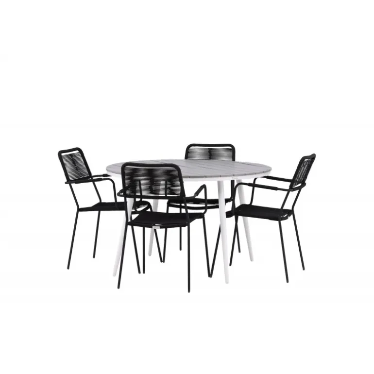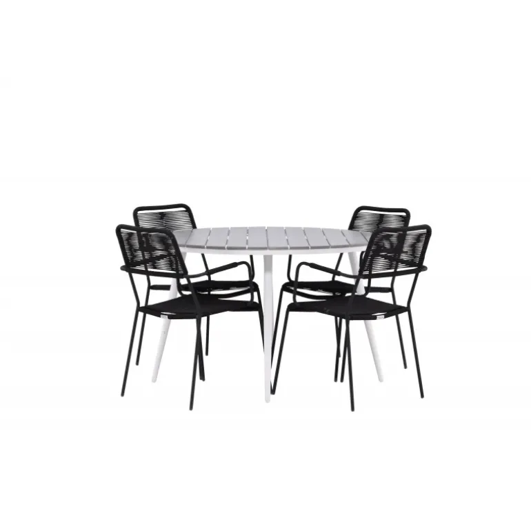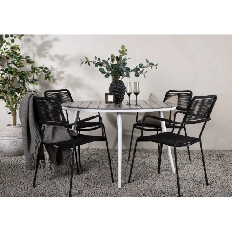 Sid behageligt i en indbydende Loungesæt – Havemøbelsæt, hvor ingen risikerer at sidde på kanten! Spisebordet Break har et klassisk design med en rund bordplade i grå Aintwood og let udfladede ben i hvid aluminium. Dimensioner: 120ø cm. Her i moderne kombination med vores cool spisebordsstole fra Lindos-serien. Stolene har stilfulde smalle ben og integrerede armlæn i sort aluminium og et sæde i holdbart, sort reb. Skab et charmerende sted til alle sommerens lejligheder!